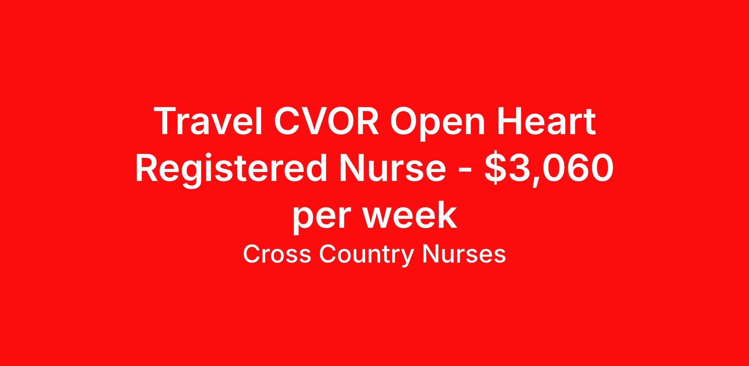 Cross Country Nurses is seeking a travel nurse RN CVOR for a travel nursing job in Reno, Nevada. Job Description & Requirements Specialty: CVOR Discipline: RN Start Date: 03/30/2026 Duration: 13 weeks 40 hours per week Shift: 10 hours, days Employment Type: Travel Job Description As an operating room open heart nurse (RN OR-OH), you will manage the care of patients before, during, and after open-heart surgery. Working primarily within the operating suite, you will be responsible for preparing the patient, handling and preparing operating instruments and equipment, monitoring patient status, and assisting with open-heart surgeries. You'll also provide pre- and post-op education and moral support to patients and their families. Minimum Requirements At least 1 year of recent acute care experience in specialty Active RN license Benefits The benefits of taking a travel nursing job with Cross Country include: Private housing or generous housing allowance Comprehensive health insurance with prescription coverage Dependent health insurance with prescription coverage Competitive salaries Referral bonuses Travel reimbursement 401(k) retirement plan Direct deposit/free checking Unlimited free CE credits Cross Country Job ID 1232143. Pay package is based on 10 hour shifts and 40 hours per week (subject to confirmation) with tax-free stipend amount to be determined. Posted job title: Registered Nurse / Operating Room Open Heart About Cross Country Nurses You care for others — we’re here to care for you. At Cross Country, we know travel nursing is about more than just the job. It’s about building a career that supports your lifestyle, your values, and your impact. We offer competitive pay, full benefits, and 24/7 support from a team that truly understands what it means to be on the front lines. Wherever your journey takes you, we’re with you every step of the way. Let’s build your best life — one assignment at a time. Benefits 401k retirement plan Referral bonus