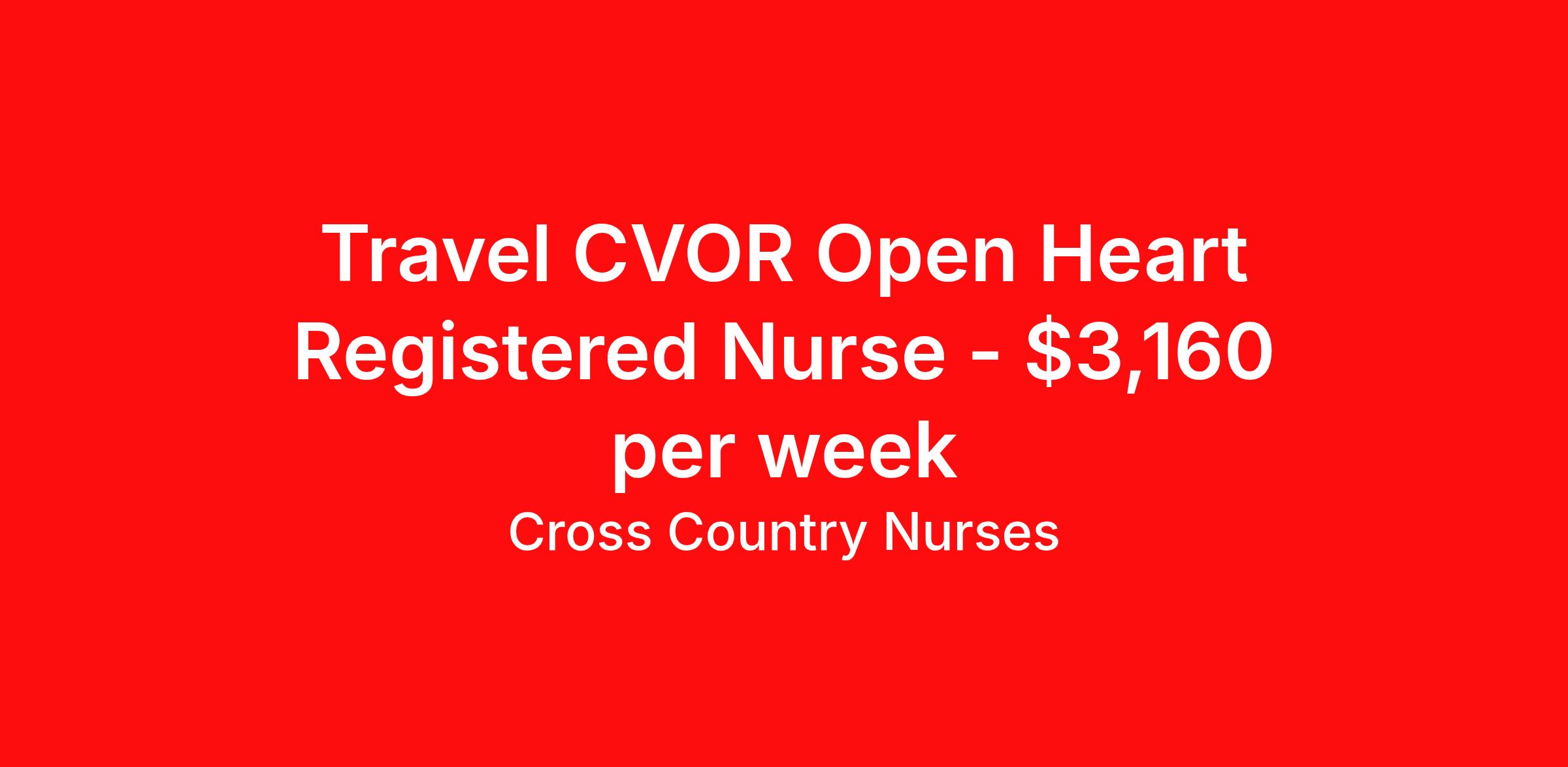 Cross Country Nurses is seeking a travel nurse RN CVOR for a travel nursing job in Schenectady, New York. Job Description & Requirements Specialty: CVOR Discipline: RN Start Date: 05/11/2026 Duration: 13 weeks 40 hours per week Shift: 8 hours, days Employment Type: Travel Job Description As an operating room open heart nurse (RN OR-OH), you will manage the care of patients before, during, and after open-heart surgery. Working primarily within the operating suite, you will be responsible for preparing the patient, handling and preparing operating instruments and equipment, monitoring patient status, and assisting with open-heart surgeries. You'll also provide pre- and post-op education and moral support to patients and their families. Minimum Requirements At least 1 year of recent acute care experience in specialty Active RN license Benefits The benefits of taking a travel nursing job with Cross Country include: Private housing or generous housing allowance Comprehensive health insurance with prescription coverage Dependent health insurance with prescription coverage Competitive salaries Referral bonuses Travel reimbursement 401(k) retirement plan Direct deposit/free checking Unlimited free CE credits Cross Country Job ID 1233496. Pay package is based on 8 hour shifts and 40 hours per week (subject to confirmation) with tax-free stipend amount to be determined. Posted job title: Registered Nurse / Operating Room Open Heart About Cross Country Nurses You care for others — we’re here to care for you. At Cross Country, we know travel nursing is about more than just the job. It’s about building a career that supports your lifestyle, your values, and your impact. We offer competitive pay, full benefits, and 24/7 support from a team that truly understands what it means to be on the front lines. Wherever your journey takes you, we’re with you every step of the way. Let’s build your best life — one assignment at a time. Benefits 401k retirement plan Referral bonus