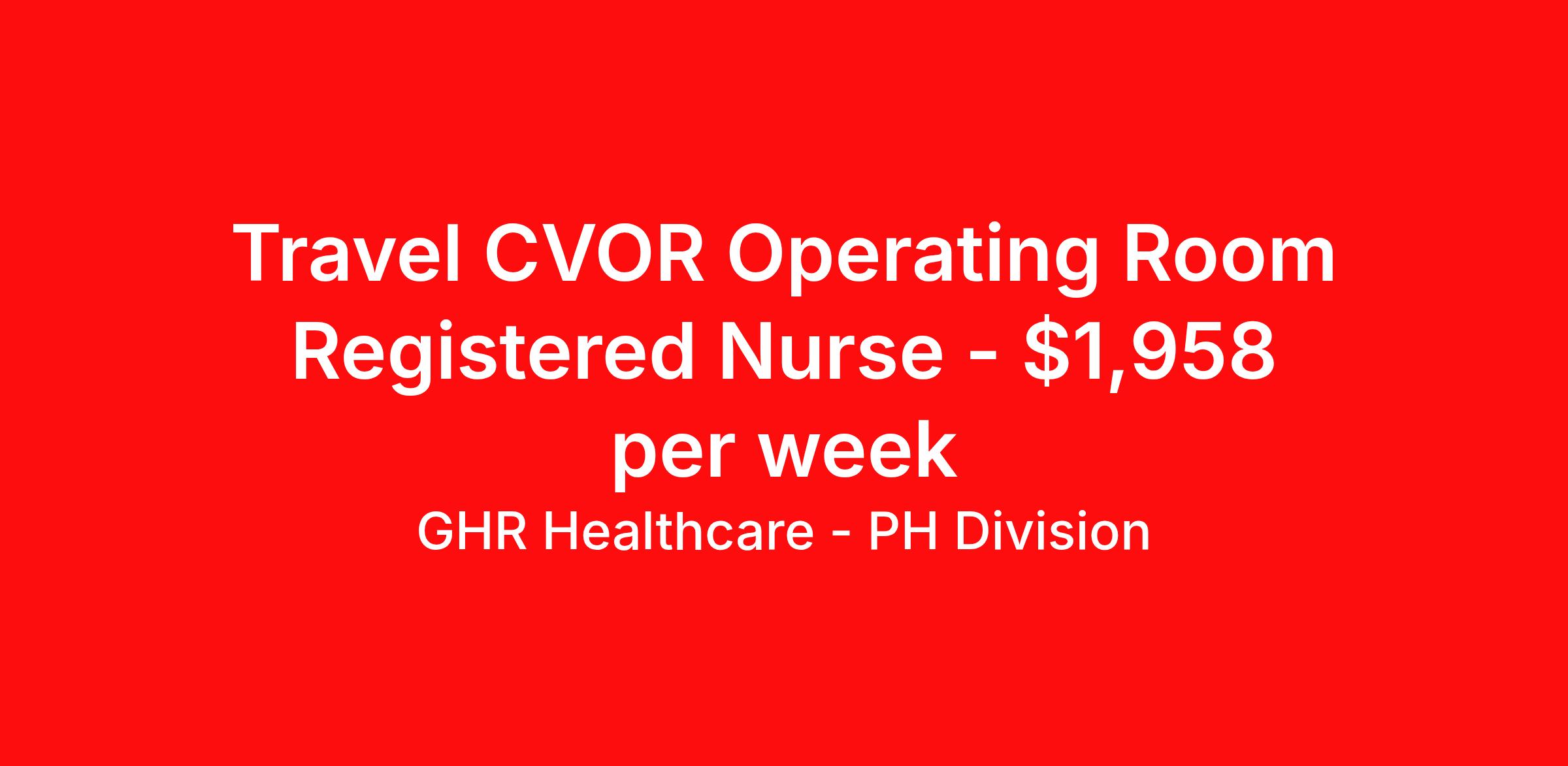 GHR Healthcare - PH Division is seeking a travel nurse RN CVOR for a travel nursing job in Houston, Texas. Job Description & Requirements Specialty: CVOR Discipline: RN Start Date: ASAP Duration: 13 weeks 36 hours per week Shift: 12 hours Employment Type: Travel Planet Healthcare Job ID 74502638. Pay package is based on 12 hour shifts and 36 hours per week (subject to confirmation) with tax-free stipend amount to be determined. About GHR Healthcare - PH Division For over 30 years, GHR Healthcare has been the bridge between healthcare professionals and the facilities that need them nationwide. We're committed to uncovering your ideal fit, supported by GHR's dedication to competitive compensation, transparent communication, and a devoted team that genuinely cares about your career journey. You can trust us to stand by your side as your advocate, confidante, and partner in advancing your career. At GHR, care and consideration are at the heart of everything we do. Visit ghrhealthcare.com to learn more.
