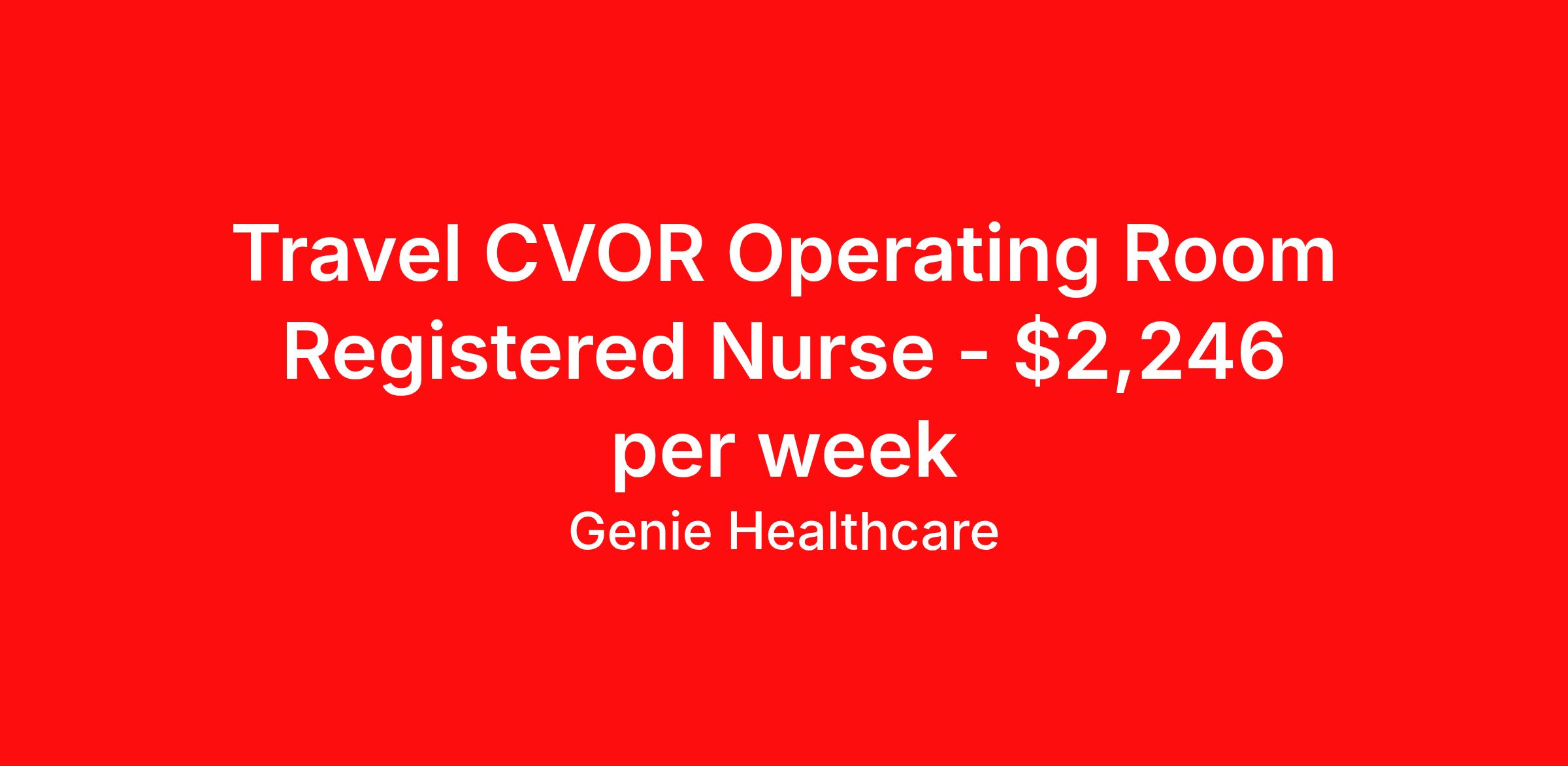 Genie Healthcare is seeking a travel nurse RN CVOR for a travel nursing job in Houston, Texas. Job Description & Requirements Specialty: CVOR Discipline: RN Start Date: 04/13/2026 Duration: 13 weeks 40 hours per week Shift: 10 hours, days Employment Type: Travel Genie Healthcare is looking for a RN to work in CVICU for a 13 weeks travel assignment located in Houston, TX for the Shift (4x10 Days-Please verify shift details with recruiter, 07:00:00-17:00:00, 10.00-4). Pay and benefits packages are estimated based on client bill rate at time the job was posted. These rates are subject to change. Exact pay and benefits vary based on several things, including, but not limited to, guaranteed hours, client changes in bill rate, experience, etc. Benefits: Medical Insurance, Dental Insurance, Vision Insurance, 401(k) with company matching (50% up to 6% of what you contribute) Genie Healthcare Job ID 17525552. Pay package is based on 10 hour shifts and 40.0 hours per week (subject to confirmation) with tax-free stipend amount to be determined. Posted job title: RN:CVICU,07:00:00-17:00:00 About Genie Healthcare Genie Healthcare is one of the fastest growing Nurse Travel Agencies in the USA. Genie serves hundreds of facilities and has over 4000 current travel RN contracts open at any given time. Genie provides travel RN’s flexibility, support, top pay scale, housing and the 1 rated, multi-state health insurance coverage. Genie Healthcare carries with it a commitment to providing a comprehensive level of service and quality care. Growing from a small team of eager recruiters to a company with satisfied clients in nearly every corner of the nation, delivering excellence in patient and customer care is the key to Genie’s success. The management team has 20 years of experience in workforce solutions and staffing in medical and non-medical fields, roles ranging from Clerical job to Cardiologist to software developer to CEO.
