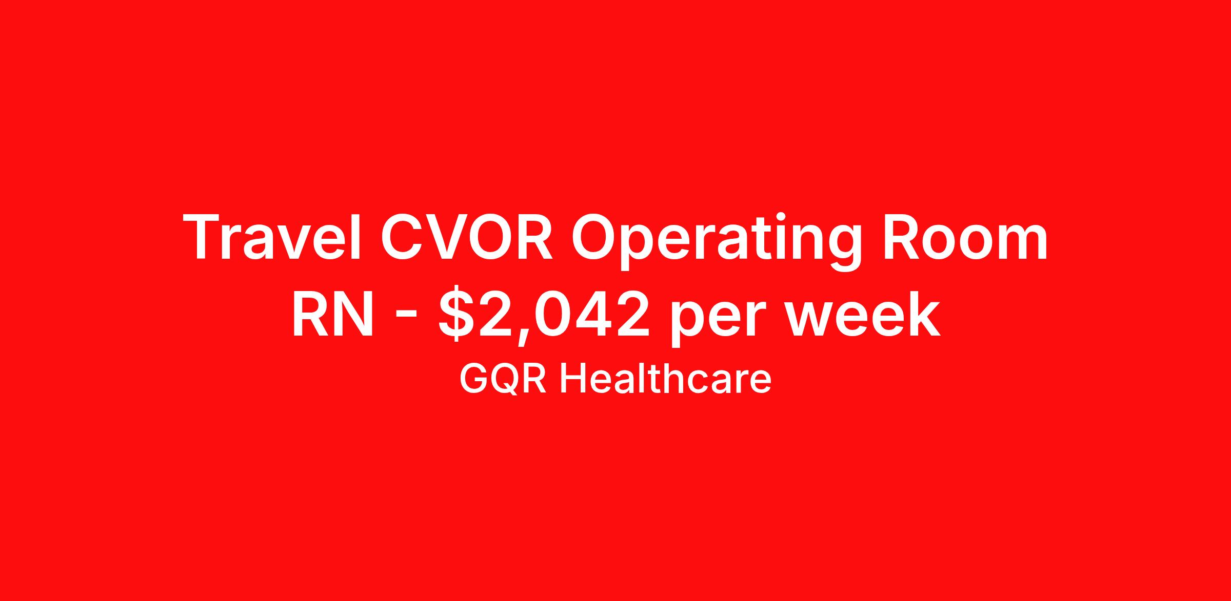 GQR Healthcare is seeking a travel nurse RN CVOR for a travel nursing job in Arlington, Texas. Job Description & Requirements Specialty: CVOR Discipline: RN Start Date: 03/24/2026 Duration: 13 weeks 40 hours per week Shift: 8 hours, days Employment Type: Travel Vascular Surgery RN Job Location: Arlington, TX Profession: Registered Nurse Estimated Pay: $2041.60 Duration (weeks): 13 Specialty: Vascular Surgery Shift Details: Day *Estimated weekly pay includes projected hourly wages and weekly meal and lodging per diems for eligible clinicians based on nationally published GSA rates. Actual weekly pay and per diems may differ from the amount shown and are subject to change during an assignment. Benefits: Day 1 Insurance Cigna medical, MetLife dental and vision insurance License reimbursement for new licenses needed for each assignment Discounts with hotels and rental cars A dedicated recruiter and support team that will help you every step of the way to sure you start on time and have an exceptional experience Referral bonus up to $700 About the Company: Finding the right role is about more than just matching skills to a job—it’s about aligning with your goals, values, and the way you want to work. As an award-winning talent partner, we support healthcare professionals through every step of that process, offering meaningful opportunities, clear guidance, and long-term partnership. From our first conversation to your first day on the job (and beyond!), we’re here to help you move forward with confidence. GQR Job ID 789418. Pay package is based on 8 hour shifts and 40 hours per week (subject to confirmation) with tax-free stipend amount to be determined. Posted job title: Registered Nurse (RN) About GQR Healthcare GQR’s Healthcare team specializes in connecting experts within the industry to highly skilled healthcare professionals across the US market. In the competitive healthcare market, we recognize that the industry’s common goals of improved quality of care and patient outcomes are wholly reliant upon the professionals directly supporting these initiatives. Leveraging our extensive candidate network, we deliver continuity of care for the communities our partners serve to ensure the patient experience is of the highest quality. Through deep market specialization and a unique approach to talent acquisition, GQR Healthcare provides an unparalleled and personalized experience across all medical specialties in nursing and within diverse healthcare platforms across the industry.