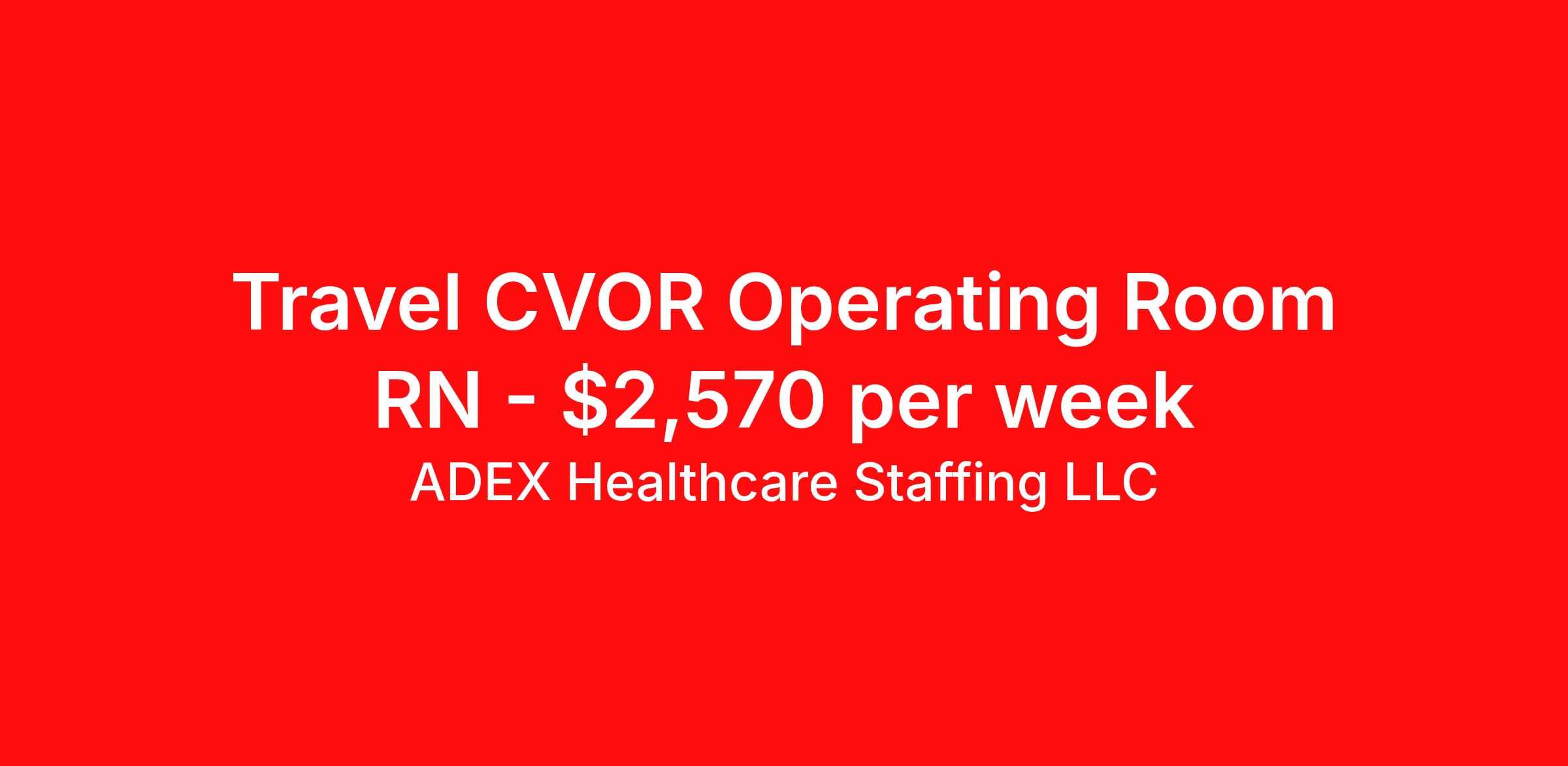 ADEX Healthcare Staffing LLC is seeking a travel nurse RN CVOR for a travel nursing job in Arlington, Texas. Job Description & Requirements Specialty: CVOR Discipline: RN Start Date: 03/24/2026 Duration: 13 weeks 40 hours per week Shift: 8 hours, days Employment Type: Travel RN Position Job Notes: Travel or Local Registered Nurse needed for ASAP start. A minimum of 2 years of recent hospital bedside experience is required. Candidates must be able to start within 5 weeks. Opportunity for extension upon successful completion of the initial assignment. $750 referral bonus available. Opportunity: RN - Cardiovascular Surgery Job Details: • Work in 10-bed operating room unit specializing in cardiovascular surgery • Call requirements: 4-6 shifts per month • Day and night shift positions available • Must complete PeriOp 101 training • Orthopedic and trauma experience required • Must have required certifications • Perform typical cardiovascular surgery procedures • Work with specialized cardiovascular surgery equipment • Follow unit-specific dress code and scrub color requirements • Weekend and call shift requirements as needed Facility: This healthcare facility operates a specialized 10-bed operating room unit focused on cardiovascular surgery services. The facility maintains high standards for surgical care and requires experienced nursing professionals with specific training in perioperative procedures. The organization emphasizes the importance of orthopedic and trauma experience for their cardiovascular surgery team and provides a comprehensive surgical environment with advanced equipment and protocols. Location: Arlington, TX Arlington offers a prime location in the heart of the Dallas-Fort Worth metroplex, providing excellent access to professional opportunities and urban amenities. The city combines the benefits of a major metropolitan area with a strong sense of community, featuring diverse dining, entertainment options, and proximity to major sports venues and cultural attractions. Adex Job ID 988787. Pay package is based on 8 hour shifts and 40 hours per week (subject to confirmation) with tax-free stipend amount to be determined. About ADEX Healthcare Staffing LLC ADEX has been placing healthcare professionals across the US since 2004. Originally founded in Atlanta, GA, the company's headquarters are now located in Tampa, FL. JCAHO certified since 2009. Benefits Referral bonus