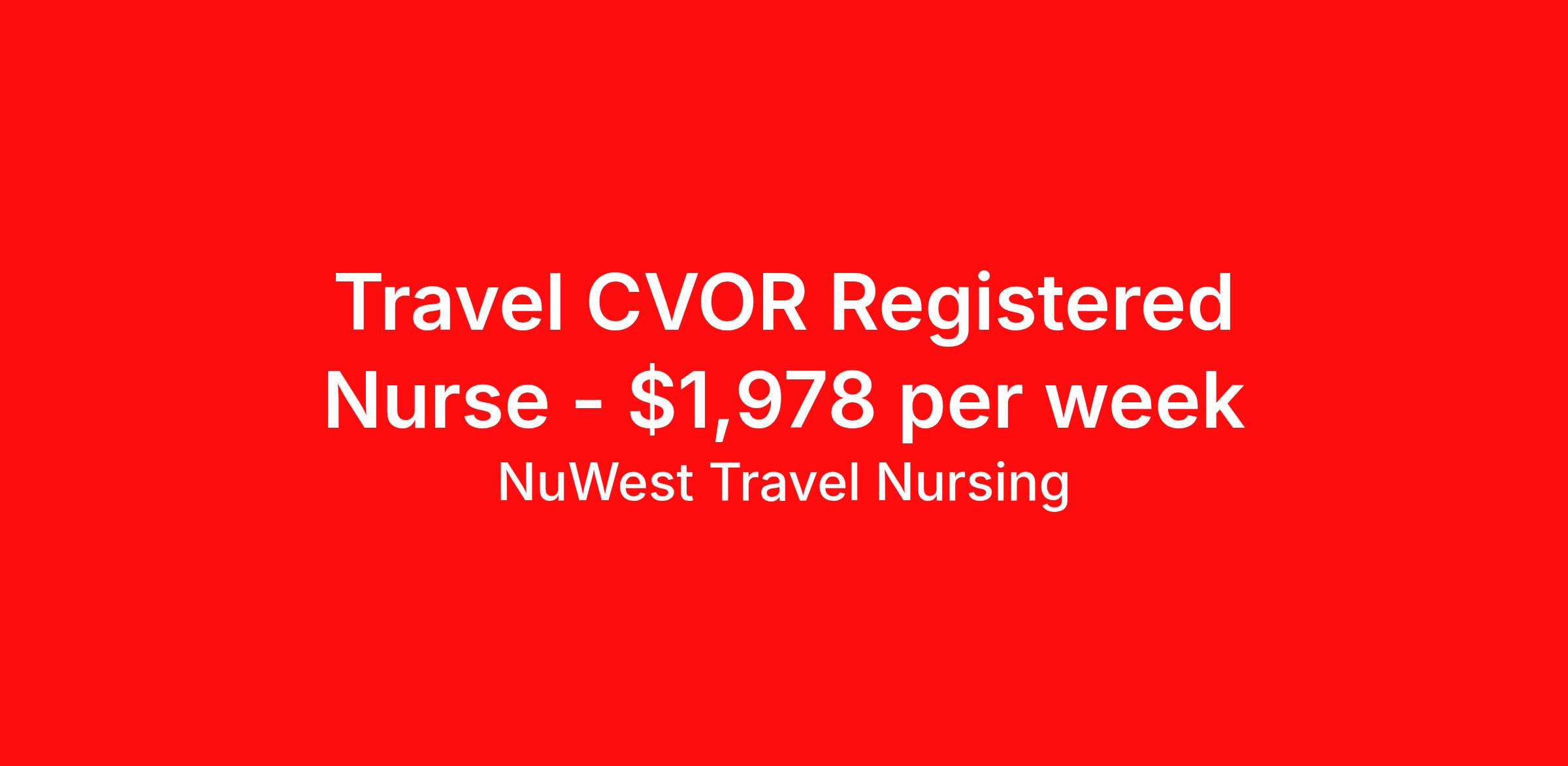 NuWest Travel Nursing is seeking a travel nurse RN CVOR for a travel nursing job in Tucson, Arizona. Job Description & Requirements Specialty: CVOR Discipline: RN Duration: 13 weeks 40 hours per week Shift: 8 hours Employment Type: Travel We have a new assignment for RN - CVOR in Tucson, AZ and are interviewing ASAP. This is a travel assignment, 4x10 Days position at a great facility. Pay Range: $1716.79 - $2019.75 Per Week Benefits include medical, dental, vision, 401K, weekly direct deposit, and more! NuWest Travel Nursing Job ID 242119. Pay package is based on 8 hour shifts and 40 hours per week (subject to confirmation) with tax-free stipend amount to be determined.