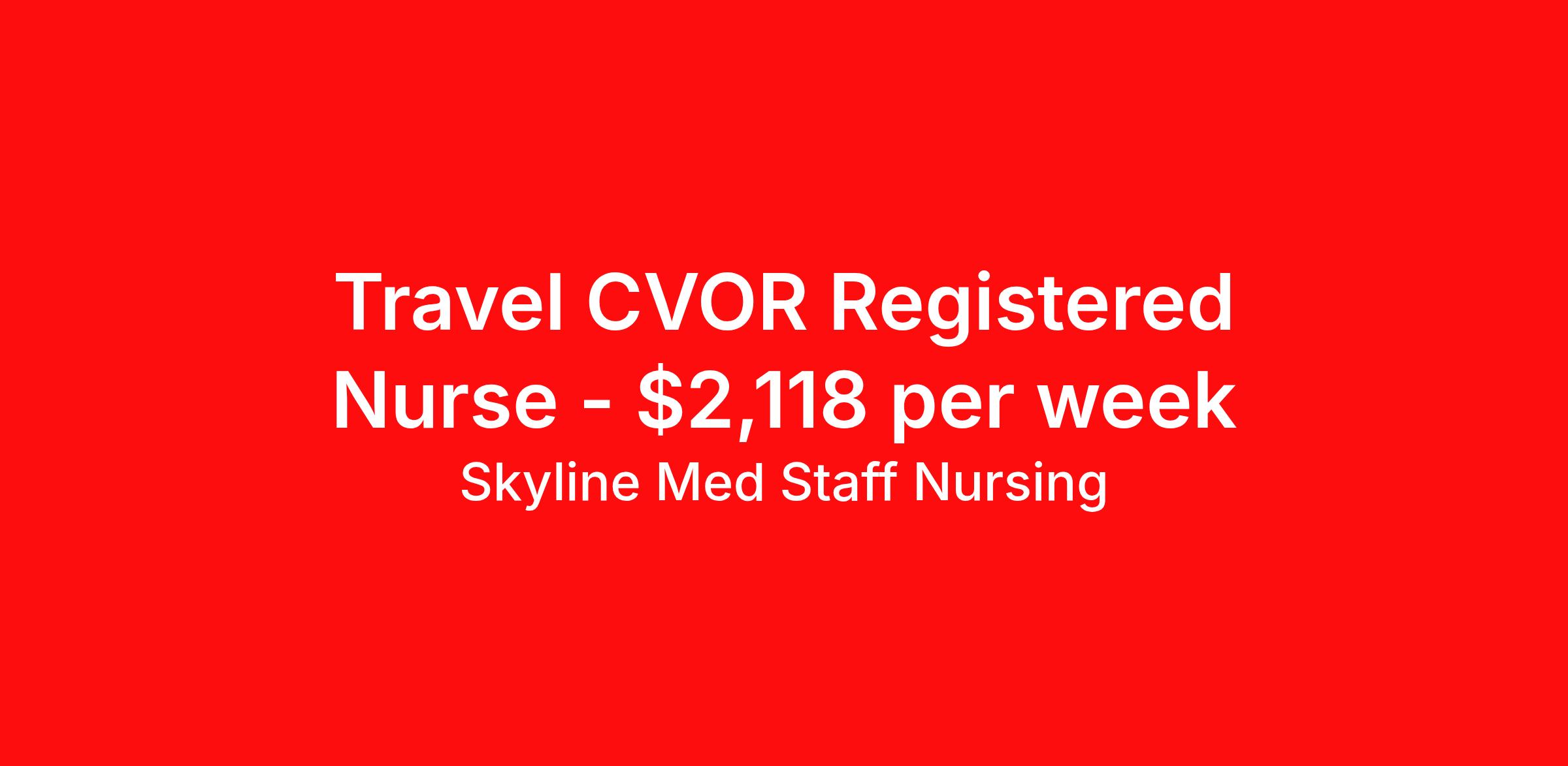 Skyline Med Staff Nursing is seeking a travel nurse RN CVOR for a travel nursing job in Fort Worth, Texas. Job Description & Requirements Specialty: CVOR Discipline: RN Start Date: 03/23/2026 Duration: 13 weeks 36 hours per week Shift: 12 hours, days Employment Type: Travel Weekly amount stated in job postings is an estimate based on estimated hourly wage and potential stipends available for the location of the assignment. Pay package is calculated on bill rate at the time job was posted, but can change or vary without notice. Exact pay packages might vary as this is an estimate. Our recruiter would be happy to build an exact pay package for you for each job. Join the Best in Travel Nursing! Skyline Med Staff was honored as the 1 Best Travel Nursing Company in 2025 by BluePipes, a recognition driven by glowing reviews from travel healthcare professionals. Our recruiters are consistently praised on Google for their responsiveness, dedication, accessibility, and industry knowledge. Ready to experience the difference? Apply for a job today and see why travel nurses choose Skyline! As a traveler with Skyline Med Staff, you'll have a dedicated recruiter supporting you every step of the way and available whenever you need them. We are a Woman Owned Agency providing clinicians with Health Insurance through Blue Cross Blue Shield, along with Dental and Vision coverage, plus $500 referral bonuses! We’re seeking committed Nursing professionals who excel in delivering quality patient care and can adapt to diverse work environments. Required for Submission: 1. Minimum of 1 year recent work experience in the specialty of the job applying for 2. A current BLS/CPR certification through American Heart Association 3. Active License in the state of the job location We look forward to connecting and working with you to find your next job opportunity! Skyline Med Staff Nursing Job ID 36205951. Pay package is based on 12 hour shifts and 36.0 hours per week (subject to confirmation) with tax-free stipend amount to be determined. Posted job title: RN:Cath Lab,07:00:00-19:00:00 About Skyline Med Staff Nursing Join the Top- Rated Travel Healthcare Team! Skyline Med Staff was named as the 1 Best Travel Healthcare Company in 2025 by BluePipes, a recognition driven by glowing reviews from travel healthcare professionals. Our recruiters are consistently praised on Google for their responsiveness, dedication, accessibility, and industry knowledge. Ready to experience the difference? Apply for a job today and see why healthcare professionals choose Skyline! Certified Women Owned Business We believe that travel is good for the soul. We want to be on your journey with you and find the right job that fits you Skyline Med Staff is committed to one vision treating others the way that THEY want to be treated. The executive team at Skyline Med Staff focuses on a commitment to quality, consistency, and the highest level of service. Our team members continually strive to build long term relationships that center on you and helping you achieve your goals. Some of the Benefits you will receive with Skyline Med Staff: Over 30 years of combined experience in the staffing industry Higher Take-Home Pay Rates Dedicated Personal Recruiter We are available to you 24/7 Health Insurance Plan Options Tax Free Per Diems, Housing Stipends and Travel Reimbursements Joint Commission Certified Contracts in all 50 states Referral and Loyalty Bonuses Benefits Medical benefits Referral bonus