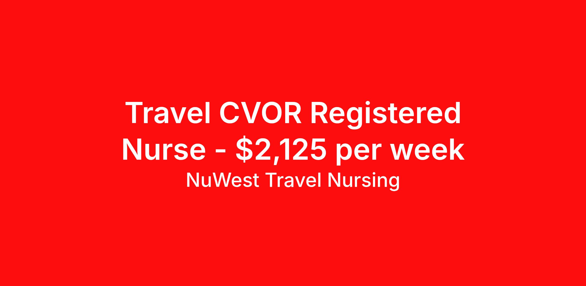 NuWest Travel Nursing is seeking a travel nurse RN CVOR for a travel nursing job in Asheville, North Carolina. Job Description & Requirements Specialty: CVOR Discipline: RN Duration: 13 weeks 36 hours per week Shift: 12 hours Employment Type: Travel We have a new assignment for RN - CVOR in Asheville, NC and are interviewing ASAP. This is a travel assignment, 3x12 Days position at a great facility. Pay Range: $1952.43 - $2296.97 Per Week Benefits include medical, dental, vision, 401K, weekly direct deposit, and more! NuWest Travel Nursing Job ID 239677. Pay package is based on 12 hour shifts and 36 hours per week (subject to confirmation) with tax-free stipend amount to be determined.