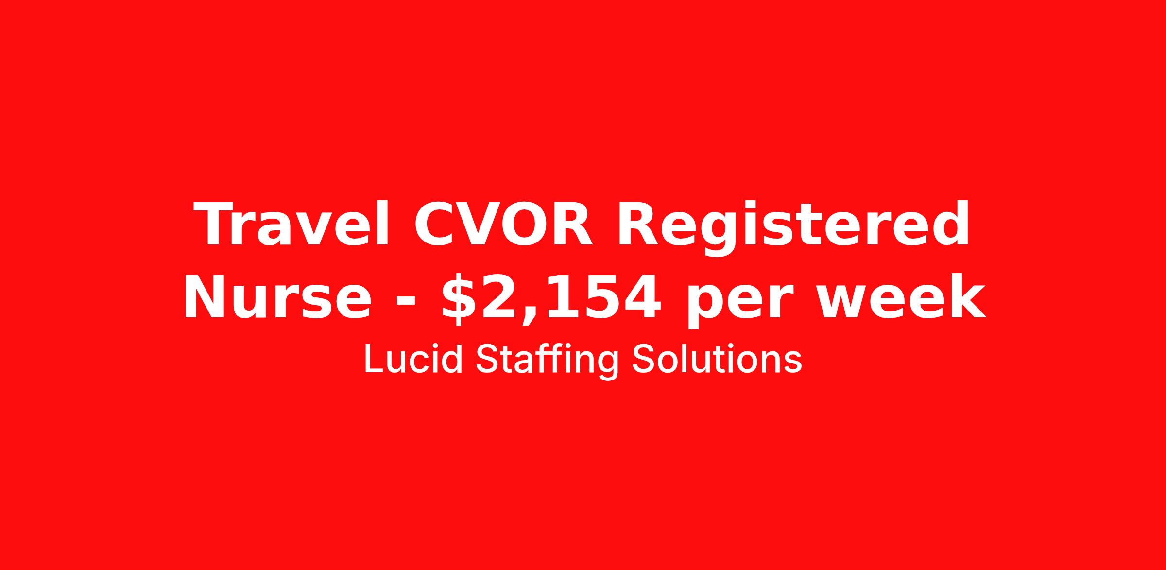 Lucid Staffing Solutions is seeking a travel nurse RN CVOR for a travel nursing job in Nashville, Tennessee. Job Description & Requirements Specialty: CVOR Discipline: RN Duration: 13 weeks 40 hours per week Shift: 8 hours, days Employment Type: Travel Job Description Position: Travel Registered Nurse (RN) with experience in OR Location: Nashville, Tennessee Shift: 10hr Day Weekly Gross: $2154.15 Lucid Staffing Solutions was created by former healthcare workers who lived the short staffing, the chaotic workflows, and the nonstop pressure that comes with patient care. We built an agency powered by real clinical experience, kept simple and supportive, so you never have to guess whether the people guiding you actually know what they’re talking about. Minimum Requirements: Active license as a Registered Nurse (RN) Licensed in Tennessee (If applicable) or compact eligible Two years of recent OR experience Active BLS Why Lucid Works for Travelers Paid Weekly: Stipends pushed to GSA limits whenever possible $500 Travel Reimbursement: Paid at the start of each assignment Clinician-Led Team: Recruiters and Account Managers with real clinical experience In-House Compliance: fast updates, real communication, and none of the delays that come with outsourced vendors. Health Coverage Options: Multiple medical plans plus dental, vision, and workers compensation 401(k) Match: 4 percent match after 6 months License & Certification Reimbursement: We help cover the cost of staying compliant Liability Insurance: Included automatically Referral Bonuses: $500 per referral, $750 after five referrals Ready to start your journey? Apply today to connect with a Clinician-Recruiter! Lucid Staffing Solutions Job ID 39596. Pay package is based on 8 hour shifts and 40 hours per week (subject to confirmation) with tax-free stipend amount to be determined. Posted job title: OR About Lucid Staffing Solutions Clinician Owned & Operated At Lucid Staffing Solutions, we do things differently—because we’ve been in your shoes. Founded by actual healthcare professionals, Lucid was built to fix the issues we experienced as travelers. We know what makes a great assignment: competitive pay, seamless onboarding, honest recruiters, and most importantly—working with a team that truly sees and supports you. Our entire team is made up of former clinicians who understand the demands of the job and what travelers truly need to succeed. We offer some of the highest paying allied health and nursing contracts across the country, along with some amazing benefits & perks. Whether you're chasing freedom, flexible schedules, bigger paychecks, or your next adventure, Lucid helps you get there—with real support, real respect , and real healthcare experts. Benefits Dental benefits Medical benefits Vision benefits