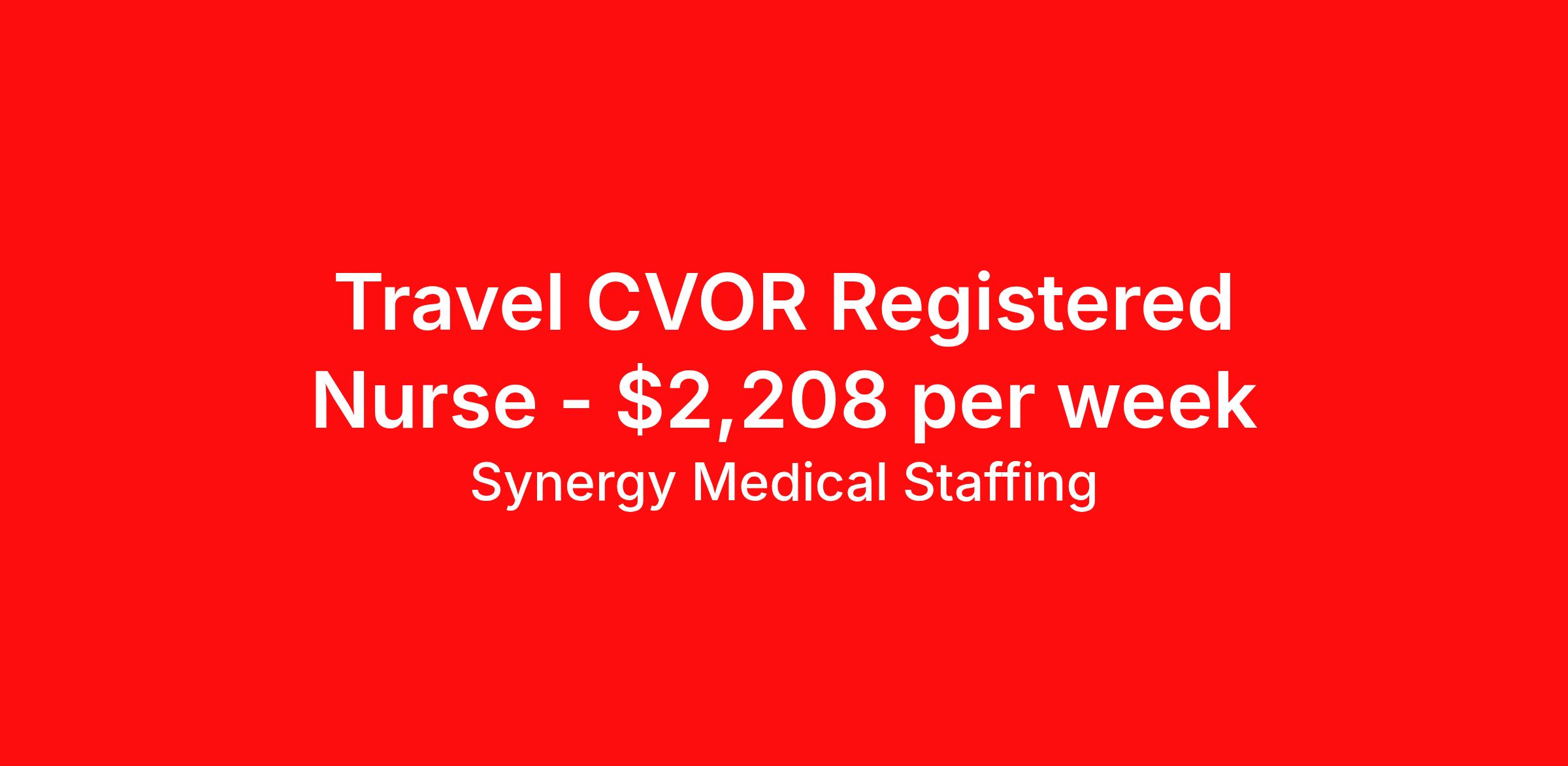 Synergy Medical Staffing is seeking a travel nurse RN CVOR for a travel nursing job in Nashville, Tennessee. Job Description & Requirements Specialty: CVOR Discipline: RN Start Date: 05/18/2026 Duration: 13 weeks 40 hours per week Shift: 10 hours, days Employment Type: Travel Travel, RN - CVOR Location: Nashville, Tennessee Shift: 4x10 Days, 08:00:00-18:00:00, 10.00-4 Duration 13 Weeks When you join Synergy Medical Staffing, you’ll have a dedicated recruiter helping you at all times. Your recruiter is a cross between a career coach and a concierge. They will help you fine-tune your resume, find your next job, and locate an apartment (even one that takes pets!). Make one call and get help with everything from placement to housing to payroll, even travel directions! As a travel, contract and permanent placement medical staffing company with over 20 years of experience in the industry, we understand your needs. Synergy’s Benefits are best in class and include the following: 401K that matches up to 5% of your pay and you are 100% vested from Day 1. Medical, Dental, Vision, Life insurance, Long and short-term disability and others Loyality Program Weekly pay Holiday Pay (varies by Assignment) Guaranteed Hours (varies by Assignment) Referral bonus Continuing Education License and certification reimbursement Synergy Medical Staffing Job ID 36547939. Pay package is based on 10 hour shifts and 40.0 hours per week (subject to confirmation) with tax-free stipend amount to be determined. Posted job title: RN:CVOR,08:00:00-18:00:00 About Synergy Medical Staffing When you join Synergy Medical Staffing, you’ll have a dedicated recruiter helping you at all times. Your recruiter is a cross between a career coach and a concierge. They will help you fine-tune your resume, find your next job, and locate an apartment (even one that takes pets!). Make one call and get help with everything from placement to housing to payroll, even travel directions! As a travel, contract and permanent placement medical staffing company with over 12 years of experience in the industry, we understand your needs. Are you interested in traveling, or just a job around the corner? Whatever your preference, you can be sure there are plenty of Nursing Jobs, Allied Jobs and Physical Therapy Jobs, Occupational Therapy Jobs, Speech Therapy Jobs and Rehab Therapy jobs anywhere you want to go. Synergy Medical Staffing professionals have been in the Medical staffing employment and staffing industry for over 12 years, and have developed solid relationships with numerous healthcare facilities nationwide. Contact us now and expand your medical career with new opportunities from Synergy Medical Staffing. Synergy’s Benefits are best in class and include the following 401K Day 1 Full Medical, Dental, Vision, Life insurance, Long and short term disability and others Student Loan Repayment and CEU reimbursement Loyalty bonus after 600 hours Benefits Discount program Weekly pay Holiday Pay Guaranteed Hours Referral bonus Medical benefits Dental benefits Continuing Education License and certification reimbursement Life insurance 401k retirement plan Cancelation protection Vision benefits
