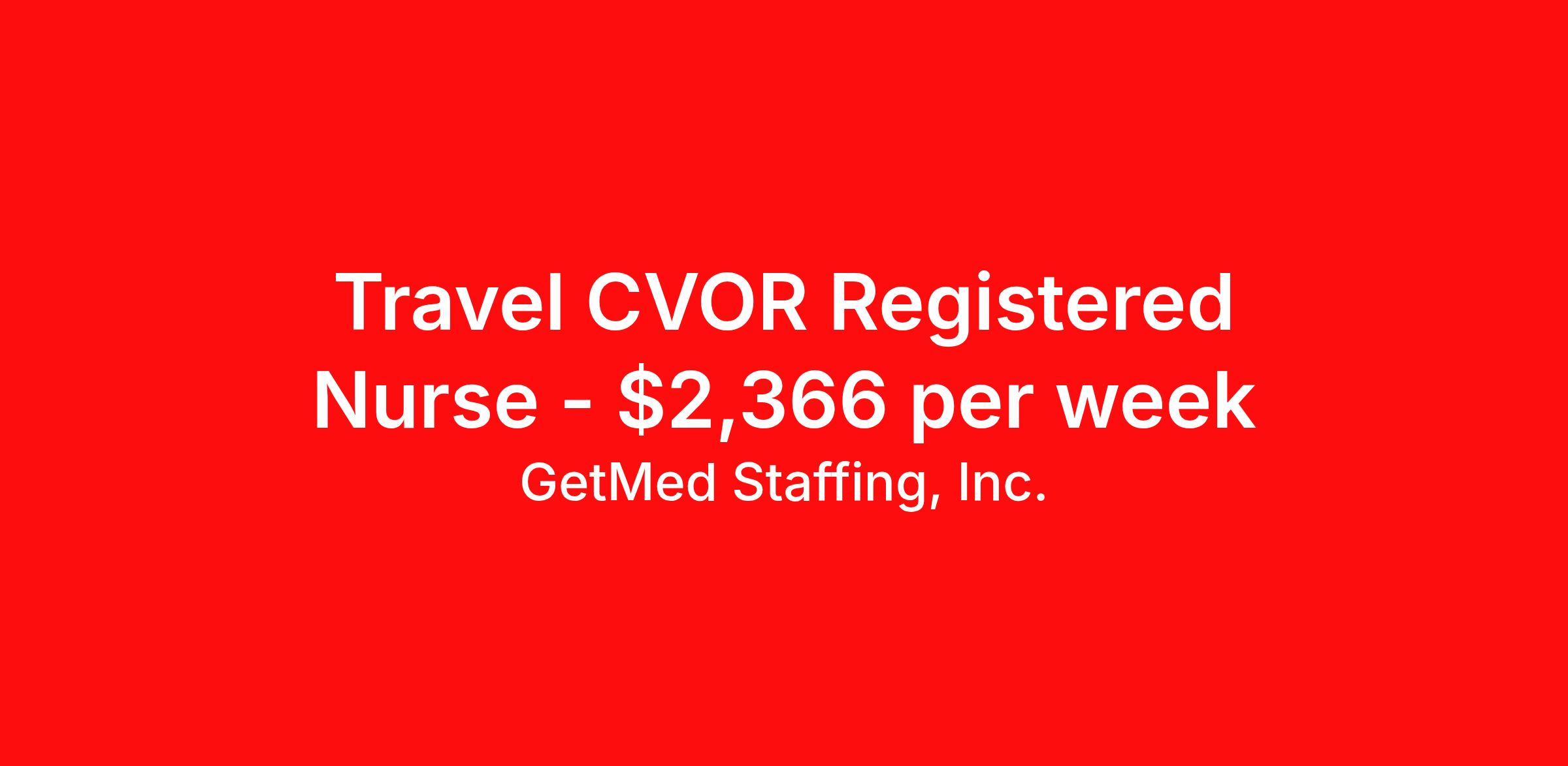 GetMed Staffing, Inc. is seeking a travel nurse RN CVOR for a travel nursing job in Greenville, South Carolina. Job Description & Requirements Specialty: CVOR Discipline: RN Start Date: 04/13/2026 Duration: 13 weeks 40 hours per week Shift: 10 hours, days Employment Type: Travel GetMed Staffing is searching for a strong CVOR RN to assist our traveler-friendly client. A minimum of 1-2 years of experience is required. Traveling with GetMed Staffing offers the unique opportunity to gain diverse experiences, both personally and professionally. Gain experience that matters. GetMed Staffing, Inc. Job ID 35941202. Pay package is based on 10 hour shifts and 40.0 hours per week (subject to confirmation) with tax-free stipend amount to be determined. Posted job title: RN:CVOR,07:00:00-17:00:00 About GetMed Staffing, Inc. We are a diversity owned company, specializing in healthcare recruiting services. We truly understand how important a healthcare travelers' relationship is with their recruiter, as well as our relationship is with our healthcare facilities. We recognize that the needs of our healthcare travelers can vary, and therefore we provide the personalized touch necessary to ensure a successful travel assignment each and every time. Our healthcare facilities and clients benefit from us putting our healthcare travelers first. GetMed Staffing is excited to be a leader within the industry by focusing on providing healthcare travelers with more choices and possibilities as they plan for their next healthcare travel assignment. Benefits Life insurance Medical benefits Dental benefits Vision benefits 401k retirement plan
