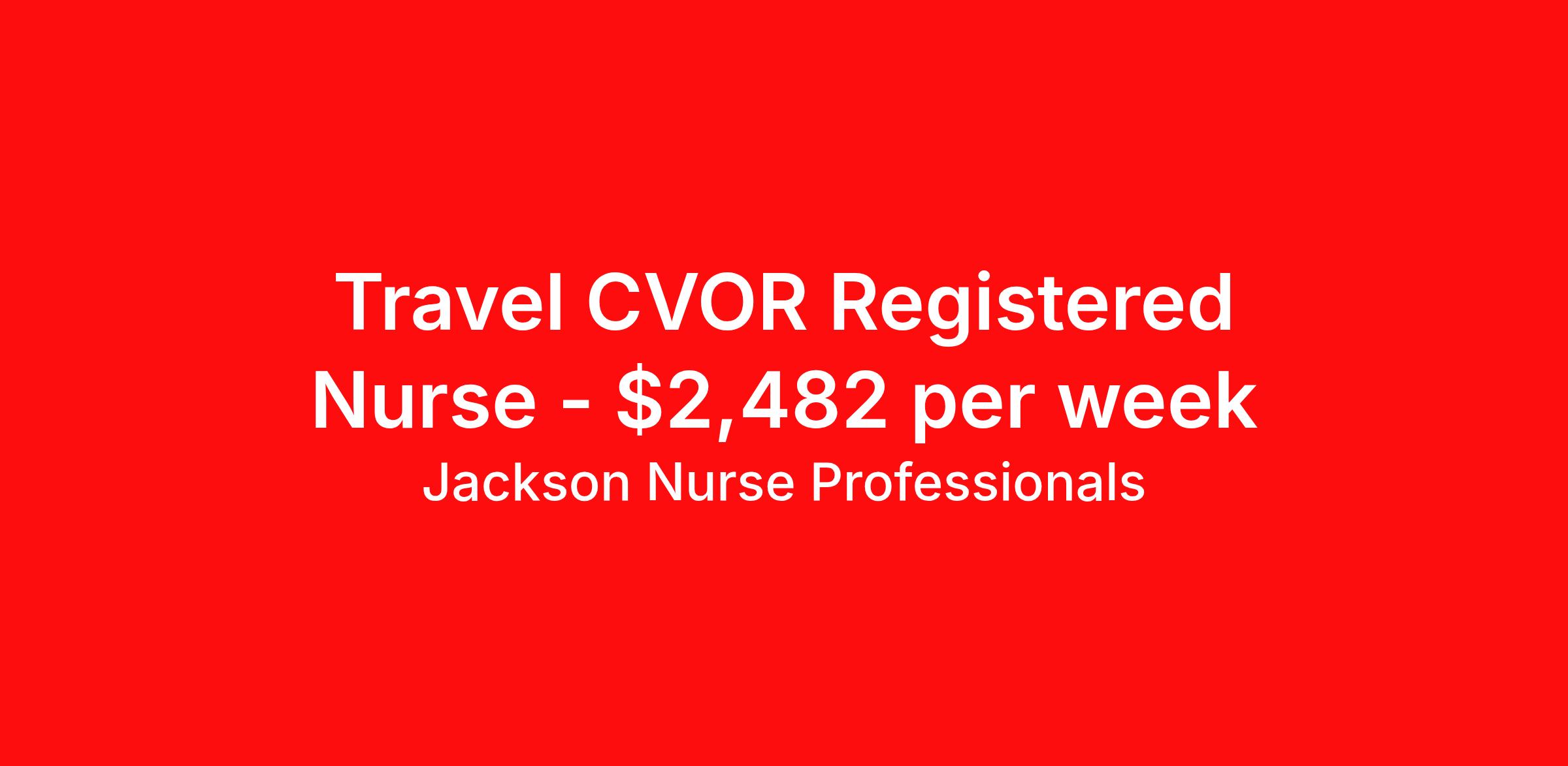 Jackson Nurse Professionals is seeking a travel nurse RN CVOR for a travel nursing job in Weston, Florida. Job Description & Requirements Specialty: CVOR Discipline: RN Start Date: 04/20/2026 Duration: 13 weeks 40 hours per week Shift: 10 hours, days Employment Type: Travel At Jackson Nurse Professionals , we are dedicated to supporting travel nurses and helping you build a fulfilling nursing career. Whether you’re looking for your first or next travel nursing assignment, we specialize in connecting healthcare professionals with leading medical facilities. With a focus on personalized service and a wide range of opportunities, we make it easier than ever for nurses to find the right balance of adventure and professional growth. Qualifications: 2 years of recent experience in area of specialty listed on job Current BLS required (certifications vary by location – job may require ACLS) Valid license and/or certification in state of practice Valid Driver's License Background and drug screen Benefits: Full Medical, Dental and Vision Insurance 401(k) with Employer Match 24/7/365 Support from your Recruiter available by text, phone, or email Referral Bonus Program: Give $200, Get $500 for every referral Same Day Immediate Pay Access Certification & Licensure Reimbursement Apply today to experience the Jackson Nurse Professionals difference! Jackson Nurse Professionals Job ID 2475703. Pay package is based on 10 hour shifts and 40 hours per week (subject to confirmation) with tax-free stipend amount to be determined. About Jackson Nurse Professionals Filling critical needs in patient care, Jackson Nurse Professionals delivers cost-effective travel nurse staffing solutions to over 500 hospitals, outpatient clinics, and home health clients nationwide. Awarded Best of Staffing - Talent and Client 2024, and rated as a Top Workplace 2023 by the Orlando Sentinel, Jackson Nurse Professionals goes the extra mile to provide travel nurses the career they deserve, while providing clients with a large range of highly skilled nurses to fill short, long-term, and temporary assignments. As a member of Jackson Healthcare’s family of award-winning staffing companies, we’re part of a growing community that’s impacting 10 million patients nationwide. Join our mission to improve the delivery of patient care, and the lives of everyone we touch.