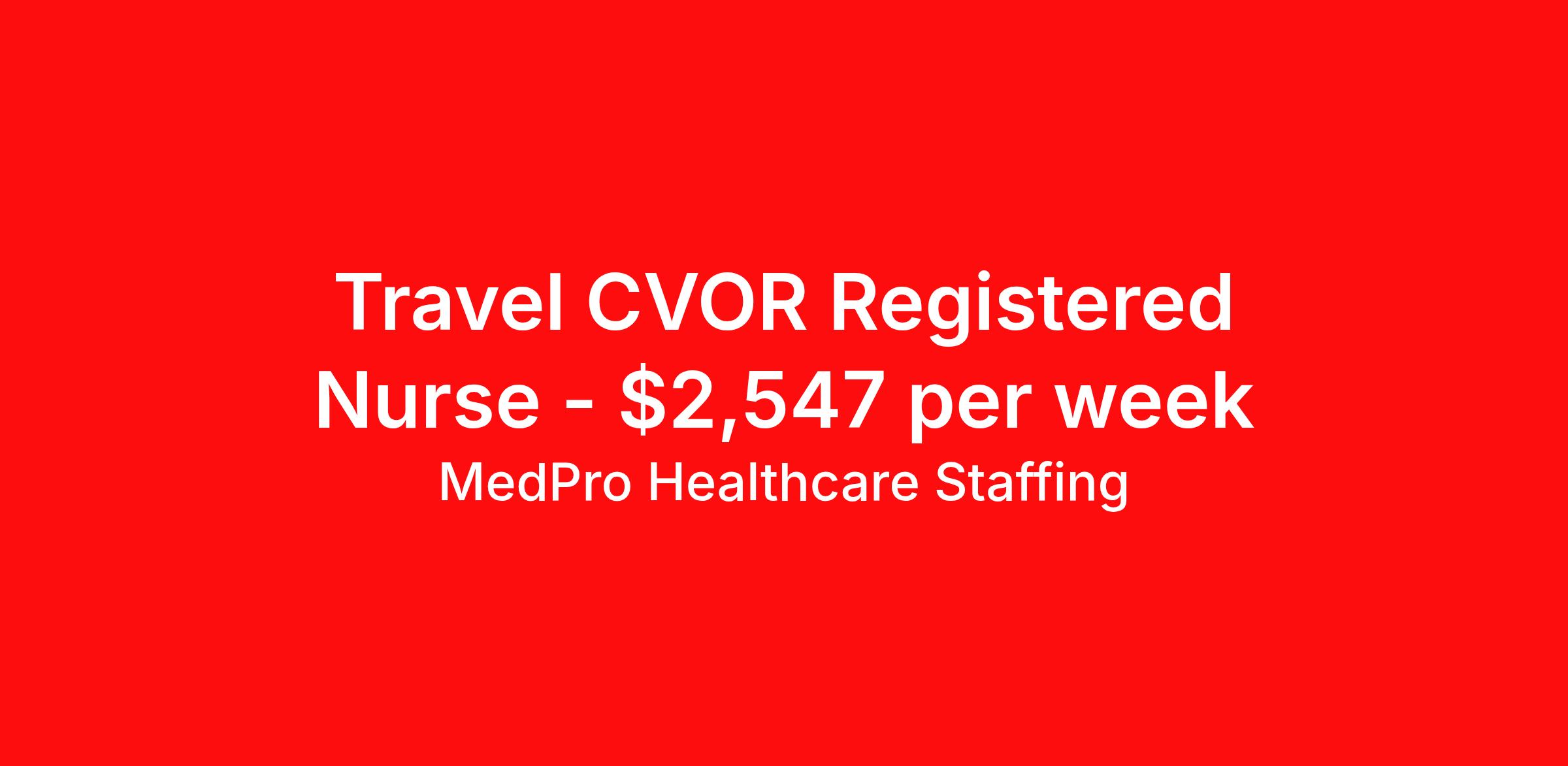 MedPro Healthcare Staffing is seeking a travel nurse RN CVOR for a travel nursing job in Plantation, Florida. Job Description & Requirements Specialty: CVOR Discipline: RN Start Date: 04/06/2026 Duration: 13 weeks 40 hours per week Shift: 10 hours, days Employment Type: Travel MedPro Healthcare Staffing , a Joint Commission-certified staffing agency, is seeking a quality CVOR registered nurse (RN) for a travel assignment with one of our top healthcare clients. Requirements Eighteen months of recent experience in an Acute Care Surgery setting Active RN License Degree from an accredited nursing program BLS & ACLS may be required Benefits Weekly pay and direct deposit Full coverage of all credentialing fees Private housing or housing allowance Group Health insurance for you and your family Company-paid life and disability insurance Travel reimbursement 401(k) matching Unlimited Referral Bonuses up to $1,000 Duties Responsibilities Cardiovascular operating room nurse (CVOR RN) works within the operating room specializing in open heart surgical procedures. Provide surgical patient care by assessing, planning, and implementing the nursing care patients receive before, during and after surgery. Serve as patient educator, circulating nurse and/or scrub nurse. Circulating OR nurses work within the operating suite but outside of the sterile field. Scrub OR nurses handle and prepare operating instruments and equipment within the sterile field. About Agency MedPro Healthcare Staffing is a Joint Commission certified provider of contract staffing services. Since 1983, we have placed nursing and allied travelers in top healthcare facilities nationwide. Join us today for your very own MedPro Experience®. If qualified and interested, please call for immediate consideration. MedPro Staffing is an Equal Opportunity Employer. All applicants will be considered for employment without attention to race, color, religion, national origin, age, sex, disability, marital status or veteran status. Key Words: Registered Nurse, RN, Cardio vascular Operating Room, Open Heart, Scrub, Circulate, OR, Contract Nurse, Travel Nurse, Agency RN, Travel RN, Nursing, Contract *Weekly payment estimates are intended for informational purposes only and include a gross estimate of hourly wages and reimbursements for meal, incidental, and housing expenses. Your recruiter will confirm your eligibility and provide additional details. MedPro Job ID a0Fcx00000FGzdBEAT. Pay package is based on 10 hour shifts and 40 hours per week (subject to confirmation) with tax-free stipend amount to be determined. Posted job title: CVOR Registered Nurse Nursing: CVOR (Scrub). About MedPro Healthcare Staffing At MedPro Healthcare Staffing , we believe no one cares more for caregivers than we do. Our mission is simple: you focus on your patients, and we’ll take care of the rest. As a Joint Commission-certified leader in temporary and contract healthcare staffing since 1983, MedPro has proudly connected nursing and allied travelers with top healthcare facilities across the nation. With thousands of job opportunities available nationwide, we make it easy to find assignments that align with your goals and lifestyle. Our on-staff clinical support team—alongside a compassionate group of experienced recruiters—provides hands-on guidance every step of the way. From Day 1 medical benefits and a 401(k) plan to personalized career support, we’re committed to ensuring every professional we serve feels valued, cared for, and empowered to succeed. Guided by a CEO who is a Registered Nurse, MedPro is built on a foundation of clinical insight and genuine compassion for the caregiving community. Through The MedPro Experience® , we deliver travel assignments that are rewarding, memorable, and designed to help you DREAM big, EXPLORE often, and ACHIEVE greatness. Benefits Day 1 medical, dental, and vision benefits for you and your family Weekly pay and direct deposit Unlimited Referral Bonuses starting at $500 On Staff Clinical Support Team Access to nationwide travel assignments MPX Mobile app -24/7 real-time access to jobs, credentials, assignment details, and more Full coverage of all credentialing fees Private housing or housing allowance Tax Free Per Diems, Housing Stipends and Travel Reimbursements Company-paid life and disability insurance Travel reimbursement 401(k) matching Benefits Weekly pay Referral bonus Employee assistance programs