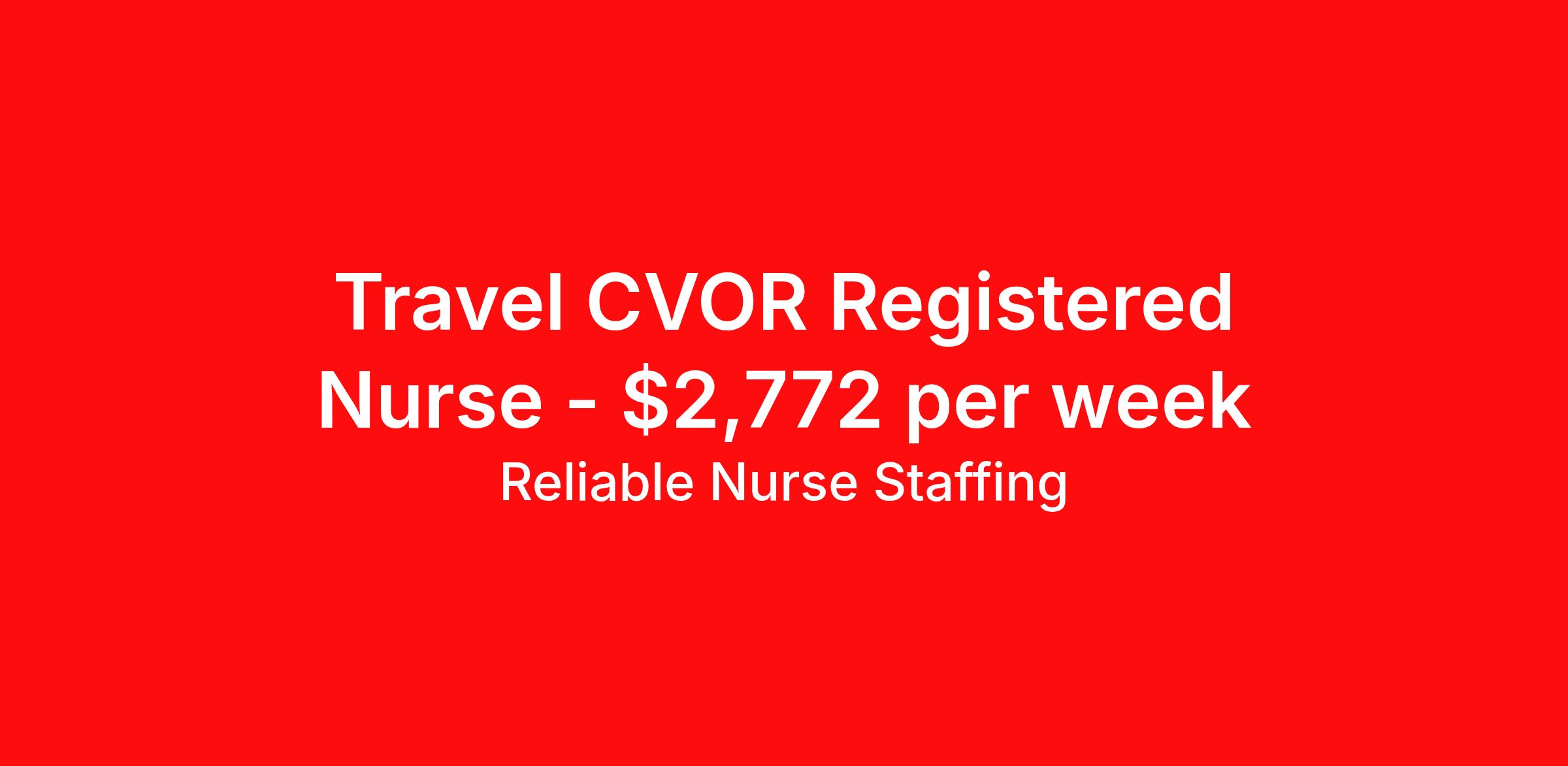 Reliable Nurse Staffing is seeking a travel nurse RN CVOR for a travel nursing job in Greenville, South Carolina. Job Description & Requirements Specialty: CVOR Discipline: RN Start Date: 04/13/2026 Duration: 13 weeks 40 hours per week Shift: 10 hours, days Employment Type: Travel Reliable Nurse Staffing Job ID 59899212. Pay package is based on 10 hour shifts and 40 hours per week (subject to confirmation) with tax-free stipend amount to be determined. About Reliable Nurse Staffing Providing reliable, competent, and compassionate care to our patients and clients. Benefits Weekly pay Holiday Pay Guaranteed Hours Referral bonus Medical benefits Dental benefits Vision benefits Life insurance
