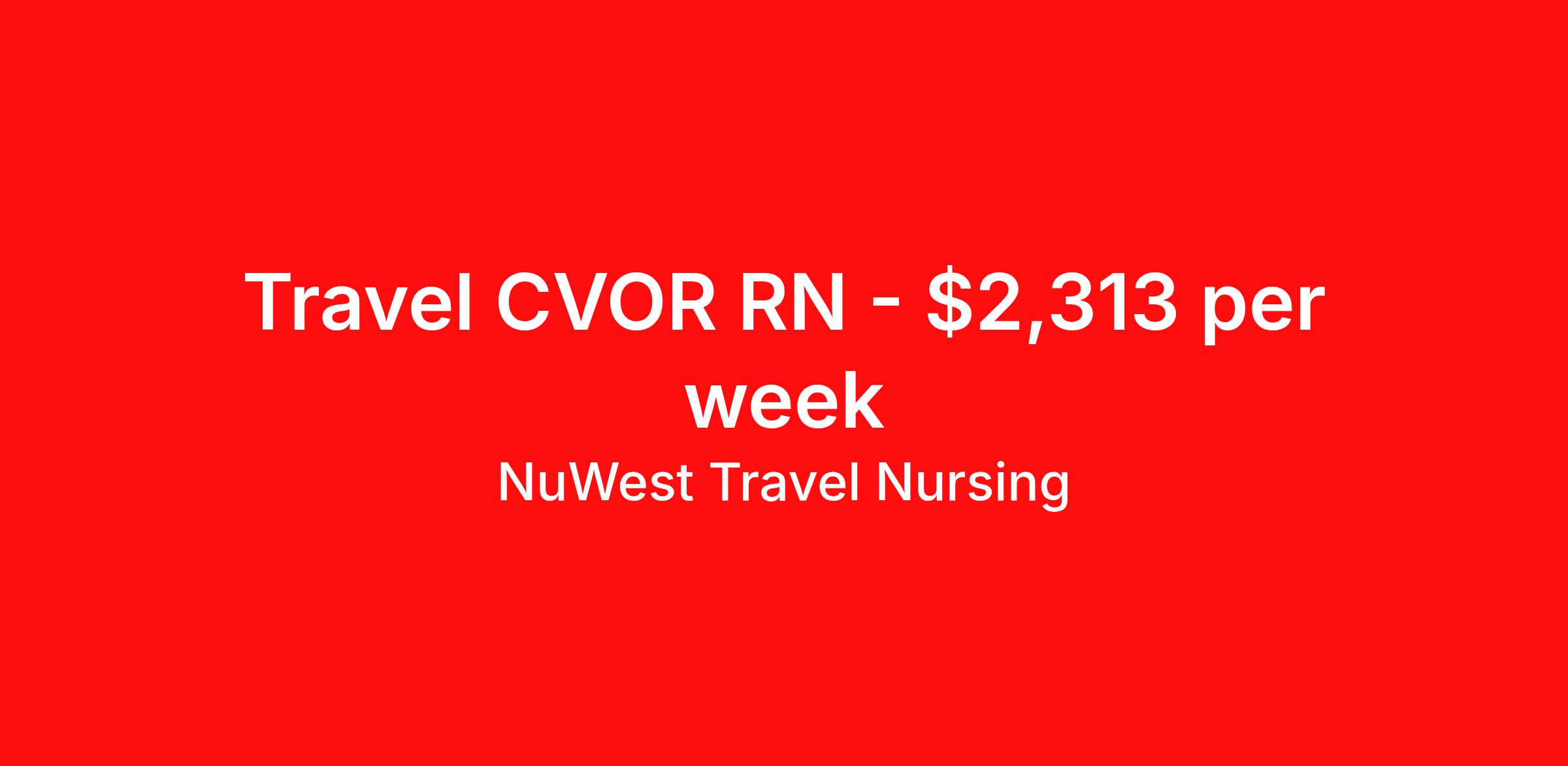 NuWest Travel Nursing is seeking a travel nurse RN CVOR for a travel nursing job in Mason City, Iowa. Job Description & Requirements Specialty: CVOR Discipline: RN Duration: 13 weeks 36 hours per week Shift: 12 hours Employment Type: Travel We have a new assignment for RN - CVOR in Mason City, IA and are interviewing ASAP. This is a travel assignment, 5x8 Days position at a great facility. Pay Range: $2125.64 - $2500.76 Per Week Benefits include medical, dental, vision, 401K, weekly direct deposit, and more! NuWest Travel Nursing Job ID 269565. Pay package is based on 12 hour shifts and 36 hours per week (subject to confirmation) with tax-free stipend amount to be determined.