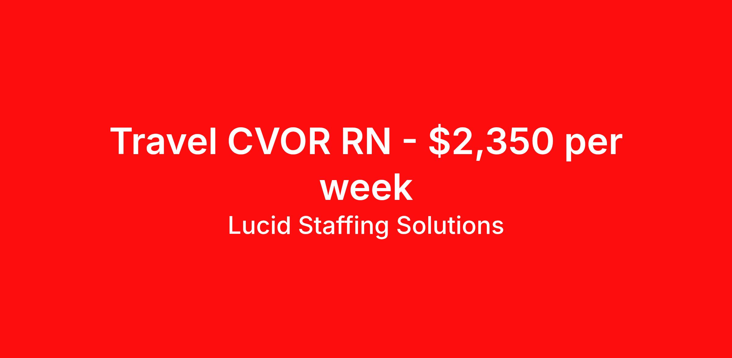 Lucid Staffing Solutions is seeking a travel nurse RN CVOR for a travel nursing job in Milwaukee, Wisconsin. Job Description & Requirements Specialty: CVOR Discipline: RN Duration: 13 weeks 40 hours per week Shift: 8 hours, days Employment Type: Travel Job Description Position: Travel Registered Nurse (RN) with experience in OR Location: Milwaukee, Wisconsin Shift: 10hr Day Weekly Gross: $2350.00 Lucid Staffing Solutions was created by former healthcare workers who lived the short staffing, the chaotic workflows, and the nonstop pressure that comes with patient care. We built an agency powered by real clinical experience, kept simple and supportive, so you never have to guess whether the people guiding you actually know what they’re talking about. Minimum Requirements: Active license as a Registered Nurse (RN) Licensed in Wisconsin (If applicable) or compact eligible Two years of recent OR experience Active BLS Why Lucid Works for Travelers Paid Weekly: Stipends pushed to GSA limits whenever possible $500 Travel Reimbursement: Paid at the start of each assignment Clinician-Led Team: Recruiters and Account Managers with real clinical experience In-House Compliance: fast updates, real communication, and none of the delays that come with outsourced vendors. Health Coverage Options: Multiple medical plans plus dental, vision, and workers compensation 401(k) Match: 4 percent match after 6 months License & Certification Reimbursement: We help cover the cost of staying compliant Liability Insurance: Included automatically Referral Bonuses: $500 per referral, $750 after five referrals Ready to start your journey? Apply today to connect with a Clinician-Recruiter! Lucid Staffing Solutions Job ID 39260. Pay package is based on 8 hour shifts and 40 hours per week (subject to confirmation) with tax-free stipend amount to be determined. Posted job title: OR About Lucid Staffing Solutions Clinician Owned & Operated At Lucid Staffing Solutions, we do things differently—because we’ve been in your shoes. Founded by actual healthcare professionals, Lucid was built to fix the issues we experienced as travelers. We know what makes a great assignment: competitive pay, seamless onboarding, honest recruiters, and most importantly—working with a team that truly sees and supports you. Our entire team is made up of former clinicians who understand the demands of the job and what travelers truly need to succeed. We offer some of the highest paying allied health and nursing contracts across the country, along with some amazing benefits & perks. Whether you're chasing freedom, flexible schedules, bigger paychecks, or your next adventure, Lucid helps you get there—with real support, real respect , and real healthcare experts. Benefits Dental benefits Medical benefits Vision benefits