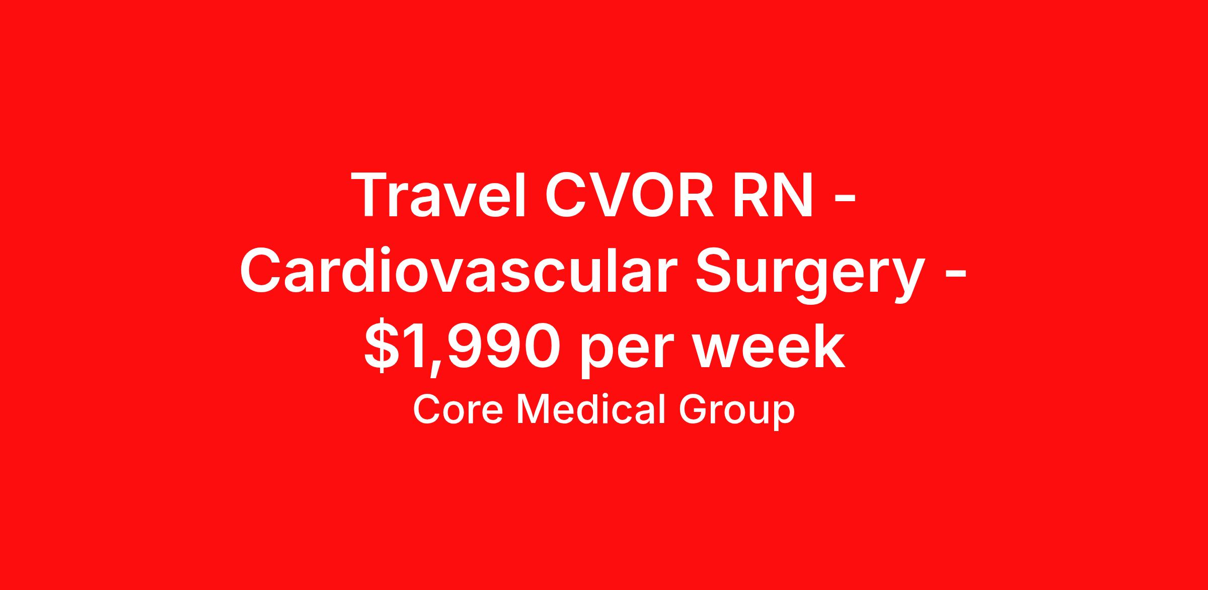 Core Medical Group is seeking a travel nurse RN CVOR for a travel nursing job in Arlington, Texas. Job Description & Requirements Specialty: CVOR Discipline: RN Start Date: 03/24/2026 Duration: 13 weeks 36 hours per week Shift: 12 hours Employment Type: Travel Client in TX seeking Registered Nurse: CVOR for the following shift(s): Days We are looking for a healthcare professional who is ready to provide exceptional patient care in this contract/travel role. Contract/travel assignments are typically 13 weeks, with potential to extend. Help us continue our mission to connect people, improve lives, and give back to the community by joining the CoreMedical Group team. When you work with CoreMedical Group, we put you first and treat you like family, supporting you every step of the way. CoreMedical Group is one of the largest healthcare staffing agencies in the country, with travel and contract positions located across the United States. Our recruiters will help you find the perfect job, whether it's across the country or across the street. In addition to dedicated, personalized support from your recruiter, when you work with CoreMedical Group you'll receive: Access to an extensive benefits package, including day 1 health, dental, and vision insurance, employer paid life insurance, a health reimbursement account, and more! Weekly paychecks with competitive pay packages Matching 401(k) benefits to help you save for retirement Licensure assistance and reimbursement to set you up for success on your contract Travel reimbursement and dedicated housing support while on assignment Referral cash bonuses when you connect us with other clinicians CoreMedical Group also offers you a free, all-inclusive vacation each year as our way of saying "thank you" for your hard work. Join other healthcare professionals on the annual Club CoreMed retreat and you'll see why our contract and travel professionals come back to us year after year! Your career is too valuable to tackle on your own. Let CoreMedical Group help you with your healthcare journey! *Estimate of weekly payments is intended for informational purposes and includes hourly wages, as well as reimbursements for meal & incidental expenses, and housing expenses incurred on behalf of the Company. Any benefits (medical/dental/vision) are in addition to the weekly pay. Please speak with your Recruiter for additional details. Estimated payments are subject to change until formal offer of assignment is made and accepted. Core Medical Group Job ID 1367688. Pay package is based on 12 hour shifts and 36 hours per week (subject to confirmation) with tax-free stipend amount to be determined. Posted job title: RN About Core Medical Group CoreMedical Group is one of the largest healthcare staffing agencies in the country. We have jobs nationwide in travel nursing, travel allied health, interim, locum tenens, and permanent placements! Join the staffing agency with Club CoreMed, the best perk in the industry - an all inclusive paid trip to a tropical resort! Benefits Weekly pay Holiday Pay Guaranteed Hours Continuing Education 401k retirement plan Pet insurance Company provided housing options Sick pay Wellness and fitness programs Mileage reimbursement Referral bonus Employee assistance programs Medical benefits Dental benefits Vision benefits Benefits start day 1 License and certification reimbursement Life insurance Discount program