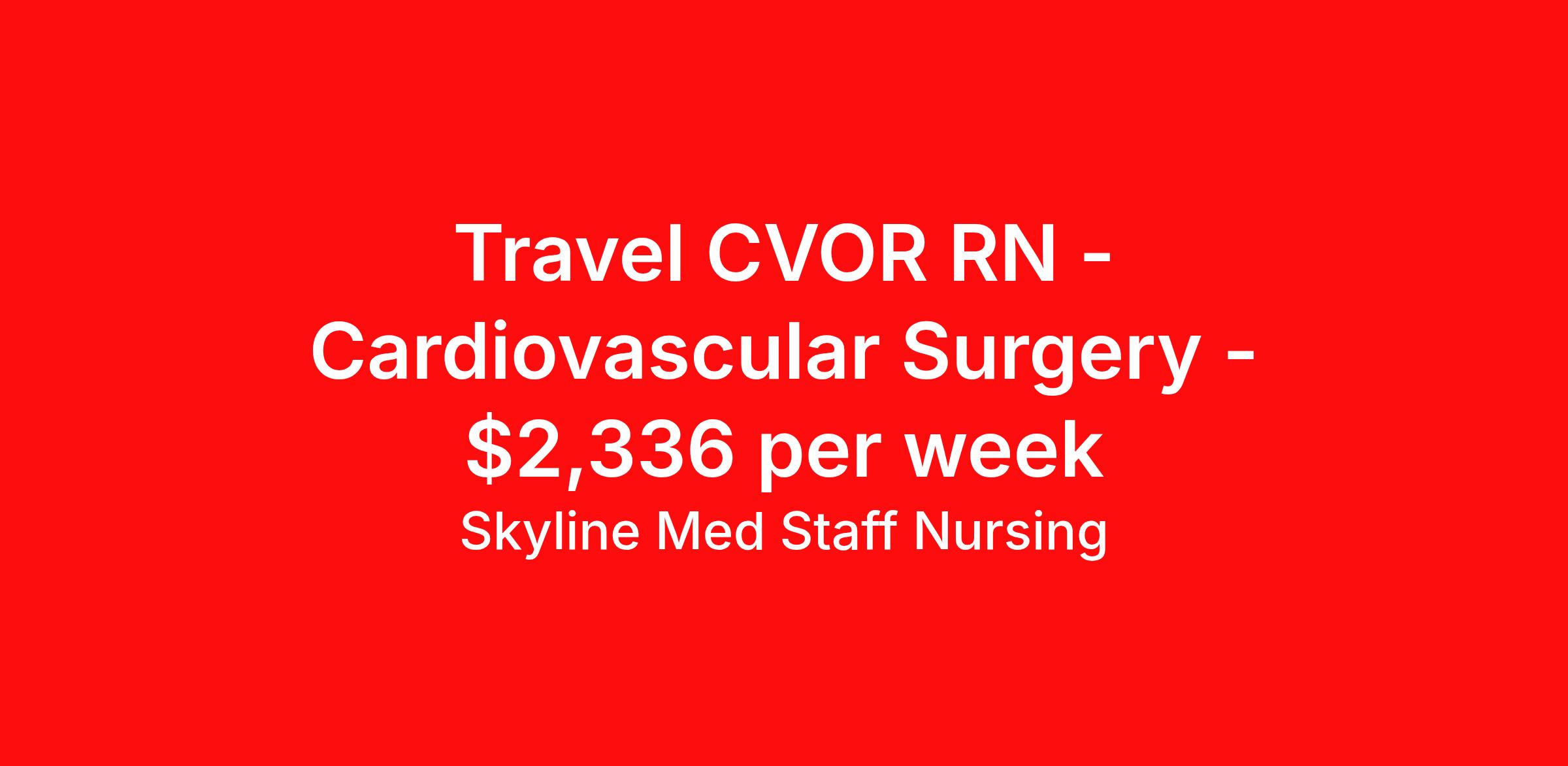 Skyline Med Staff Nursing is seeking a travel nurse RN CVOR for a travel nursing job in Kingwood, Texas. Job Description & Requirements Specialty: CVOR Discipline: RN Start Date: 04/06/2026 Duration: 13 weeks 40 hours per week Shift: 8 hours, days Employment Type: Travel Weekly amount stated in job postings is an estimate based on estimated hourly wage and potential stipends available for the location of the assignment. Pay package is calculated on bill rate at the time job was posted, but can change or vary without notice. Exact pay packages might vary as this is an estimate. Our recruiter would be happy to build an exact pay package for you for each job. Join the Best in Travel Nursing! Skyline Med Staff was honored as the 1 Best Travel Nursing Company in 2025 by BluePipes, a recognition driven by glowing reviews from travel healthcare professionals. Our recruiters are consistently praised on Google for their responsiveness, dedication, accessibility, and industry knowledge. Ready to experience the difference? Apply for a job today and see why travel nurses choose Skyline! As a traveler with Skyline Med Staff, you'll have a dedicated recruiter supporting you every step of the way and available whenever you need them. We are a Woman Owned Agency providing clinicians with Health Insurance through Blue Cross Blue Shield, along with Dental and Vision coverage, plus $500 referral bonuses! We’re seeking committed Nursing professionals who excel in delivering quality patient care and can adapt to diverse work environments. Required for Submission: 1. Minimum of 1 year recent work experience in the specialty of the job applying for 2. A current BLS/CPR certification through American Heart Association 3. Active License in the state of the job location We look forward to connecting and working with you to find your next job opportunity! Skyline Med Staff Nursing Job ID 36075887. Pay package is based on 8 hour shifts and 40.0 hours per week (subject to confirmation) with tax-free stipend amount to be determined. Posted job title: RN:Cath Lab,07:00:00-15:00:00 About Skyline Med Staff Nursing Join the Top- Rated Travel Healthcare Team! Skyline Med Staff was named as the 1 Best Travel Healthcare Company in 2025 by BluePipes, a recognition driven by glowing reviews from travel healthcare professionals. Our recruiters are consistently praised on Google for their responsiveness, dedication, accessibility, and industry knowledge. Ready to experience the difference? Apply for a job today and see why healthcare professionals choose Skyline! Certified Women Owned Business We believe that travel is good for the soul. We want to be on your journey with you and find the right job that fits you Skyline Med Staff is committed to one vision treating others the way that THEY want to be treated. The executive team at Skyline Med Staff focuses on a commitment to quality, consistency, and the highest level of service. Our team members continually strive to build long term relationships that center on you and helping you achieve your goals. Some of the Benefits you will receive with Skyline Med Staff: Over 30 years of combined experience in the staffing industry Higher Take-Home Pay Rates Dedicated Personal Recruiter We are available to you 24/7 Health Insurance Plan Options Tax Free Per Diems, Housing Stipends and Travel Reimbursements Joint Commission Certified Contracts in all 50 states Referral and Loyalty Bonuses Benefits Medical benefits Referral bonus