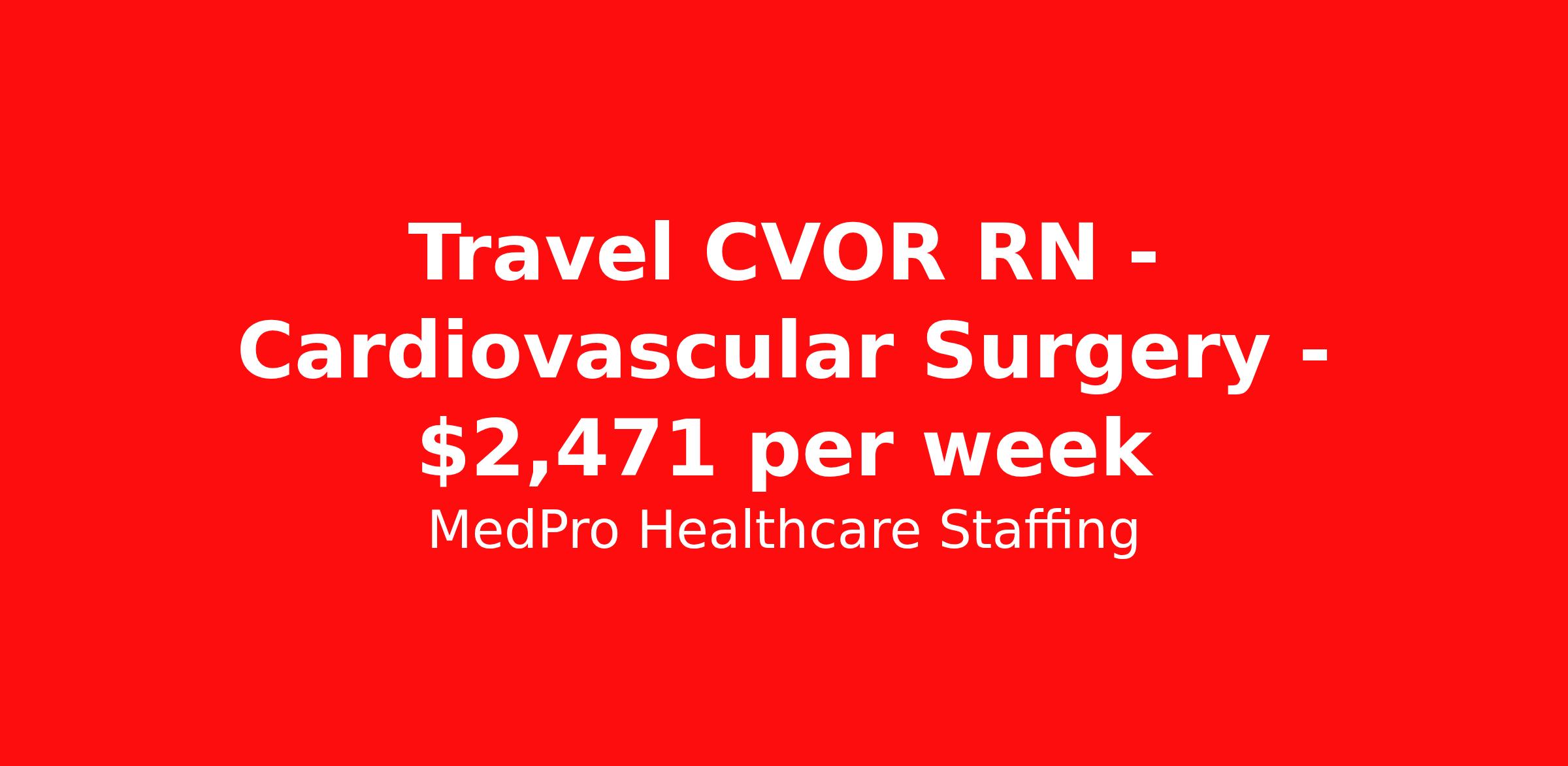 MedPro Healthcare Staffing is seeking a travel nurse RN CVOR for a travel nursing job in Arlington, Texas. Job Description & Requirements Specialty: CVOR Discipline: RN Start Date: 04/06/2026 Duration: 13 weeks 40 hours per week Shift: 8 hours, days Employment Type: Travel MedPro Healthcare Staffing , a Joint Commission-certified staffing agency, is seeking a quality CVOR registered nurse (RN) for a travel assignment with one of our top healthcare clients. Requirements Eighteen months of recent experience in an Acute Care Surgery setting Active RN License Degree from an accredited nursing program BLS & ACLS may be required Benefits Weekly pay and direct deposit Full coverage of all credentialing fees Private housing or housing allowance Group Health insurance for you and your family Company-paid life and disability insurance Travel reimbursement 401(k) matching Unlimited Referral Bonuses up to $1,000 Duties Responsibilities Cardiovascular operating room nurse (CVOR RN) works within the operating room specializing in open heart surgical procedures. Provide surgical patient care by assessing, planning, and implementing the nursing care patients receive before, during and after surgery. Serve as patient educator, circulating nurse and/or scrub nurse. Circulating OR nurses work within the operating suite but outside of the sterile field. Scrub OR nurses handle and prepare operating instruments and equipment within the sterile field. About Agency MedPro Healthcare Staffing is a Joint Commission certified provider of contract staffing services. Since 1983, we have placed nursing and allied travelers in top healthcare facilities nationwide. Join us today for your very own MedPro Experience®. If qualified and interested, please call for immediate consideration. MedPro Staffing is an Equal Opportunity Employer. All applicants will be considered for employment without attention to race, color, religion, national origin, age, sex, disability, marital status or veteran status. Key Words: Registered Nurse, RN, Cardio vascular Operating Room, Open Heart, Scrub, Circulate, OR, Contract Nurse, Travel Nurse, Agency RN, Travel RN, Nursing, Contract *Weekly payment estimates are intended for informational purposes only and include a gross estimate of hourly wages and reimbursements for meal, incidental, and housing expenses. Your recruiter will confirm your eligibility and provide additional details. MedPro Job ID a0Fcx00000GjaMIEAZ. Pay package is based on 8 hour shifts and 40 hours per week (subject to confirmation) with tax-free stipend amount to be determined. Posted job title: CVOR Registered Nurse Nursing: CVOR (Scrub). About MedPro Healthcare Staffing At MedPro Healthcare Staffing , we believe no one cares more for caregivers than we do. Our mission is simple: you focus on your patients, and we’ll take care of the rest. As a Joint Commission-certified leader in temporary and contract healthcare staffing since 1983, MedPro has proudly connected nursing and allied travelers with top healthcare facilities across the nation. With thousands of job opportunities available nationwide, we make it easy to find assignments that align with your goals and lifestyle. Our on-staff clinical support team—alongside a compassionate group of experienced recruiters—provides hands-on guidance every step of the way. From Day 1 medical benefits and a 401(k) plan to personalized career support, we’re committed to ensuring every professional we serve feels valued, cared for, and empowered to succeed. Guided by a CEO who is a Registered Nurse, MedPro is built on a foundation of clinical insight and genuine compassion for the caregiving community. Through The MedPro Experience® , we deliver travel assignments that are rewarding, memorable, and designed to help you DREAM big, EXPLORE often, and ACHIEVE greatness. Benefits Day 1 medical, dental, and vision benefits for you and your family Weekly pay and direct deposit Unlimited Referral Bonuses starting at $500 On Staff Clinical Support Team Access to nationwide travel assignments MPX Mobile app -24/7 real-time access to jobs, credentials, assignment details, and more Full coverage of all credentialing fees Private housing or housing allowance Tax Free Per Diems, Housing Stipends and Travel Reimbursements Company-paid life and disability insurance Travel reimbursement 401(k) matching Benefits Weekly pay Referral bonus Employee assistance programs