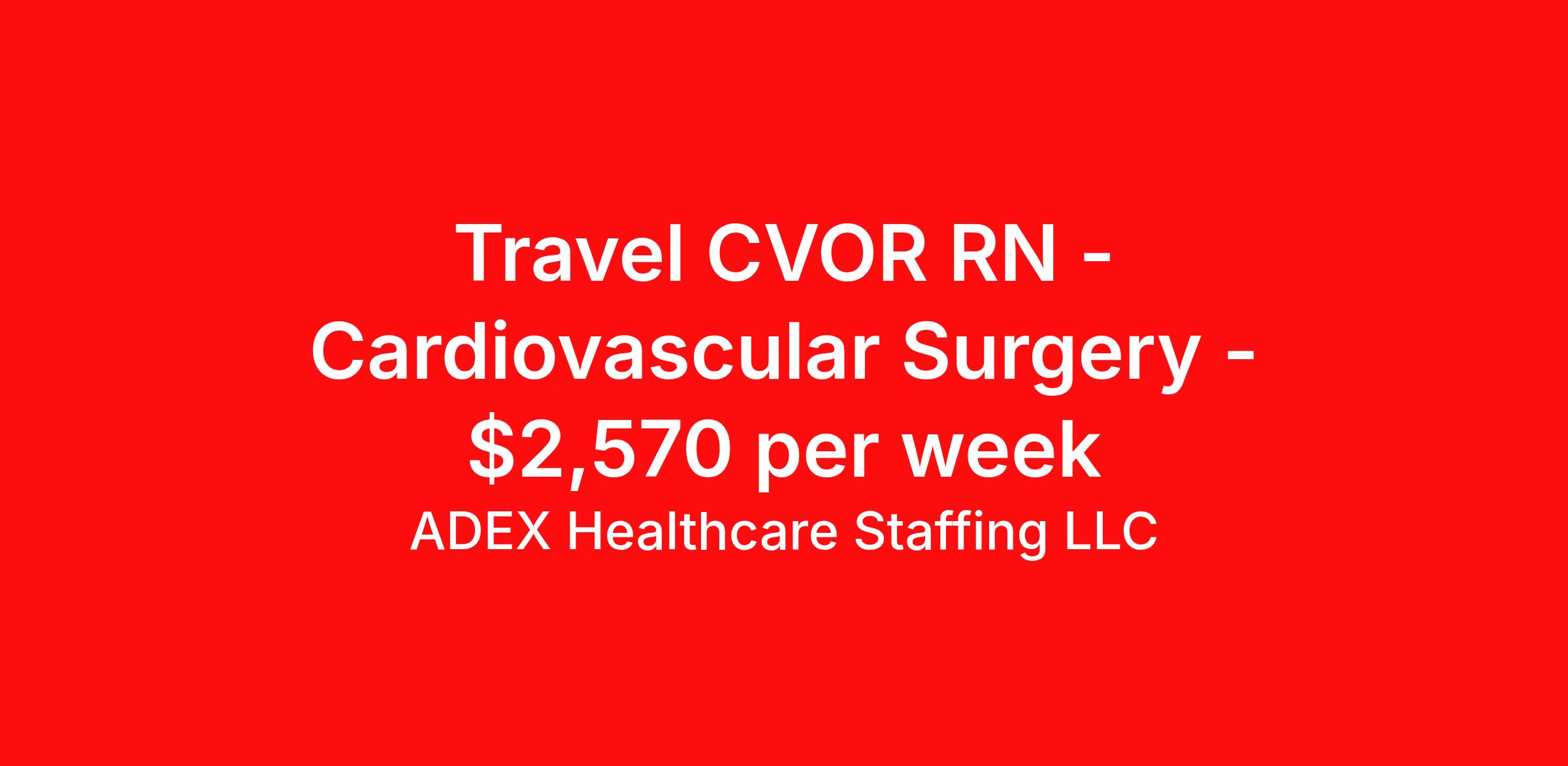 ADEX Healthcare Staffing LLC is seeking a travel nurse RN CVOR for a travel nursing job in Arlington, Texas. Job Description & Requirements Specialty: CVOR Discipline: RN Start Date: 03/24/2026 Duration: 13 weeks 40 hours per week Shift: 8 hours, days Employment Type: Travel RN Position Job Notes: Travel or Local Registered Nurse needed for ASAP start. A minimum of 2 years of recent hospital bedside experience is required. Candidates must be able to start within 5 weeks. Opportunity for extension upon successful completion of the initial assignment. $750 referral bonus available. Opportunity: RN - Cardiovascular Surgery Job Details: • Work in 10-bed operating room unit specializing in cardiovascular surgery • Call requirements: 4-6 shifts per month • Day and night shift positions available • Must complete PeriOp 101 training • Orthopedic and trauma experience required • Must have required certifications • Perform typical cardiovascular surgery procedures • Work with specialized cardiovascular surgery equipment • Follow unit-specific dress code and scrub color requirements • Weekend and call shift requirements as needed Facility: This healthcare facility operates a specialized 10-bed operating room unit focused on cardiovascular surgery services. The facility maintains high standards for surgical care and requires experienced nursing professionals with specific training in perioperative procedures. The organization emphasizes the importance of orthopedic and trauma experience for their cardiovascular surgery team and provides a comprehensive surgical environment with advanced equipment and protocols. Location: Arlington, TX Arlington offers a prime location in the heart of the Dallas-Fort Worth metroplex, providing excellent access to professional opportunities and urban amenities. The city combines the benefits of a major metropolitan area with a strong sense of community, featuring diverse dining, entertainment options, and proximity to major sports venues and cultural attractions. Adex Job ID 988788. Pay package is based on 8 hour shifts and 40 hours per week (subject to confirmation) with tax-free stipend amount to be determined. About ADEX Healthcare Staffing LLC ADEX has been placing healthcare professionals across the US since 2004. Originally founded in Atlanta, GA, the company's headquarters are now located in Tampa, FL. JCAHO certified since 2009. Benefits Referral bonus