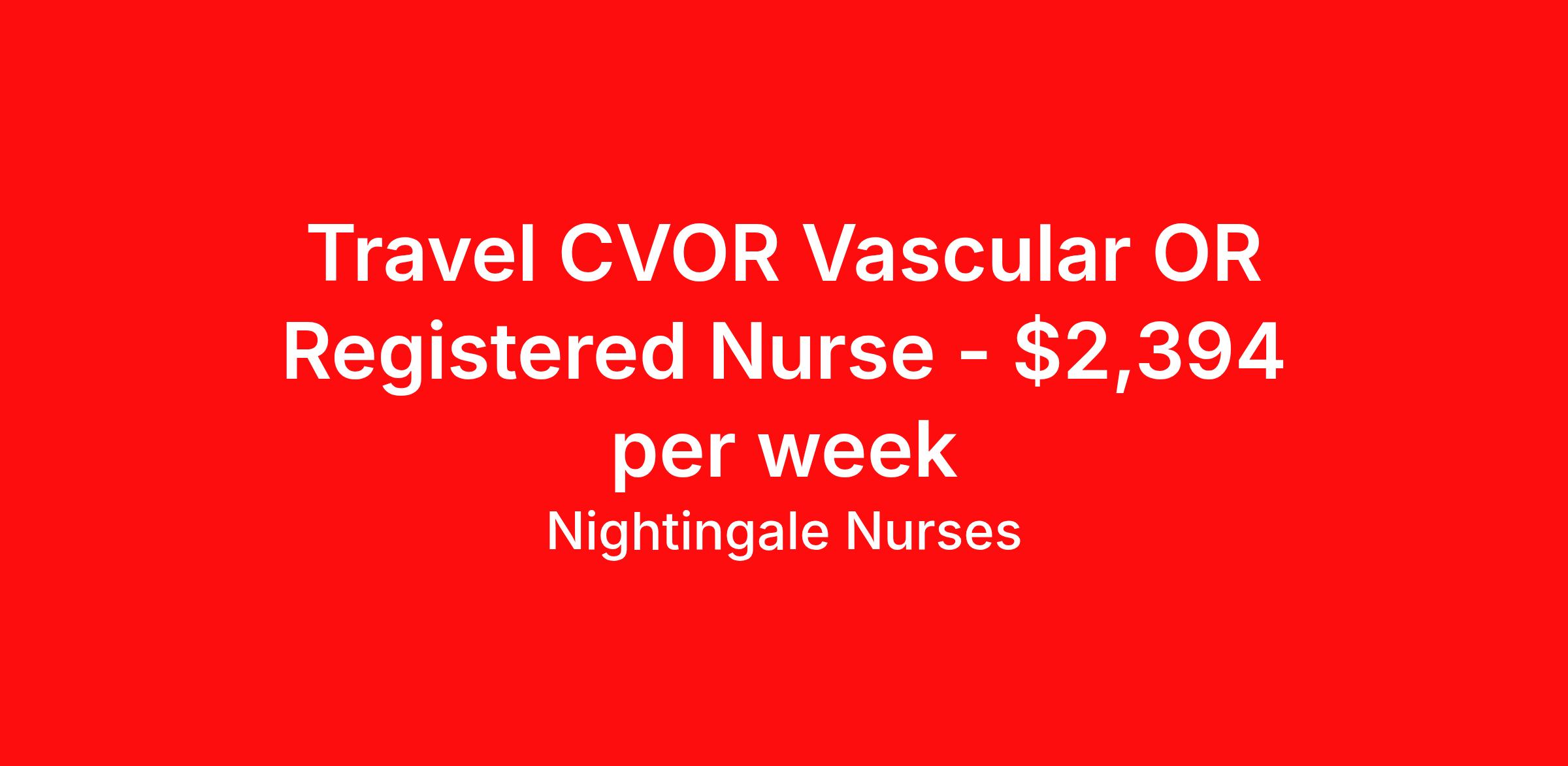 Nightingale Nurses is seeking a travel nurse RN CVOR for a travel nursing job in Charleston, South Carolina. Job Description & Requirements Specialty: CVOR Discipline: RN Start Date: 04/13/2026 Duration: 13 weeks 36 hours per week Shift: 12 hours, days Employment Type: Travel About Nightingale Nurses the first name in travel nursing You may not realize it, but as an RN with real world hospital experience, you are legendary. To the lives you’ve helped save, the patients you’ve cared for, and to the hospitals where you’ve done it. And you’re just getting started. Legendary is where Nightingale begins. We’re the first name in travel nursing, representing only the very best RNs. That’s why hospitals prefer us, allowing us to offer exceptional travel nursing assignments all over the US, as well as the highest pay rates and most extensive benefits in the industry. Nightingale facilitates every aspect of your travel nursing assignment, so you can focus on doing what you do best. We want you to grow, explore, and enjoy unrivaled liberty, the freedom to nurse.