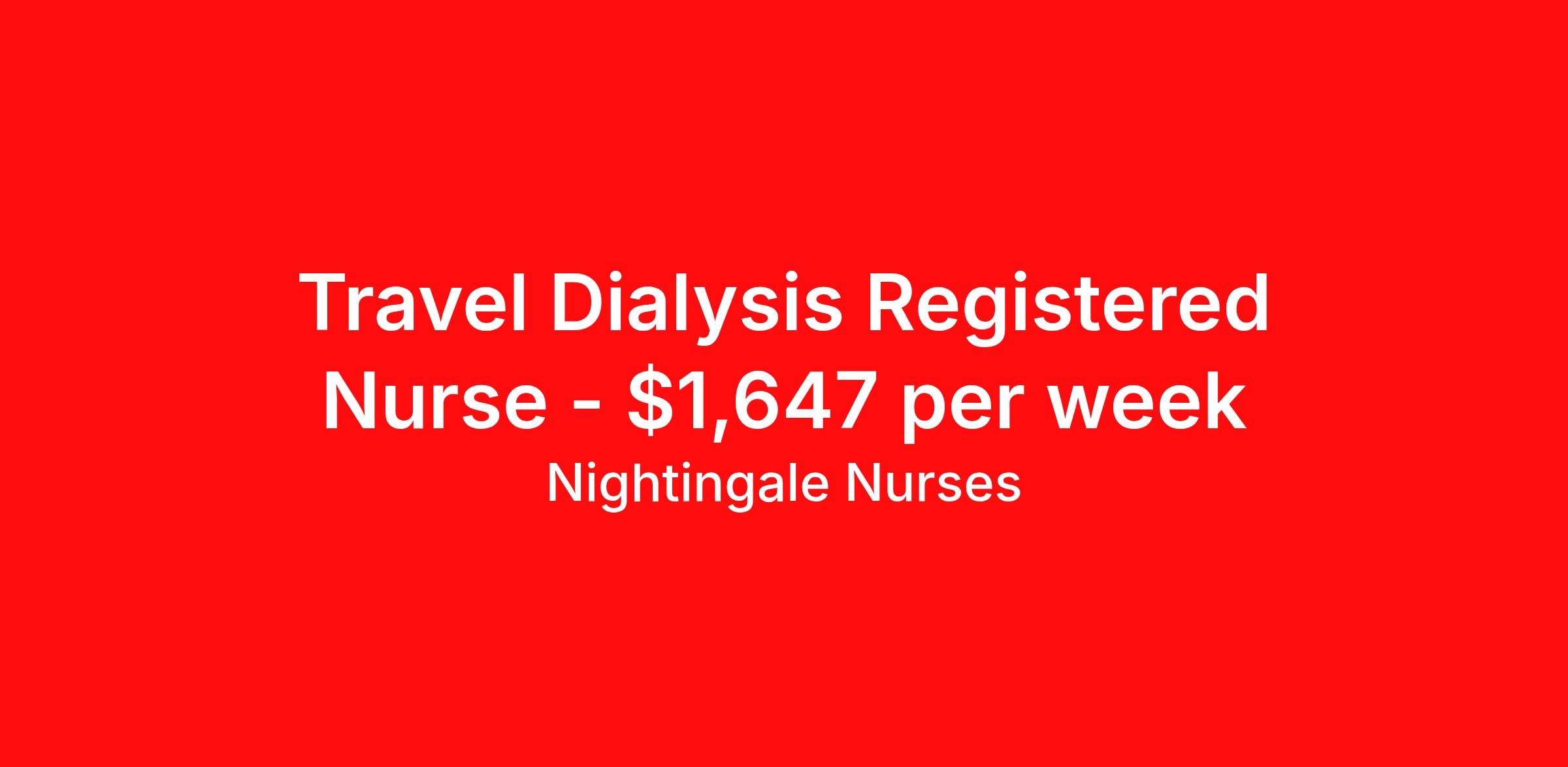 Nightingale Nurses is seeking a travel nurse RN Dialysis for a travel nursing job in Tuscaloosa, Alabama. Job Description & Requirements Specialty: Dialysis Discipline: RN Start Date: 04/13/2026 Duration: 13 weeks 36 hours per week Shift: 12 hours, nights Employment Type: Travel About Nightingale Nurses the first name in travel nursing You may not realize it, but as an RN with real world hospital experience, you are legendary. To the lives you’ve helped save, the patients you’ve cared for, and to the hospitals where you’ve done it. And you’re just getting started. Legendary is where Nightingale begins. We’re the first name in travel nursing, representing only the very best RNs. That’s why hospitals prefer us, allowing us to offer exceptional travel nursing assignments all over the US, as well as the highest pay rates and most extensive benefits in the industry. Nightingale facilitates every aspect of your travel nursing assignment, so you can focus on doing what you do best. We want you to grow, explore, and enjoy unrivaled liberty, the freedom to nurse.