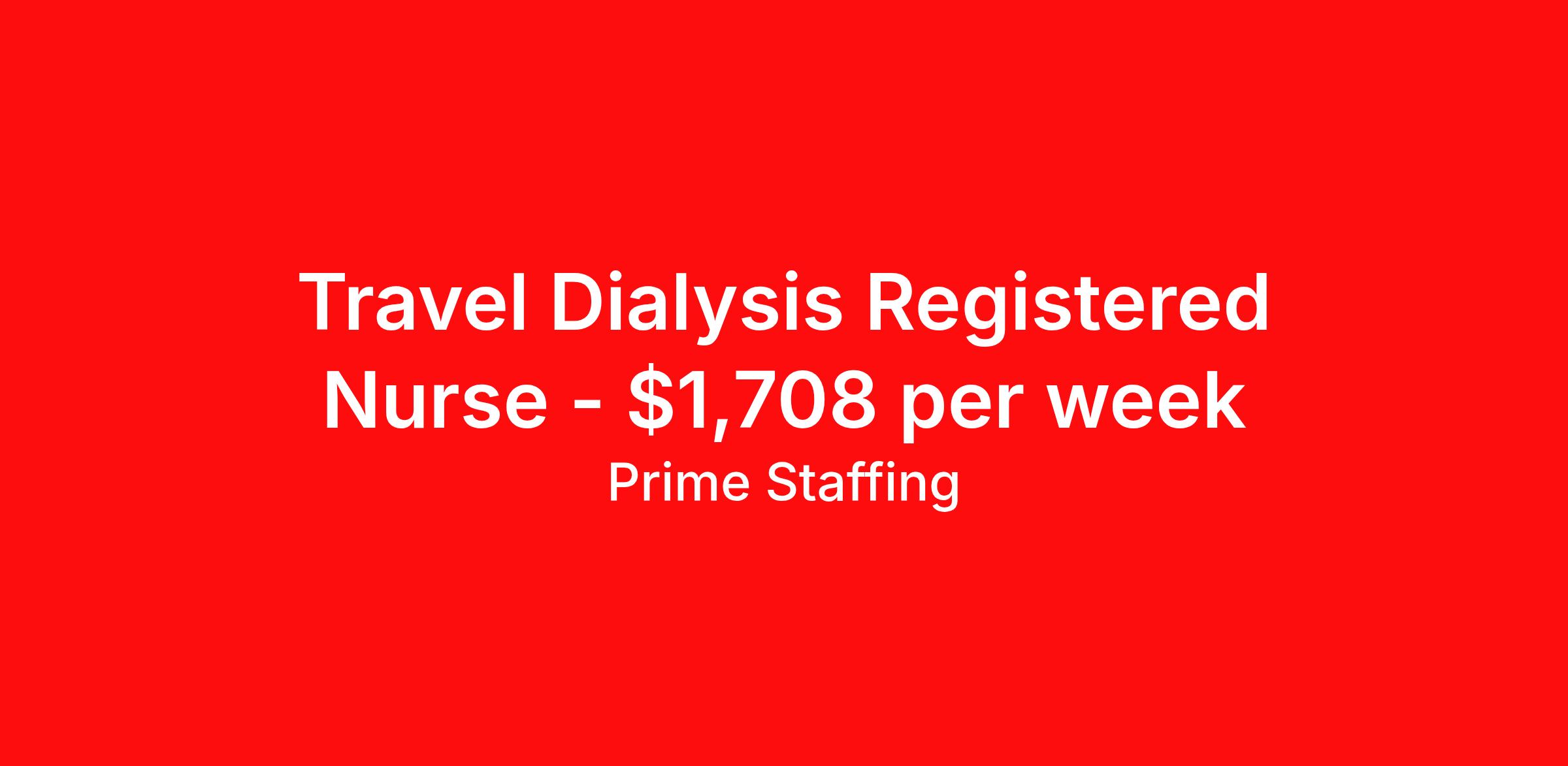 Prime Staffing is seeking a travel nurse RN Dialysis for a travel nursing job in Tuscaloosa, Alabama. Job Description & Requirements Specialty: Dialysis Discipline: RN Start Date: 04/27/2026 Duration: 13 weeks 36 hours per week Shift: 12 hours Employment Type: Travel About the Position Specialty: Registered Nurse – Dialysis Experience: Minimum 2 years of recent dialysis experience required License: Active State or Compact RN License Certifications: BLS and ACLS required – include expiration dates Must-Have: All time-off requests must be submitted with the initial application Description: We are seeking a Dialysis RN experienced in providing care for patients undergoing hemodialysis and peritoneal dialysis. Responsibilities include monitoring vital signs, administering medications, patient education, and operating dialysis equipment. The position may involve working with chronic and acute dialysis patients. This role involves 12-hour shifts , with required weekend, holiday, and floating availability. Compliance completion may take 4–6 weeks . Voice and nurse manager interviews are required. Scheduled shifts must be made up as necessary by department policy. Requirements Required for Onboarding: Active RN License BLS ACLS Prime Staffing Job ID 36127017. Pay package is based on 12 hour shifts and 36.0 hours per week (subject to confirmation) with tax-free stipend amount to be determined. Posted job title: RN:Dialysis,19:00:00-07:30:00 About Prime Staffing At Prime Staffing, we understand the importance of finding the perfect fit for both our clients and candidates. Prime Staffing utilizes a unique matchmaking approach, providing the most qualified contingent staffing to our clients, and the most competitive contracts to our workforce. Our experienced team takes the time to get to know both our clients and candidates, their needs, and preferences, to ensure that each placement is a success. We offer a wide range of staffing services including temporary, temp-to-perm, and direct hire placements. Our extensive network of qualified candidates includes nurses, allied healthcare professionals, corporate support professionals and executives.