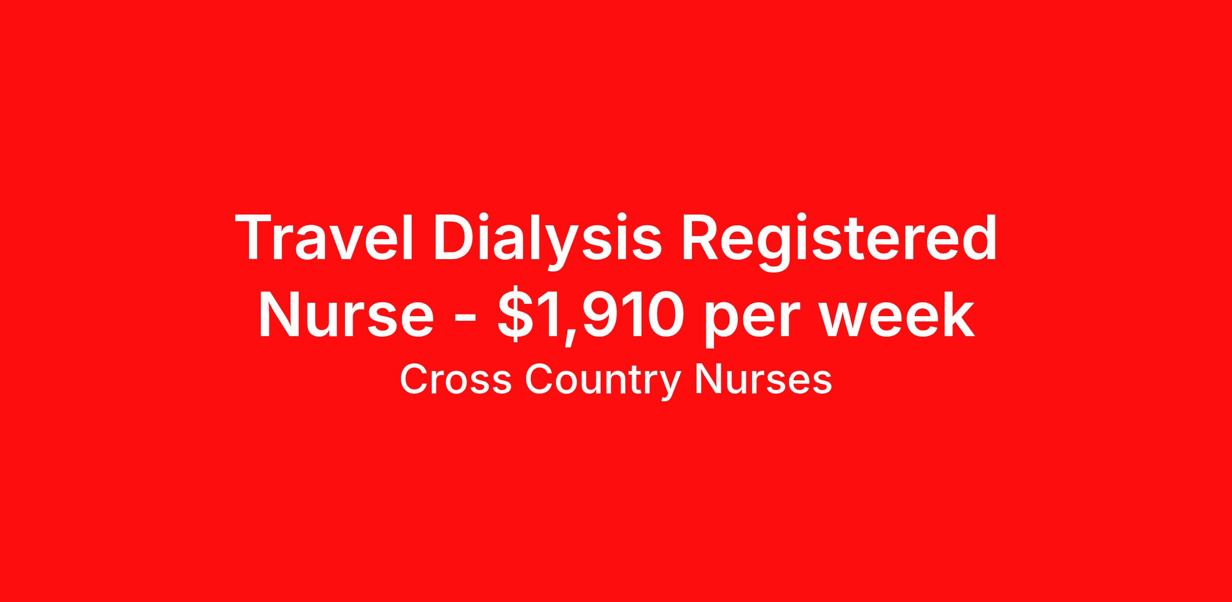 Cross Country Nurses is seeking a travel nurse RN Dialysis for a travel nursing job in Denville, New Jersey. Job Description & Requirements Specialty: Dialysis Discipline: RN Start Date: 04/06/2026 Duration: 13 weeks 36 hours per week Shift: 12 hours, days Employment Type: Travel Job Description As a dialysis nurse (RN DIAL), you will provide extensive, personalized care to patients suffering from chronic or acute kidney failure. Along with ensuring that treatments are administered to patients correctly and monitoring vitals, you will be responsible for the proper set up of dialysis machines and equipment. You will also be expected to educate patients on how to use home dialysis machines if necessary. Minimum Requirements At least 1 year of recent acute care experience in specialty Active RN license Benefits The benefits of taking a travel nursing job with Cross Country include: Private housing or generous housing allowance Comprehensive health insurance with prescription coverage Dependent health insurance with prescription coverage Competitive salaries Referral bonuses Travel reimbursement 401(k) retirement plan Direct deposit/free checking Unlimited free CE credits Cross Country Job ID 1236303. Pay package is based on 12 hour shifts and 36 hours per week (subject to confirmation) with tax-free stipend amount to be determined. Posted job title: Registered Nurse / Dialysis Unit About Cross Country Nurses You care for others — we’re here to care for you. At Cross Country, we know travel nursing is about more than just the job. It’s about building a career that supports your lifestyle, your values, and your impact. We offer competitive pay, full benefits, and 24/7 support from a team that truly understands what it means to be on the front lines. Wherever your journey takes you, we’re with you every step of the way. Let’s build your best life — one assignment at a time. Benefits 401k retirement plan Referral bonus