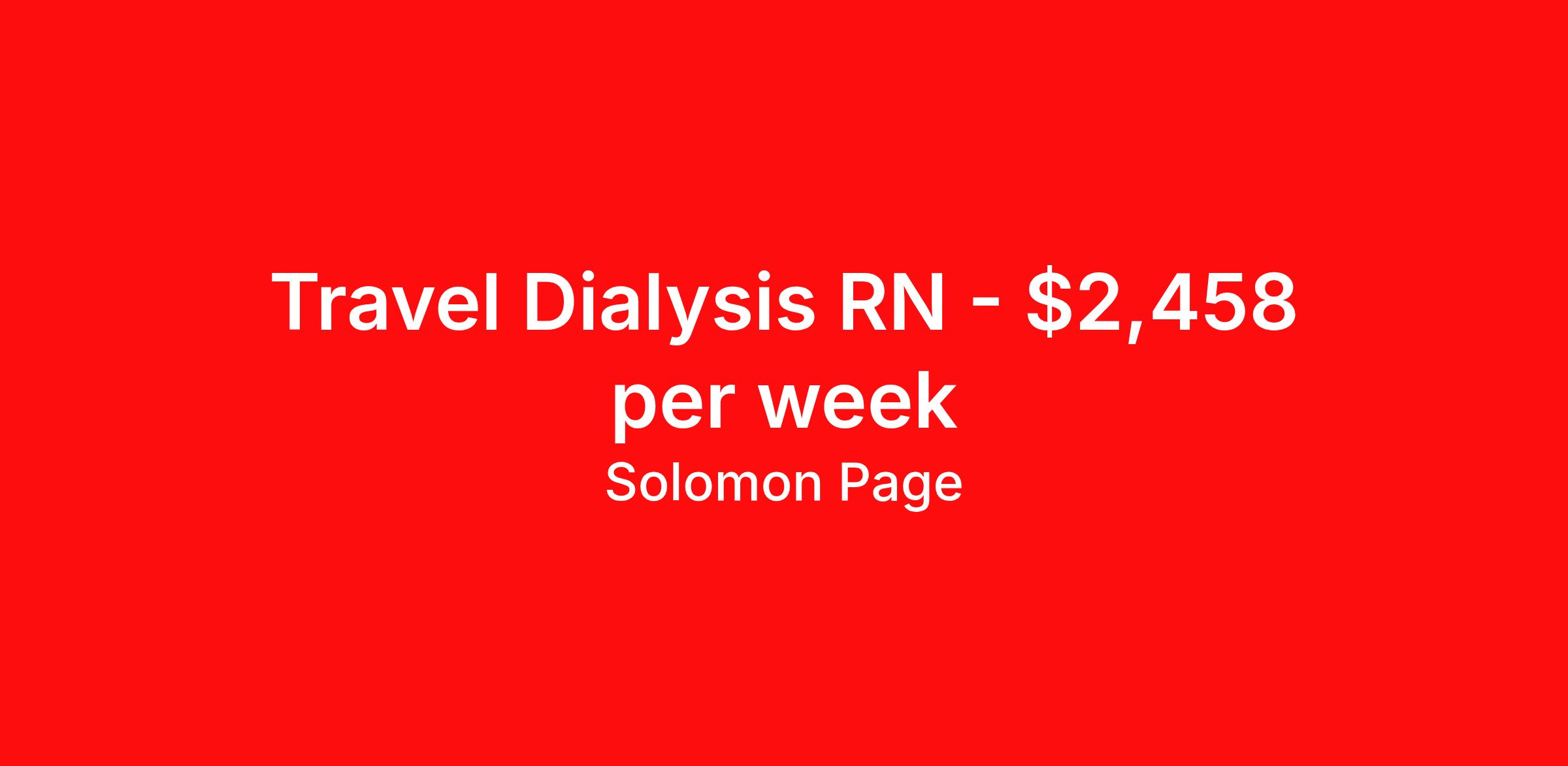 Solomon Page is seeking a travel nurse RN Dialysis for a travel nursing job in Syracuse, New York. Job Description & Requirements Specialty: Dialysis Discipline: RN Start Date: 04/06/2026 Duration: 13 weeks 40 hours per week Shift: 10 hours, days Employment Type: Travel Our client is looking to add a Registered Nurse to their team. Job Details: Location: Syracuse, New York Duration: 13 Weeks Start Date: 04/06/2026 Shift: 4x10 Days Estimated Gross Weekly Pay: 2458 Qualifications: Current New York license Excellent interpersonal skills including patience, empathy, and compassion Effective communication skills, including active listening, writing, speaking and reading comprehension Fast and adaptive problem-solving abilities Ability to stand for long periods of time If you meet the required qualifications and are interested in this role, please apply today. Why Work with Us The success of Solomon Page is defined by our people. Offering a comprehensive benefits package, travel nurses have immediate access to medical coverage and ReviveHealth virtual care. Additionally, you are offered access to dental and vision coverage, commuter benefits, a 401(k) plan, flexible spending, referral bonuses, ongoing training, and more. As an ESOP company, Solomon Page offers an employee stock ownership plan to all consultants. As a member of our traveler community, you will join a nurturing culture that fosters your career goals. Solomon Page can connect you with your next opportunity – whether it is in your hometown, or you are looking to travel to a new destination. About Solomon Page Healthcare & Medical Staffing Accredited by the Joint Commission with the Gold Seal of Approval, Solomon Page prides ourselves in developing long-term relationships with healthcare providers based on trust and respect. Our experienced Healthcare and Medical Staffing experts are committed to providing safe and quality patient care through our wide network of travel nurses, locum tenens, and allied resources. For more information and additional healthcare opportunities, visit: solomonpage.com and connect with Solomon Page on Instagram, Facebook, Twitter, LinkedIn, and TikTok. 432072 Solomon Page Job ID 432703. Pay package is based on 10 hour shifts and 40 hours per week (subject to confirmation) with tax-free stipend amount to be determined. Posted job title: nurse - rn - dialysis | syracuse, new york About Solomon Page Founded in 1990, Solomon Page has grown to be a leader in the staffing industry. As a member of our healthcare provider community, you will join a nurturing culture that fosters your career goals. We have the network and resources to connect you with your next opportunity – whether it is in your hometown, or you are looking to travel to a new destination. Accredited by the Joint Commission with the Gold Seal of Approval, Solomon Page prides itself in developing long-term relationships with healthcare providers based on trust and respect. Headquartered in New York with offices throughout the United States our experienced healthcare and medical staffing experts are committed to providing safe and quality patient care through our wide network of travel nurses, locum tenens, and allied resources. For more information and additional healthcare opportunities, visit: solomonpage.com /healthcare and connect with us on Facebook , Twitter , Instagram , Tik Tok , and LinkedIn. ReviveHealth Virtual Care: Available immediately. Receive free, 100% company paid, virtual care access. Upon commencement of your employment, Solomon Page offers automatic enrollment into ReviveHealth, which offers concierge, membership-based access to virtual primary care, urgent care, mental health therapy, a vision program, and prescription medications. Medical Coverage : Available immediately . Whether you are looking to enroll in single or family insurance, you have immediate access to quality coverage. Dental Coverage : Available the 1st of the month after your hire date . We offer dental insurance to you and your dependents. Vision Coverage : Available the 1st of the month after your hire date . We offer vision insurance to you and your dependents. Commuter Benefits: Available the 1st of the month after your hire date . Set aside pre-tax money to pay for public transportation. 401K Plan: Associates can enroll in the 401K plan after they have worked 1000 hours. ESOP Benefits: As an ESOP company, Solomon Page offers an employee stock ownership plan. Referral Bonus: A cash bonus is offered for referring a candidate to Solomon Page who gets placed. Training & Support: Training programs and ongoing career coaching and support is offered to consultants. Benefits Medical benefits Dental benefits Vision benefits 401k retirement plan Referral bonus