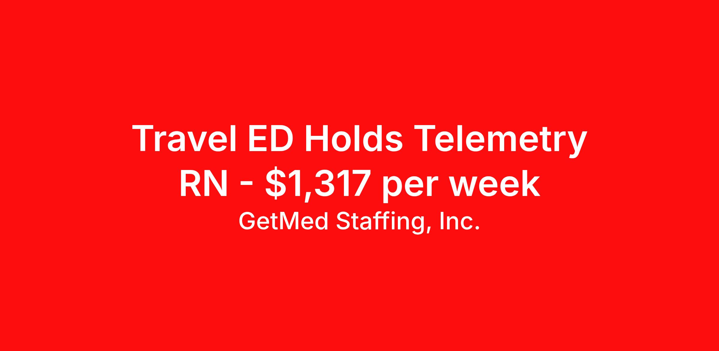 GetMed Staffing, Inc. is seeking a travel nurse RN Telemetry for a travel nursing job in Corpus Christi, Texas. Job Description & Requirements Specialty: Telemetry Discipline: RN Start Date: 03/30/2026 Duration: 13 weeks 36 hours per week Shift: 12 hours, nights Employment Type: Travel GetMed Staffing is searching for a strong Telemetry RN to assist our traveler-friendly client. A minimum of 1-2 years of experience is required. Traveling with GetMed Staffing offers the unique opportunity to gain diverse experiences, both personally and professionally. Gain experience that matters. GetMed Staffing, Inc. Job ID 36077498. Pay package is based on 12 hour shifts and 36.0 hours per week (subject to confirmation) with tax-free stipend amount to be determined. Posted job title: RN:Telemetry,19:00:00-07:00:00 About GetMed Staffing, Inc. We are a diversity owned company, specializing in healthcare recruiting services. We truly understand how important a healthcare travelers' relationship is with their recruiter, as well as our relationship is with our healthcare facilities. We recognize that the needs of our healthcare travelers can vary, and therefore we provide the personalized touch necessary to ensure a successful travel assignment each and every time. Our healthcare facilities and clients benefit from us putting our healthcare travelers first. GetMed Staffing is excited to be a leader within the industry by focusing on providing healthcare travelers with more choices and possibilities as they plan for their next healthcare travel assignment. Benefits Life insurance Medical benefits Dental benefits Vision benefits 401k retirement plan