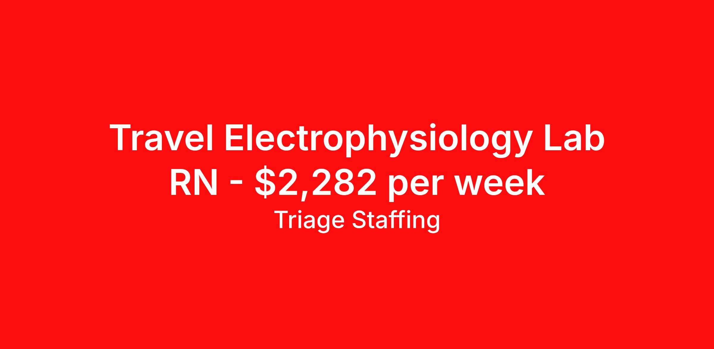 Triage Staffing is seeking a travel nurse RN Electrophysiology Lab for a travel nursing job in Oklahoma City, Oklahoma. Job Description & Requirements Specialty: Electrophysiology Lab Discipline: RN Start Date: 04/06/2026 Duration: 9 weeks 40 hours per week Shift: 8 hours, days Employment Type: Travel Travel Nursing: Electrophysiology Oklahoma City Location: Oklahoma City Start Date: 4/6/2026 Shift Details: 8H Days 40 hours per week Length: 9 WEEKS Apply for specific facility details.EP Lab RN Triage Staffing Job ID 6P7RRNXR. Posted job title: Nursing: Electrophysiology About Triage Staffing At Triage, we prefer to be real . Real about expectations—both ours and yours. Real about how a decision you make today could affect your tomorrows. Real about how compensation actually works. Real about how great—or grating—your next supervisor may be. Being real allows everyone at Triage to be ready . Ready to serve you with real honesty. So if that gig near the ocean is really no day at the beach, or that third shift comes with a second-class rate, we tell you. So you can be ready, too. We staff all five major divisions of acute care—nursing, lab, radiology, cardiopulmonary and rehab therapy, offering: - Competitive, custom pay packages - One point of contact for both travelers and facilities (per division) - A reliable recruiter who's got your back throughout your entire assignment - In-house compliance and accounting specialists - A clinical liaison team available 24/7 to offer medical and professional support and career development - A mentoring program that is run and managed by actual clinicians—yeah, you read that right - And more (because of course there’s more) Are we the biggest? No. Are we the best? That’s rather subjective, but we’re trying to be. Will we work like hell to get you as close to your idea of heaven as possible? Yes. Yes, we will. Benefits: Day One comprehensive, nationwide insurance plans for health, vision and dental and life—including a HSA option Day One 401(k) program with employer-matching contributions once eligible Facility cancelling protection—your time is money on and off-the-clock Guaranteed hours Weekly paychecks via direct deposit Earned vacation bonuses for time worked Paid holidays Employee assistance program (EAP)—your mental health is important, too Continuing education, certification and licensing reimbursement Workers comp—because accidents happen Top-rated professional liability insurance Company provided housing options Referral bonus—$750 in your pocket after they’ve completed a 13-week assignment