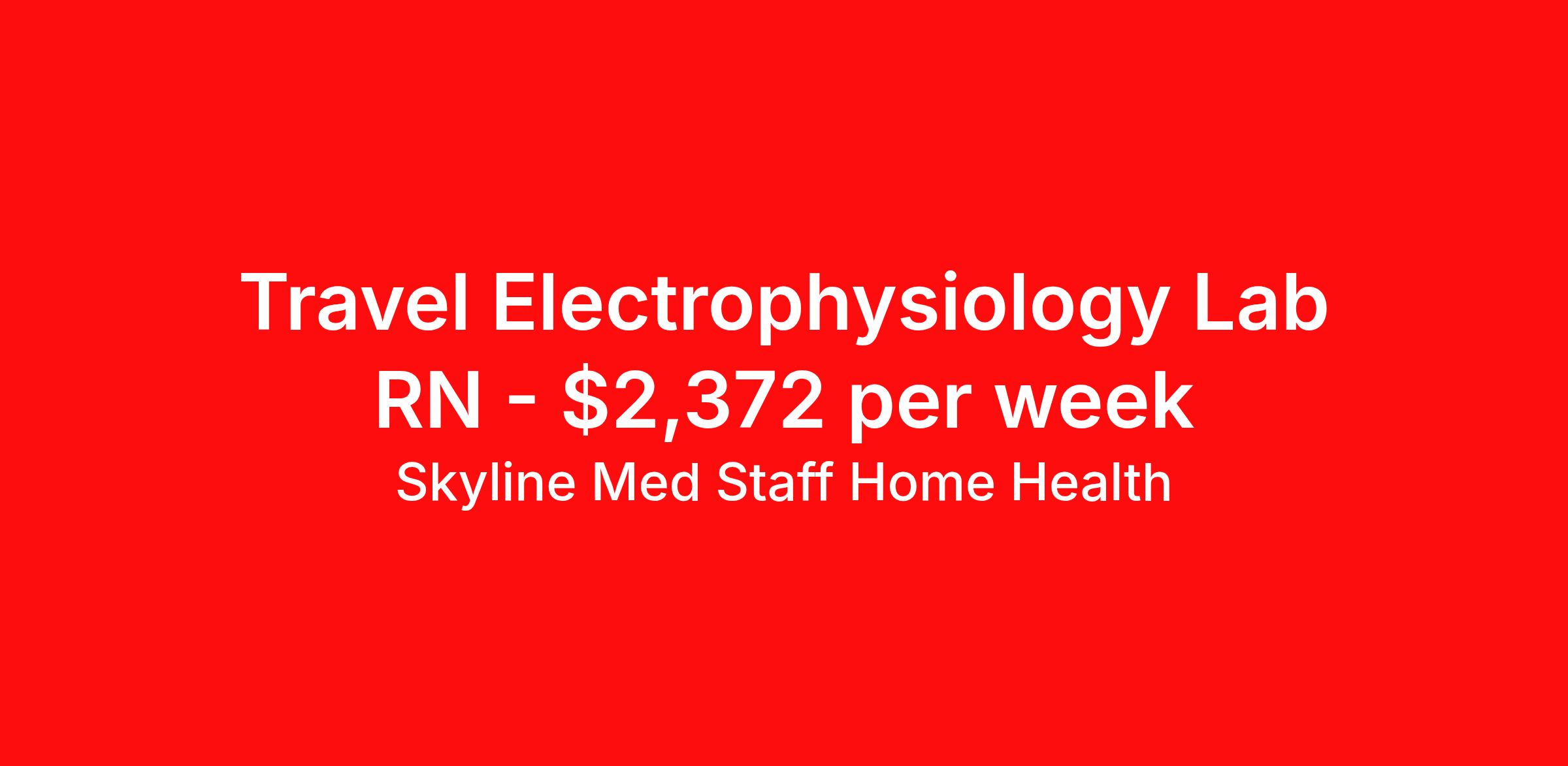 Skyline Med Staff Home Health is seeking a travel nurse RN Electrophysiology Lab for a travel nursing job in Oklahoma City, Oklahoma. Job Description & Requirements Specialty: Electrophysiology Lab Discipline: RN Start Date: 04/06/2026 Duration: 9 weeks 40 hours per week Shift: 8 hours, days Employment Type: Travel Weekly amount stated in the job postings is estimated based on estimated hourly wages and potential stipends available for the location of the assignment. Pay package is calculated on bill rate at the time job was posted, but can change or vary without notice. Exact pay packages might vary as this is an estimate. Our recruiter would be happy to build an exact pay package for you for each job. Join the Best in Travel Nursing! Skyline Med Staff was honored as the 1 Best Travel Nursing Company in 2025 by BluePipes, a recognition driven by glowing reviews from travel healthcare professionals. Our recruiters are consistently praised on Google for their responsiveness, dedication, accessibility, and industry knowledge. Ready to experience the difference? Apply for a job today and see why travel nurses choose Skyline! As a traveler with Skyline Med Staff, you'll have a dedicated recruiter supporting you every step of the way and available whenever you need them. We are a Woman Owned Agency providing clinicians with Health Insurance through Blue Cross Blue Shield, along with Dental and Vision coverage, plus $500 referral bonuses! We’re seeking committed Nursing professionals who excel in delivering quality patient care and can adapt to diverse work environments. Required for Submission: 1. Minimum of 1 year recent work experience in the specialty of the job applying for 2. A current BLS/CPR certification through American Heart Association 3. Active License in the state of the job location We look forward to connecting and working with you to find your next job opportunity! Skyline Med Staff Home Health Job ID 36189309. Pay package is based on 8 hour shifts and 40.0 hours per week (subject to confirmation) with tax-free stipend amount to be determined. Posted job title: RN:EP Lab,07:00:00-15:00:00 About Skyline Med Staff Home Health Join the Top- Rated Travel Healthcare Team! Skyline Med Staff was named as the 1 Best Travel Healthcare Company in 2025 by BluePipes, a recognition driven by glowing reviews from travel healthcare professionals. Our recruiters are consistently praised on Google for their responsiveness, dedication, accessibility, and industry knowledge. Ready to experience the difference? Apply for a job today and see why healthcare professionals choose Skyline! Certified Women Owned Business We believe that travel is good for the soul. We want to be on your journey with you and find the right job that fits you Skyline Med Staff is committed to one vision treating others the way that THEY want to be treated. The executive team at Skyline Med Staff focuses on a commitment to quality, consistency, and the highest level of service. Our team members continually strive to build long term relationships that center on you and helping you achieve your goals. Some of the Benefits you will receive with Skyline Med Staff: Over 30 years of combined experience in the staffing industry Higher Take-Home Pay Rates Dedicated Personal Recruiter We are available to you 24/7 Health Insurance Plan Options Tax Free Per Diems, Housing Stipends and Travel Reimbursements Joint Commission Certified Contracts in all 50 states Referral and Loyalty Bonuses Benefits Medical benefits Referral bonus