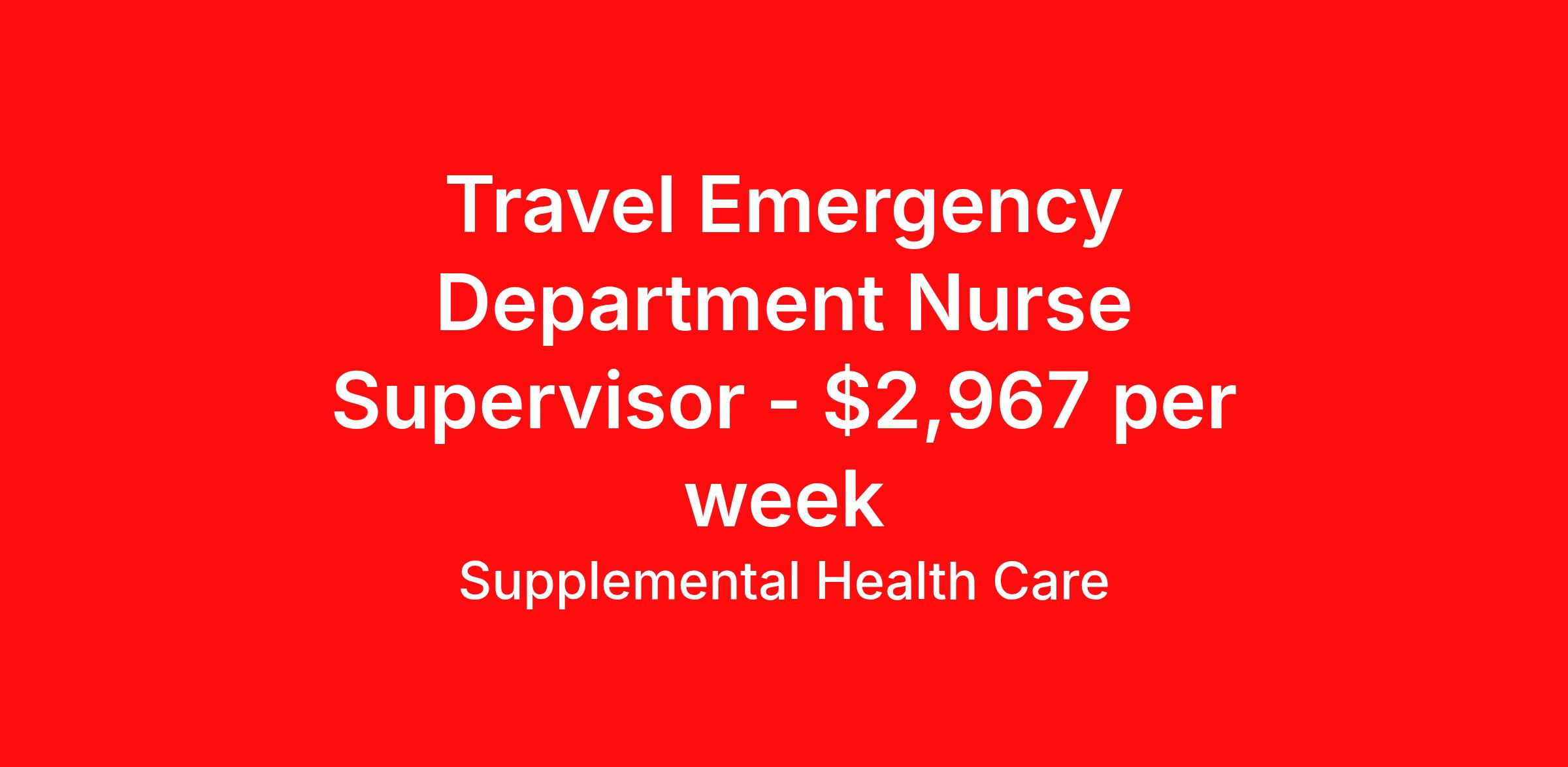 Supplemental Health Care is seeking a travel nurse RN ED - Emergency Department for a travel nursing job in Washington, District of Columbia. Job Description & Requirements Specialty: ED - Emergency Department Discipline: RN Start Date: ASAP Duration: 13 weeks 36 hours per week Shift: 12 hours, days, nights Employment Type: Travel Job Description: Supplemental Health Care is hiring an experienced travel ED Supervisor RN for a travel contract at a hospital in Washington, DC. With over 40 years as a nationally recognized staffing partner, we connect healthcare professionals with rewarding travel opportunities that match their skills and career goals. Qualifications: Active Washington, DC Registered Nurse License Required Certifications: BLS. ACLS, PALS, TNCC, NIHSS 2 years of prior experience in the Emergency Department At least 1 year of experience as an Emergency Department Supervisor / ER Clinical Supervisor Cerner xperience is needed Emergency Department Supervisor RN Contract Details: $2,646 - $2,967 per week* 13-week full-time travel contract with the possibility to extend 12 hour am/pm rotating shifts 36 hrs/wk Supplemental Health Care is one of the nation’s top travel nursing agencies, trusted by healthcare professionals for connecting them with competitive pay, comprehensive benefits, and assignments that match their skills and career goals. We partner with leading hospitals and healthcare systems nationwide, offering award-winning support and a clinician-first approach that helps travel nurses build the career and lifestyle they want. Don’t wait, apply now for immediate consideration and let us help you take the next step in your travel nursing career. What We Offer: Full medical, dental, vision, life, and even pet insurance! Round the clock support. No matter where you are or what time it is, Supplemental Health Care is standing by. SHC's Share the Care referral program is the most dynamic, profitable referral program in the industry. 401(k) Retirement Savings Program with a wide range of investment options. Discounted and free online access to CEU courses through Supplemental University. Please speak with a recruiter for details. All candidates, including veterans and those with disabilities, are encouraged to apply. SHC will consider for employment qualified applicants with criminal histories in a manner consistent with the requirements of applicable local, state, or federal law. To learn more, visit www.shccares.com/eeo Supplemental Health Care Job ID 1472270. Pay package is based on 12 hour shifts and 36 hours per week (subject to confirmation) with tax-free stipend amount to be determined. Posted job title: Emergency Department Supervisor - Registered Nurse About Supplemental Health Care At Supplemental Health Care, a simple belief in the power of caring guides a unique commitment to world-class service in healthcare staffing. For 40 years, we’ve supported talented professionals pursuing their life calling in hospitals, schools, home health, corrections, behavioral health, and other settings. At SHC, we inspire vital connections and enrich lives and inspire better outcomes. As recipients of the Best in Staffing Awards for both Client and Talent, Supplemental Health Care is proud to be among only 2% of staffing companies singled out for the distinction based on the real feedback of our employees and the clients we serve. SHC has also earned The Joint Commission’s Gold Seal of Approval and is named among the Largest Health Care Staffing companies in the United States by Staffing Industry Analysts. We are also thrilled to recognize our very own SLP, Dr. Kelly Byrd as the American Staffing Association 2024 National Staffing Employee of the Year and Health Care Sector All-Star. We’re honored to connect Dr. Byrd to employment, share her incredible story, and support her family literacy nonprofit. For everyone that we serve, SHC is the place where caring hearts thrive. Benefits Referral bonus Benefits start day 1 401k retirement plan Continuing Education Discount program Health savings account