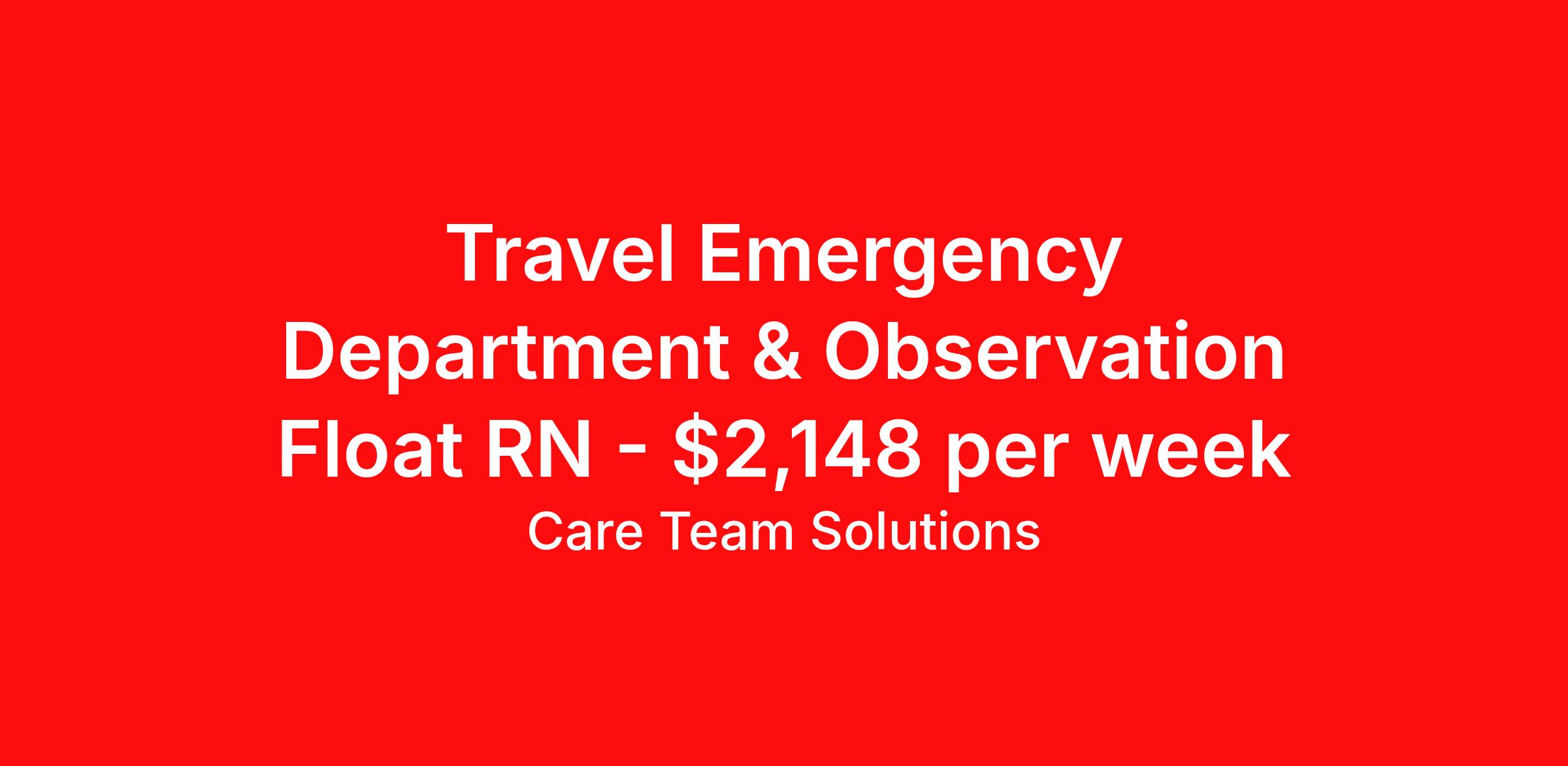 Care Team Solutions is seeking a travel nurse RN Float ED - Emergency Department Med Surg for a travel nursing job in Rochester, New York. Job Description & Requirements Specialty: ED - Emergency Department Discipline: RN Start Date: 04/13/2026 Duration: 13 weeks 36 hours per week Shift: 12 hours Employment Type: Travel Registered Nurse must have 2 years of recent experience in particular specialty Details: Must Have 2 Years of recent Emergency Room experience. Specialty: Emergency Room Discipline: Registered Nurse Start Date: 2026-04-13 Duration: 13 Weeks Shift: 12 Hours Day shift Hours Per Week: 36 Hours Employment Type: Contract Gross Weekly Pay: $2148.41 Six things that won’t happen if you apply to this job: You won’t have to guess what the downsides are. We’ll tell you up front. You won’t show up on day 1 and find out this is not what you signed up for. We won't leave your phone call ringing when it's inconvenient. Business hours for you are business hours for us. You won’t get shuffled to some customer service rep when a problem pops up. If we screw up something in securing your placement, we'll own it. That means it's on us to make it right. You won’t figure out your credentials alone. Our credentialing experts will walk you through it step by step. We've talked to thousands of travel nurses like you. We know you want good pay. You want to choose when you work. But the one thing nurse after nurse has said they want and don't have is someone in their corner. There's a lot in this business that’s messed up. We’re trying to be the people that fix it. You and every nurse with the guts to travel deserve it. We've worked hard for you to enjoy some one-of-a-kind benefits you'll not likely find anywhere else, because they benefit you more than they benefit us: Our early pay program Student loan reimbursement Free well-being tele-visits with a psychologist Care Team Solutions Job ID 587248. Pay package is based on 12 hour shifts and 36 hours per week (subject to confirmation) with tax-free stipend amount to be determined. Posted job title: SMH Level 3 RN ED Obs 1/G16 Float About Care Team Solutions Two brothers who give an enormous damn. We're Justin and Kyle. Neither of us are nurses. It doesn’t take a nurse to see that the way travel nurses are treated sucks. Nursing is already hard enough. Travel nursing takes serious guts. You get the toughest assignments in places you’ve never been. Which can be fun, but it’s also stressful. You’re in your element but outside of your hometown. You can be a stranger on the team. If anyone deserves someone in their corner, it’s you. But that’s not how most agencies operate. Which is why travel nurses hate working with them. We got into this business because we saw bucket-loads of nurses moving through the "churn and burn" travel machinery. We absolutely hate that. You'll do your best work when you have the placements you want and feel fully supported in your work. We pay our people well because we want them to treat you well. Our recruiters are amazing (we picked each of them ourselves), but if you've got a problem too big for them, they can come straight to us. We work like ten feet away. The "Churners and Burners" promise you the same benefits. They might as well copy/paste them from each other. We have them too: 401k, holiday pay, healthcare, dental, travel reimbursement, etc But we've worked hard for you to enjoy some one-of-a-kind benefits you'll not likely find anywhere else, because they benefit you more than they benefit us: Our early pay program Student loan reimbursement Free well-being tele-visits with a psychologist Benefits Weekly pay Holiday Pay Guaranteed Hours 401k retirement plan Wellness and fitness programs Referral bonus Medical benefits Dental benefits Vision benefits School loan reimbursement