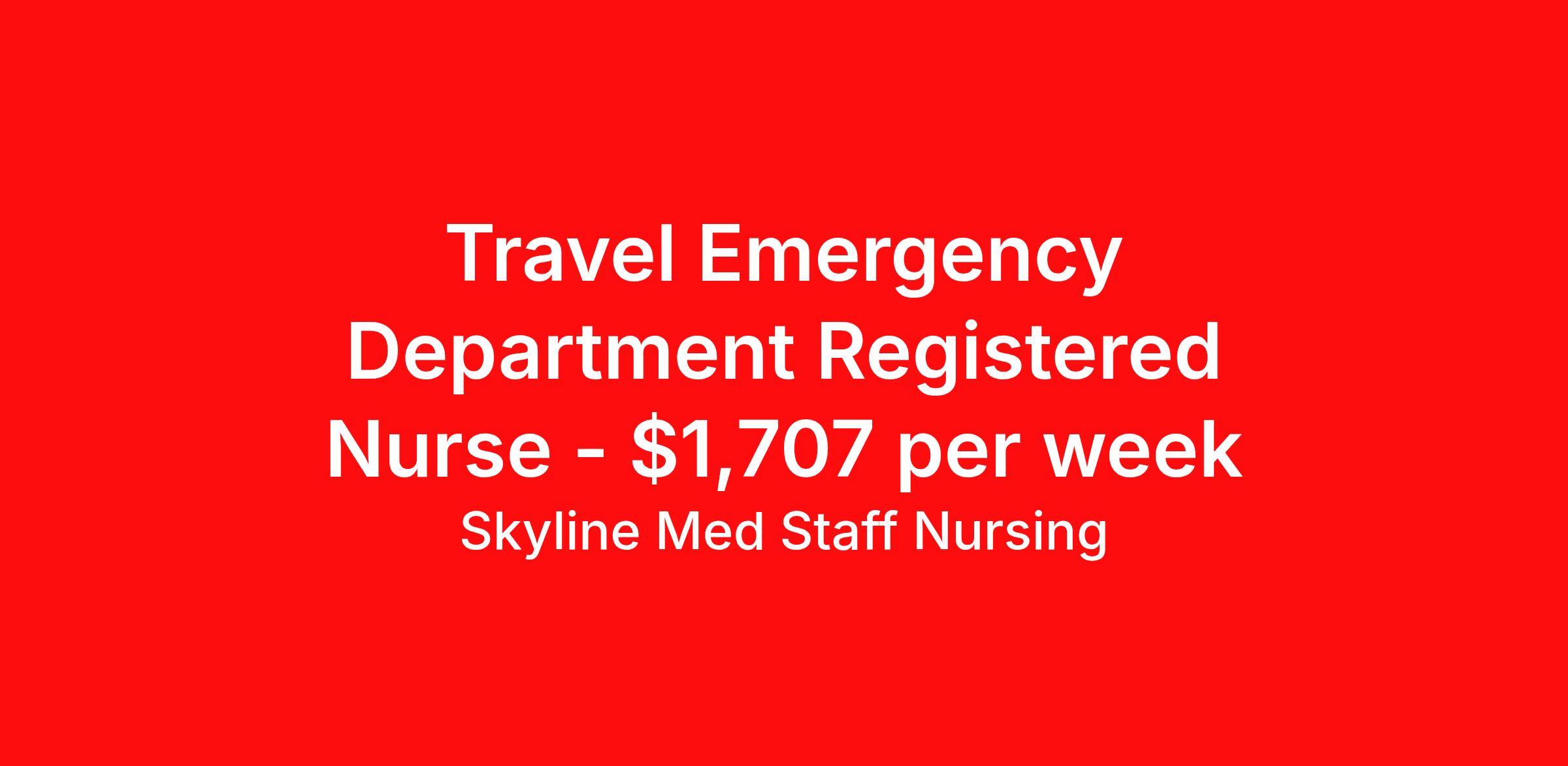 Skyline Med Staff Nursing is seeking a travel nurse RN ED - Emergency Department for a travel nursing job in Tucson, Arizona. Job Description & Requirements Specialty: ED - Emergency Department Discipline: RN Start Date: ASAP Duration: 13 weeks 36 hours per week Shift: 12 hours, nights Employment Type: Travel Weekly amount stated in job postings is an estimate based on estimated hourly wage and potential stipends available for the location of the assignment. Pay package is calculated on bill rate at the time job was posted, but can change or vary without notice. Exact pay packages might vary as this is an estimate. Our recruiter would be happy to build an exact pay package for you for each job. Skyline Med Staff Nursing Job ID 36176767. Pay package is based on 12 hour shifts and 36.0 hours per week (subject to confirmation) with tax-free stipend amount to be determined. Posted job title: RN:ER,19:00:00-07:00:00 About Skyline Med Staff Nursing Join the Top- Rated Travel Healthcare Team! Skyline Med Staff was named as the 1 Best Travel Healthcare Company in 2025 by BluePipes, a recognition driven by glowing reviews from travel healthcare professionals. Our recruiters are consistently praised on Google for their responsiveness, dedication, accessibility, and industry knowledge. Ready to experience the difference? Apply for a job today and see why healthcare professionals choose Skyline! Certified Women Owned Business We believe that travel is good for the soul. We want to be on your journey with you and find the right job that fits you Skyline Med Staff is committed to one vision treating others the way that THEY want to be treated. The executive team at Skyline Med Staff focuses on a commitment to quality, consistency, and the highest level of service. Our team members continually strive to build long term relationships that center on you and helping you achieve your goals. Some of the Benefits you will receive with Skyline Med Staff: Over 30 years of combined experience in the staffing industry Higher Take-Home Pay Rates Dedicated Personal Recruiter We are available to you 24/7 Health Insurance Plan Options Tax Free Per Diems, Housing Stipends and Travel Reimbursements Joint Commission Certified Contracts in all 50 states Referral and Loyalty Bonuses Benefits Medical benefits Referral bonus