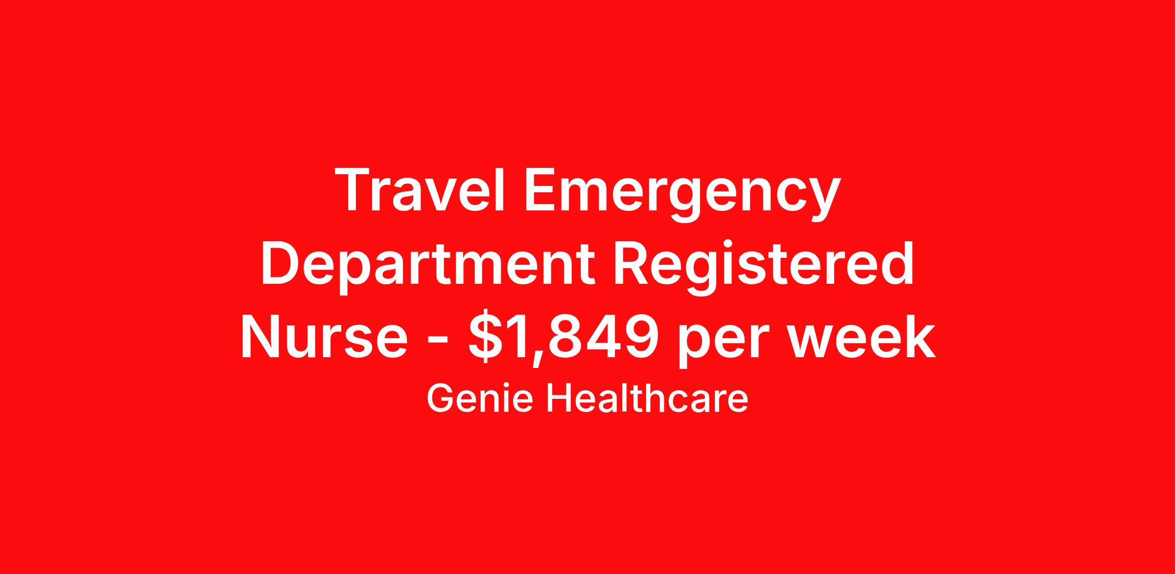 Genie Healthcare is seeking a travel nurse RN ED - Emergency Department for a travel nursing job in Longview, Texas. Job Description & Requirements Specialty: ED - Emergency Department Discipline: RN Start Date: 04/13/2026 Duration: 13 weeks 36 hours per week Shift: 12 hours, nights Employment Type: Travel Genie Healthcare is looking for a RN to work in Emergency Room (ER) for a 13 weeks travel assignment located in Longview, TX for the Shift (3x12 nights, 19:00:00-07:00:00, 12.00-3). Pay and benefits packages are estimated based on client bill rate at time the job was posted. These rates are subject to change. Exact pay and benefits vary based on several things, including, but not limited to, guaranteed hours, client changes in bill rate, experience, etc. Benefits: Medical Insurance, Dental Insurance, Vision Insurance, 401(k) with company matching (50% up to 6% of what you contribute) Genie Healthcare Job ID 17985441. Pay package is based on 12 hour shifts and 36.0 hours per week (subject to confirmation) with tax-free stipend amount to be determined. Posted job title: RN:Emergency Room (ER),19:00:00-07:00:00 About Genie Healthcare Genie Healthcare is one of the fastest growing Nurse Travel Agencies in the USA. Genie serves hundreds of facilities and has over 4000 current travel RN contracts open at any given time. Genie provides travel RN’s flexibility, support, top pay scale, housing and the 1 rated, multi-state health insurance coverage. Genie Healthcare carries with it a commitment to providing a comprehensive level of service and quality care. Growing from a small team of eager recruiters to a company with satisfied clients in nearly every corner of the nation, delivering excellence in patient and customer care is the key to Genie’s success. The management team has 20 years of experience in workforce solutions and staffing in medical and non-medical fields, roles ranging from Clerical job to Cardiologist to software developer to CEO.