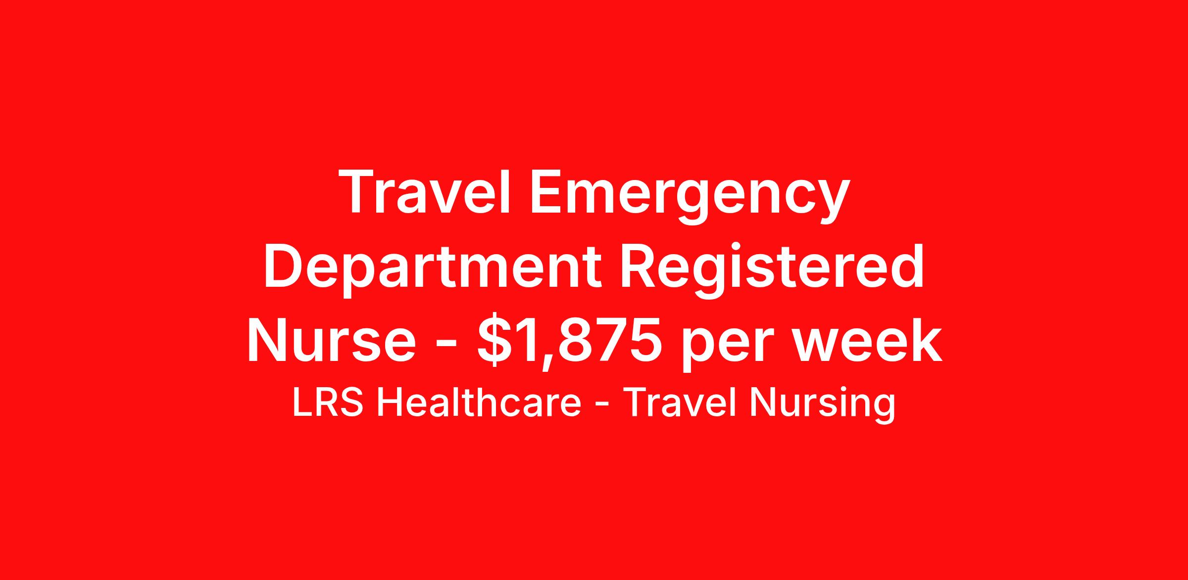 LRS Healthcare - Travel Nursing is seeking a travel nurse RN ED - Emergency Department for a travel nursing job in Farmington, New Mexico. Job Description & Requirements Specialty: ED - Emergency Department Discipline: RN Start Date: 04/06/2026 Duration: 13 weeks 36 hours per week Shift: 12 hours, evenings Employment Type: Travel LRS Healthcare - Travel Nursing Job ID 74-71810. Pay package is based on 12 hour shifts and 36 hours per week (subject to confirmation) with tax-free stipend amount to be determined. About LRS Healthcare - Travel Nursing LRS Healthcare can lend a hand to take your career to new heights and places. As an industry leader in healthcare staffing, we work to connect you with jobs at top of the line facilities in the locations you’ve always wanted to live and visit. LRS is truly a full service medical staffing agency, so we take care of everything from housing and travel expenses to your itinerary, too. We handle it all because we want to be with you throughout your journey – not just your next placement. As a medical staffing agency that fosters long relationships with their employees, we’re determined to help amplify your personal and career growth through placement. We identify both temporary and permanent positions for candidates, and even some temp-to-perm positions that begin as 13-week programs. We have many positions available across the country, so let's discuss what would be a good fit for you! Benefits: Medical, Dental, and Vision Short-Term Disability Long-Term Disability Life Insurance 401(k) Certification & License Reimbursement Refer-a-friend Bonus Program Direct Deposit - Weekly 24-Hour Support Benefits Medical benefits Life insurance 401k retirement plan License and certification reimbursement Referral bonus Weekly pay