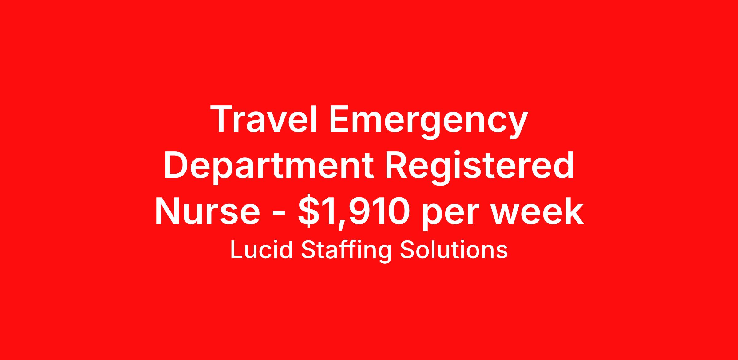Lucid Staffing Solutions is seeking a travel nurse RN ED - Emergency Department for a travel nursing job in Paris, Kentucky. Job Description & Requirements Specialty: ED - Emergency Department Discipline: RN Duration: 13 weeks 36 hours per week Shift: 12 hours, nights Employment Type: Travel Job Description Position: Travel Registered Nurse (RN) with experience in ER Location: Paris, Kentucky Shift: 12hr Night Weekly Gross: $1910.18 Lucid Staffing Solutions was created by former healthcare workers who lived the short staffing, the chaotic workflows, and the nonstop pressure that comes with patient care. We built an agency powered by real clinical experience, kept simple and supportive, so you never have to guess whether the people guiding you actually know what they’re talking about. Minimum Requirements: Active license as a Registered Nurse (RN) Licensed in Kentucky (If applicable) or compact eligible Two years of recent ER experience Active BLS Why Lucid Works for Travelers Paid Weekly: Stipends pushed to GSA limits whenever possible $500 Travel Reimbursement: Paid at the start of each assignment Clinician-Led Team: Recruiters and Account Managers with real clinical experience In-House Compliance: fast updates, real communication, and none of the delays that come with outsourced vendors. Health Coverage Options: Multiple medical plans plus dental, vision, and workers compensation 401(k) Match: 4 percent match after 6 months License & Certification Reimbursement: We help cover the cost of staying compliant Liability Insurance: Included automatically Referral Bonuses: $500 per referral, $750 after five referrals Ready to start your journey? Apply today to connect with a Clinician-Recruiter! Lucid Staffing Solutions Job ID 37728. Pay package is based on 12 hour shifts and 36 hours per week (subject to confirmation) with tax-free stipend amount to be determined. Posted job title: ER About Lucid Staffing Solutions Clinician Owned & Operated At Lucid Staffing Solutions, we do things differently—because we’ve been in your shoes. Founded by actual healthcare professionals, Lucid was built to fix the issues we experienced as travelers. We know what makes a great assignment: competitive pay, seamless onboarding, honest recruiters, and most importantly—working with a team that truly sees and supports you. Our entire team is made up of former clinicians who understand the demands of the job and what travelers truly need to succeed. We offer some of the highest paying allied health and nursing contracts across the country, along with some amazing benefits & perks. Whether you're chasing freedom, flexible schedules, bigger paychecks, or your next adventure, Lucid helps you get there—with real support, real respect , and real healthcare experts. Benefits Dental benefits Medical benefits Vision benefits