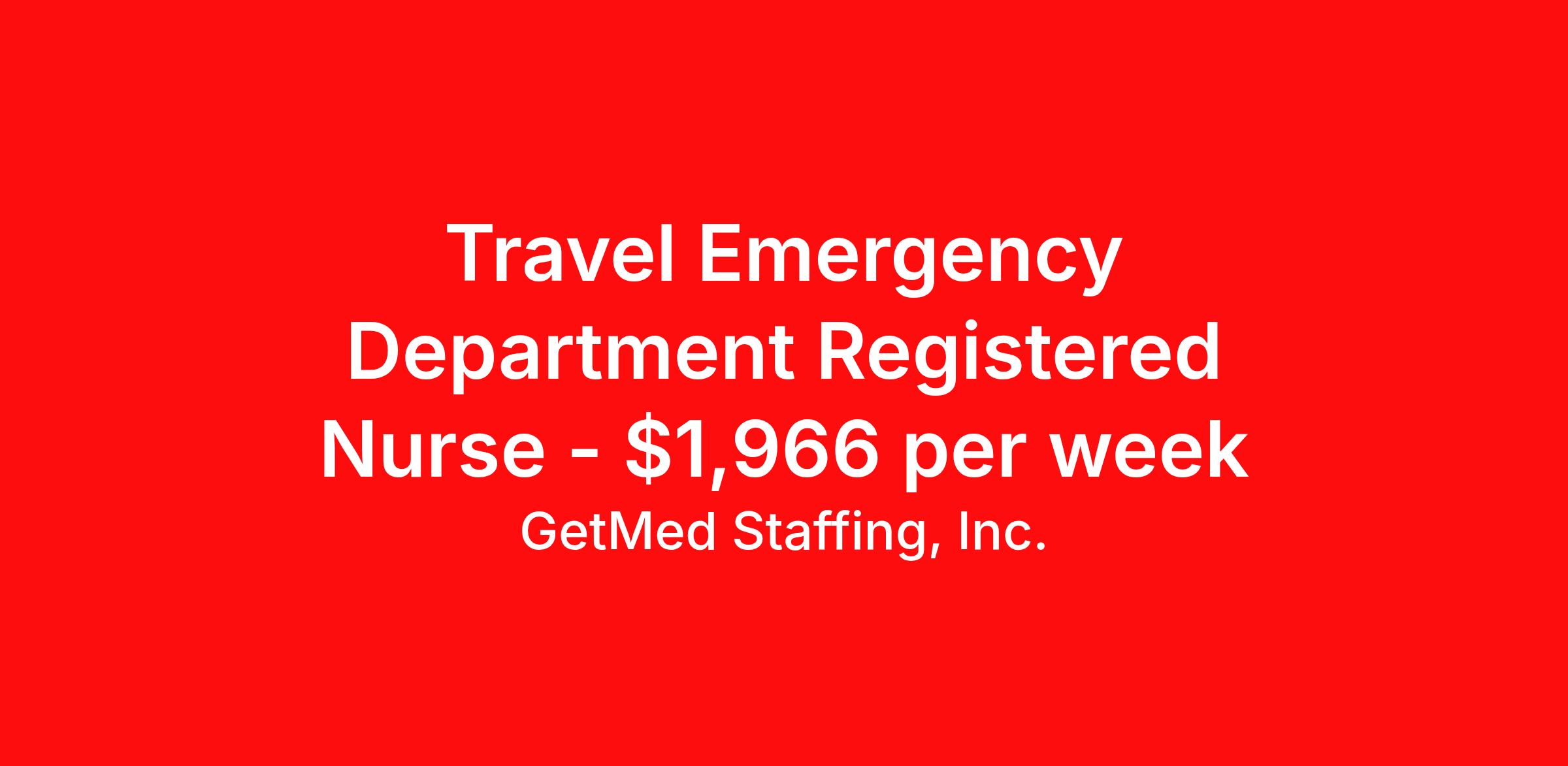 GetMed Staffing, Inc. is seeking a travel nurse RN ED - Emergency Department for a travel nursing job in Calais, Maine. Job Description & Requirements Specialty: ED - Emergency Department Discipline: RN Start Date: 03/30/2026 Duration: 4 weeks 36 hours per week Shift: 12 hours, days Employment Type: Travel GetMed Staffing is searching for a strong ER RN to assist our traveler-friendly client. A minimum of 1-2 years of experience is required. Traveling with GetMed Staffing offers the unique opportunity to gain diverse experiences, both personally and professionally. Gain experience that matters. GetMed Staffing, Inc. Job ID 36184969. Pay package is based on 12 hour shifts and 36.0 hours per week (subject to confirmation) with tax-free stipend amount to be determined. Posted job title: RN:ER,07:00:00-07:00:00 About GetMed Staffing, Inc. We are a diversity owned company, specializing in healthcare recruiting services. We truly understand how important a healthcare travelers' relationship is with their recruiter, as well as our relationship is with our healthcare facilities. We recognize that the needs of our healthcare travelers can vary, and therefore we provide the personalized touch necessary to ensure a successful travel assignment each and every time. Our healthcare facilities and clients benefit from us putting our healthcare travelers first. GetMed Staffing is excited to be a leader within the industry by focusing on providing healthcare travelers with more choices and possibilities as they plan for their next healthcare travel assignment. Benefits Life insurance Medical benefits Dental benefits Vision benefits 401k retirement plan