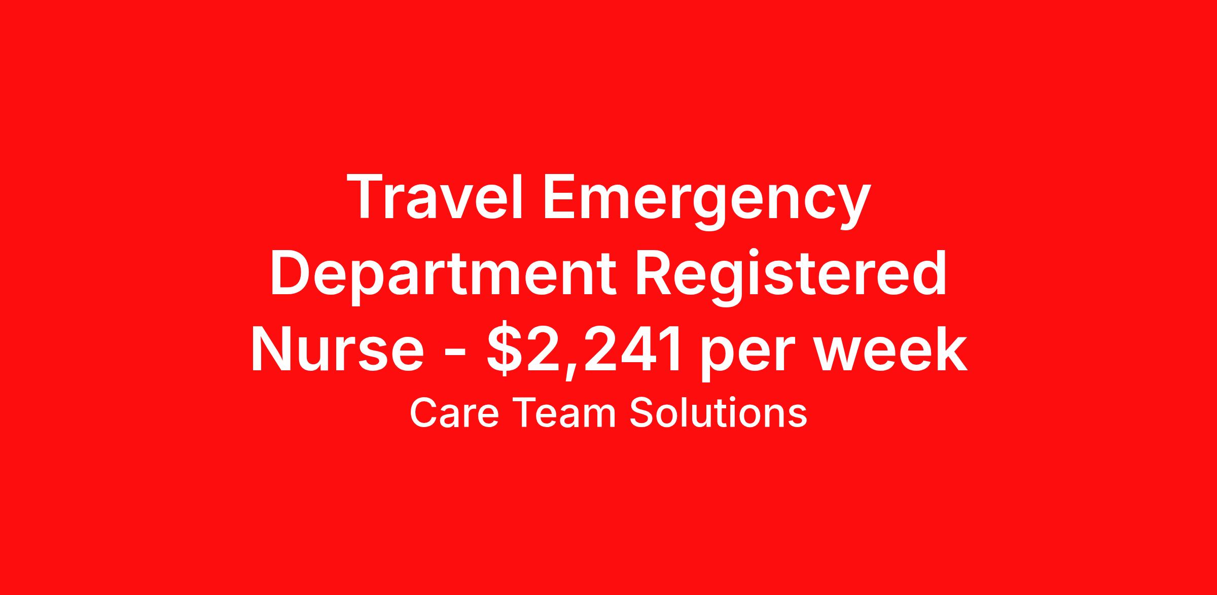 Care Team Solutions is seeking a travel nurse RN ED - Emergency Department for a travel nursing job in Utica, New York. Job Description & Requirements Specialty: ED - Emergency Department Discipline: RN Start Date: 05/11/2026 Duration: 13 weeks 36 hours per week Shift: 12 hours Employment Type: Travel Registered Nurse must have 2 years of recent experience in particular specialty Details: Must Have 2 Years of recent Emergency Room experience. Specialty: Emergency Room Discipline: Registered Nurse Start Date: 2026-05-11 Duration: 13 Weeks Shift: 12 Hours Overnight shift. Hours Per Week: 36 Hours Employment Type: Contract Gross Weekly Pay: $2240.82 Six things that won’t happen if you apply to this job: You won’t have to guess what the downsides are. We’ll tell you up front. You won’t show up on day 1 and find out this is not what you signed up for. We won't leave your phone call ringing when it's inconvenient. Business hours for you are business hours for us. You won’t get shuffled to some customer service rep when a problem pops up. If we screw up something in securing your placement, we'll own it. That means it's on us to make it right. You won’t figure out your credentials alone. Our credentialing experts will walk you through it step by step. We've talked to thousands of travel nurses like you. We know you want good pay. You want to choose when you work. But the one thing nurse after nurse has said they want and don't have is someone in their corner. There's a lot in this business that’s messed up. We’re trying to be the people that fix it. You and every nurse with the guts to travel deserve it. We've worked hard for you to enjoy some one-of-a-kind benefits you'll not likely find anywhere else, because they benefit you more than they benefit us: Our early pay program Student loan reimbursement Free well-being tele-visits with a psychologist Care Team Solutions Job ID 590533. Pay package is based on 12 hour shifts and 36 hours per week (subject to confirmation) with tax-free stipend amount to be determined. Posted job title: ER Registered Nurse About Care Team Solutions Two brothers who give an enormous damn. We're Justin and Kyle. Neither of us are nurses. It doesn’t take a nurse to see that the way travel nurses are treated sucks. Nursing is already hard enough. Travel nursing takes serious guts. You get the toughest assignments in places you’ve never been. Which can be fun, but it’s also stressful. You’re in your element but outside of your hometown. You can be a stranger on the team. If anyone deserves someone in their corner, it’s you. But that’s not how most agencies operate. Which is why travel nurses hate working with them. We got into this business because we saw bucket-loads of nurses moving through the "churn and burn" travel machinery. We absolutely hate that. You'll do your best work when you have the placements you want and feel fully supported in your work. We pay our people well because we want them to treat you well. Our recruiters are amazing (we picked each of them ourselves), but if you've got a problem too big for them, they can come straight to us. We work like ten feet away. The "Churners and Burners" promise you the same benefits. They might as well copy/paste them from each other. We have them too: 401k, holiday pay, healthcare, dental, travel reimbursement, etc But we've worked hard for you to enjoy some one-of-a-kind benefits you'll not likely find anywhere else, because they benefit you more than they benefit us: Our early pay program Student loan reimbursement Free well-being tele-visits with a psychologist Benefits Weekly pay Holiday Pay Guaranteed Hours 401k retirement plan Wellness and fitness programs Referral bonus Medical benefits Dental benefits Vision benefits School loan reimbursement