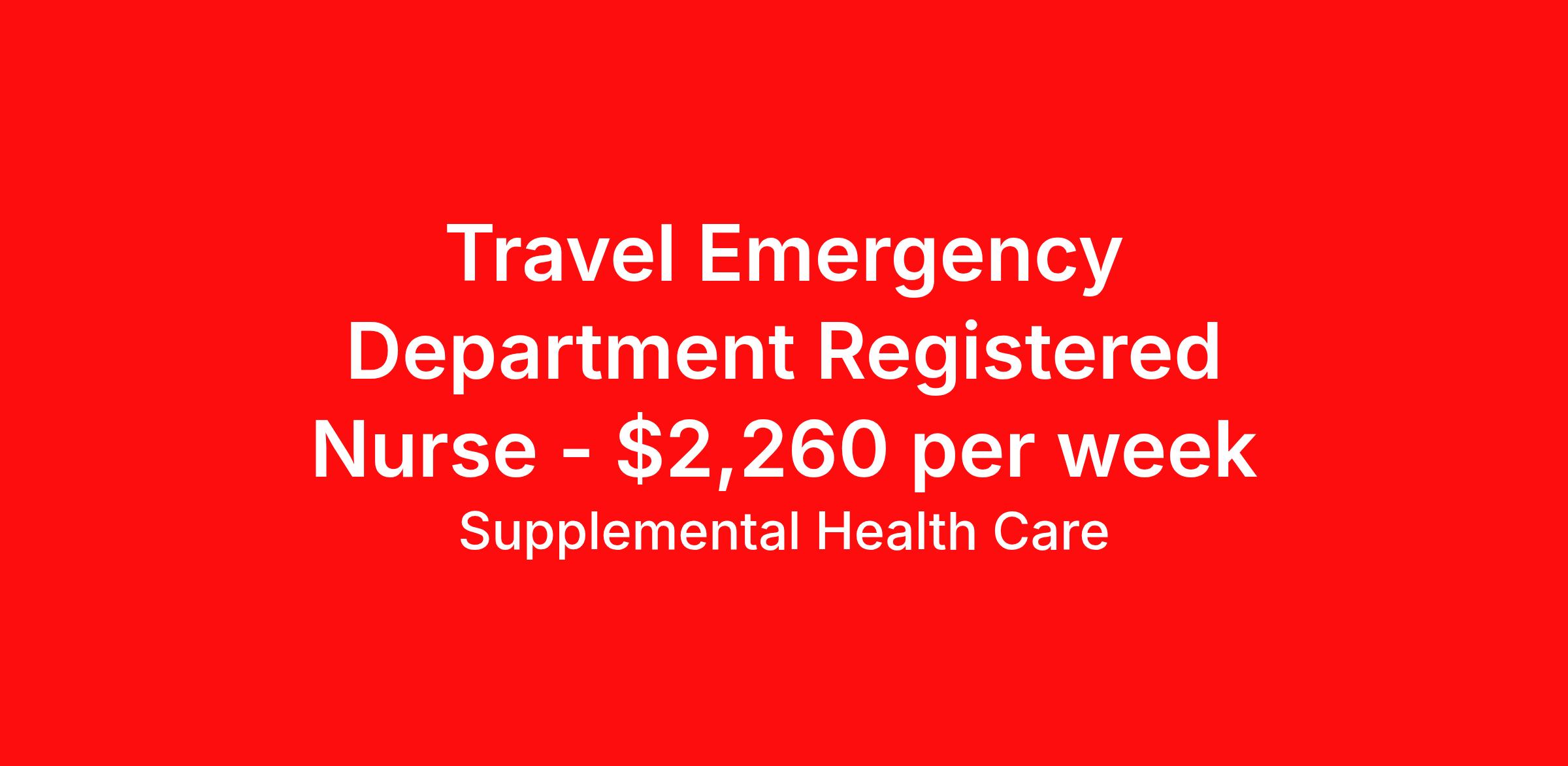 Supplemental Health Care is seeking a travel nurse RN ED - Emergency Department for a travel nursing job in Oswego, New York. Job Description & Requirements Specialty: ED - Emergency Department Discipline: RN Start Date: ASAP Duration: 13 weeks 36 hours per week Shift: 12 hours, nights Employment Type: Travel Job Description: Supplemental Health Care is hiring experienced Emergency Department / Emergency Room RNs for contract opportunities at a respected community hospital in Oswego, New York. Recognized among America’s Great Community Hospitals and ranked among the Best Hospitals for Maternity Care, this facility offers an excellent environment to grow your career. Qualifications: Active New York Registered Nurse License American Heart Association BLS 1 - 2 years of recent Emergency Department / Emergency Room experience Strong clinical and critical thinking skills Commitment to high-quality patient care Emergency Department / Emergency Room Registered Nurse Contract Details: $2,052 - $2,260 per week* 5-week contract with possibility to extend NOC shifts available Additional Details: RN would be working at a community hospital that has earned Nationally Recognized Care through the Joint Commission's Gold Seal of Approval for Hospital Accreditation This hospital has been ranked among the Best Hospitals for Maternity Care This facility is open to local and travel candidates Vibrant Area: Known as the Port City of Central New York, this location offers scenic parks, engaging museums, and a strong sense of community Come be part of a hospital that values excellence in care and supports its nurses every step of the way! Apply today, and a dedicated recruiter from Supplemental Health Care will connect with you to discuss the details and guide you through the placement process! What We Offer: Full medical, dental, vision, life, and even pet insurance! Round the clock support. No matter where you are or what time it is, Supplemental Health Care is standing by. SHC's Share the Care referral program is the most dynamic, profitable referral program in the industry. 401(k) Retirement Savings Program with a wide range of investment options. Discounted and free online access to CEU courses through Supplemental University. Please speak with a recruiter for details. Supplemental Health Care is an Equal Opportunity Employer. All candidates, including veterans and those with disabilities, are encouraged to apply. SHC will consider for employment qualified applicants with criminal histories in a manner consistent with the requirements of applicable local, state, or federal law. To learn more, visit www.shccares.com/eeo Supplemental Health Care Job ID 1472801. Pay package is based on 12 hour shifts and 36 hours per week (subject to confirmation) with tax-free stipend amount to be determined. Posted job title: Emergency Department / Emergency Room Registered Nurse About Supplemental Health Care At Supplemental Health Care, a simple belief in the power of caring guides a unique commitment to world-class service in healthcare staffing. For 40 years, we’ve supported talented professionals pursuing their life calling in hospitals, schools, home health, corrections, behavioral health, and other settings. At SHC, we inspire vital connections and enrich lives and inspire better outcomes. As recipients of the Best in Staffing Awards for both Client and Talent, Supplemental Health Care is proud to be among only 2% of staffing companies singled out for the distinction based on the real feedback of our employees and the clients we serve. SHC has also earned The Joint Commission’s Gold Seal of Approval and is named among the Largest Health Care Staffing companies in the United States by Staffing Industry Analysts. We are also thrilled to recognize our very own SLP, Dr. Kelly Byrd as the American Staffing Association 2024 National Staffing Employee of the Year and Health Care Sector All-Star. We’re honored to connect Dr. Byrd to employment, share her incredible story, and support her family literacy nonprofit. For everyone that we serve, SHC is the place where caring hearts thrive. Benefits Referral bonus Benefits start day 1 401k retirement plan Continuing Education Discount program Health savings account
