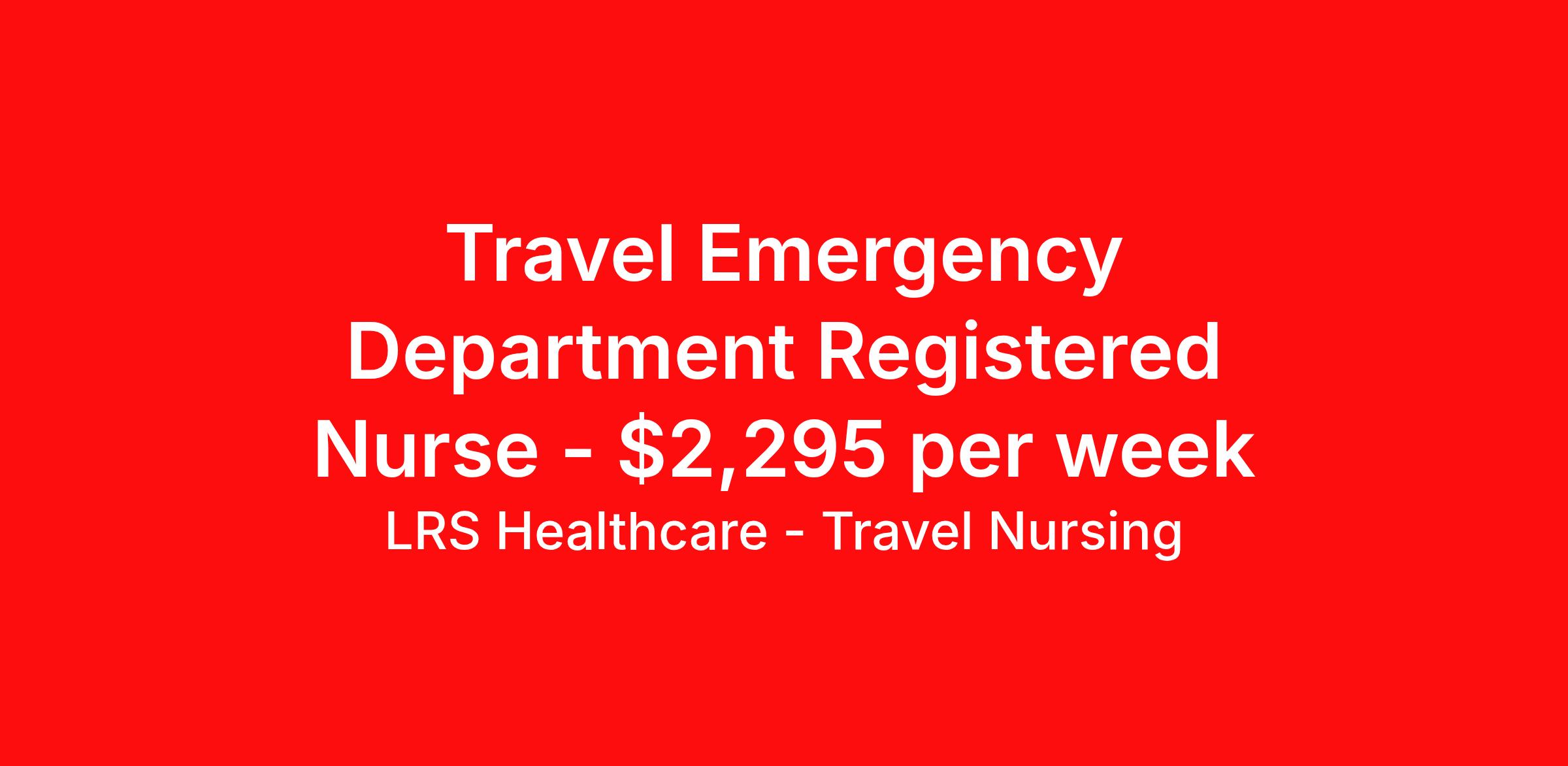 LRS Healthcare - Travel Nursing is seeking a travel nurse RN ED - Emergency Department for a travel nursing job in Urbana, Illinois. Job Description & Requirements Specialty: ED - Emergency Department Discipline: RN Start Date: 04/06/2026 Duration: 13 weeks 36 hours per week Shift: 12 hours, nights Employment Type: Travel LRS Healthcare - Travel Nursing Job ID 74-74131. Pay package is based on 12 hour shifts and 36 hours per week (subject to confirmation) with tax-free stipend amount to be determined. About LRS Healthcare - Travel Nursing LRS Healthcare can lend a hand to take your career to new heights and places. As an industry leader in healthcare staffing, we work to connect you with jobs at top of the line facilities in the locations you’ve always wanted to live and visit. LRS is truly a full service medical staffing agency, so we take care of everything from housing and travel expenses to your itinerary, too. We handle it all because we want to be with you throughout your journey – not just your next placement. As a medical staffing agency that fosters long relationships with their employees, we’re determined to help amplify your personal and career growth through placement. We identify both temporary and permanent positions for candidates, and even some temp-to-perm positions that begin as 13-week programs. We have many positions available across the country, so let's discuss what would be a good fit for you! Benefits: Medical, Dental, and Vision Short-Term Disability Long-Term Disability Life Insurance 401(k) Certification & License Reimbursement Refer-a-friend Bonus Program Direct Deposit - Weekly 24-Hour Support Benefits Medical benefits Life insurance 401k retirement plan License and certification reimbursement Referral bonus Weekly pay