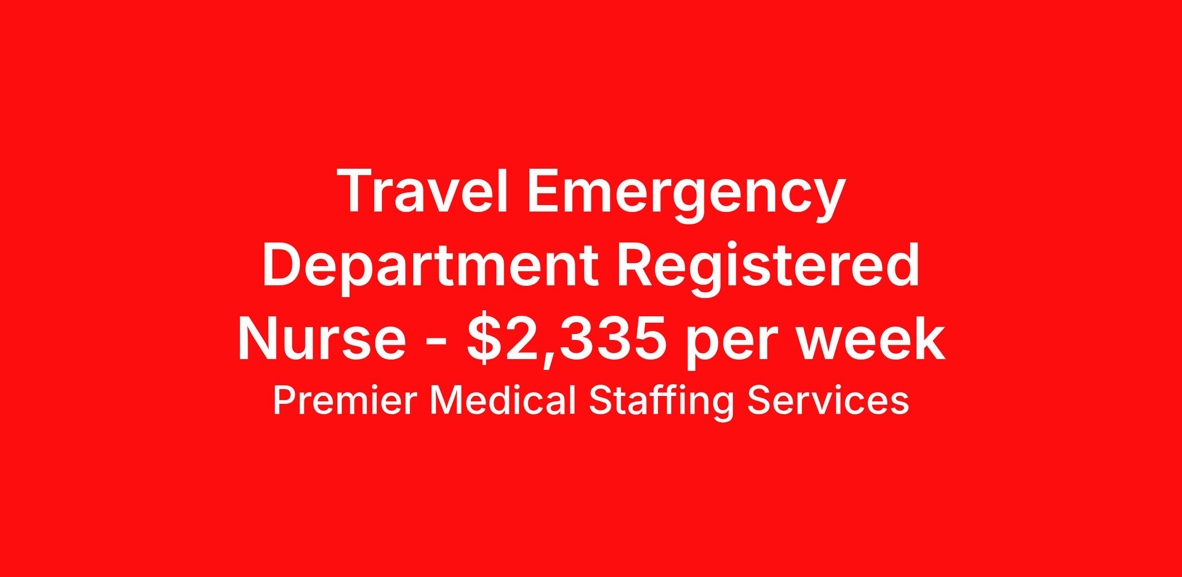 Premier Medical Staffing Services is seeking a travel nurse RN ED - Emergency Department for a travel nursing job in Deadwood, South Dakota. Job Description & Requirements Specialty: ED - Emergency Department Discipline: RN Start Date: 05/03/2026 Duration: 12 weeks 36 hours per week Shift: 12 hours Employment Type: Travel Premier Medical Staffing Job ID 626153. Pay package is based on 12 hour shifts and 36 hours per week (subject to confirmation) with tax-free stipend amount to be determined. Posted job title: RN ER About Premier Medical Staffing Services Premier Medical Staffing Services, LLC is a nationally expanding healthcare staffing firm for healthcare professionals and companies. We understand our clients’ need for highly qualified, expertly trained medical professionals and are passionate about helping clinicians find employment opportunities that fit their personality and needs. Able to accommodate the ever-changing needs of the healthcare landscape, we offer per-diem, contract and direct hire placements to support the unique needs of each industry sector. Premier Medical Staffing Services is Joint Commission Certified, a Military Spouse Employment Partner and is certified as a Women’s Business Enterprise. We are proudly nurse owned.