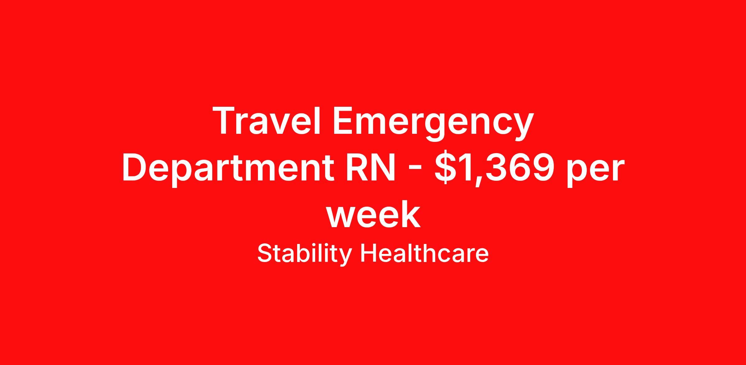 Stability Healthcare is seeking a travel nurse RN ED - Emergency Department for a travel nursing job in Vicksburg, Mississippi. Job Description & Requirements Specialty: ED - Emergency Department Discipline: RN Duration: 13 weeks 36 hours per week Shift: 12 hours, days Employment Type: Travel Stability Healthcare is looking for a ER RN contract position in Vicksburg, MS. Emergency room (ER) nurses provide care for patients requiring emergency attention because of physical trauma or acute illness. ER nurses work to quickly assess the needs of each patient to avoid long-term complications, disabilities, or even death. *$600 travel bonus *Day 1 health insurance with United Healthcare *PTO plan start accruing on day 1, use during contract or cash out at the end! *Guaranteed stipend if facility calls you off *Extra hour bonus earn an additional hourly bonus for working over your weekly contracted hours Stability Job ID 827229. Pay package is based on 12 hour shifts and 36 hours per week (subject to confirmation) with tax-free stipend amount to be determined. Posted job title: ER About Stability Healthcare Stability Healthcare was founded in 2009, with the mission of becoming the best Travel Nursing Agency in California. We have been rated one of the top travel nursing agencies and offer our nurses the highest paying travel nursing jobs available. We have access to the best travel assignments from 1000’s of facilities. You can start the year off in sunny California, spend the Spring in the Colorado Rockies, enjoy the Summer in the Mid-West, experience the change of seasons in Boston and New York, and hit the beaches of Florida in the winter. Our Nurses work in the best hospitals and health systems in the country. Benefits Guaranteed Hours Benefits start day 1