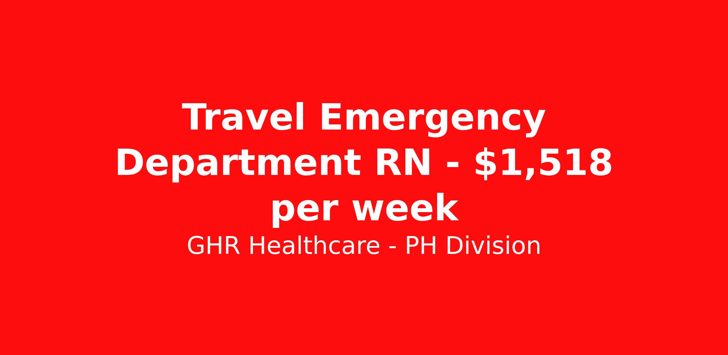 GHR Healthcare - PH Division is seeking a travel nurse RN ED - Emergency Department for a travel nursing job in Vicksburg, Mississippi. Job Description & Requirements Specialty: ED - Emergency Department Discipline: RN Start Date: 03/30/2026 Duration: 13 weeks 36 hours per week Shift: 12 hours Employment Type: Travel Planet Healthcare Job ID 76226482. Pay package is based on 12 hour shifts and 36 hours per week (subject to confirmation) with tax-free stipend amount to be determined. About GHR Healthcare - PH Division For over 30 years, GHR Healthcare has been the bridge between healthcare professionals and the facilities that need them nationwide. We're committed to uncovering your ideal fit, supported by GHR's dedication to competitive compensation, transparent communication, and a devoted team that genuinely cares about your career journey. You can trust us to stand by your side as your advocate, confidante, and partner in advancing your career. At GHR, care and consideration are at the heart of everything we do. Visit ghrhealthcare.com to learn more.