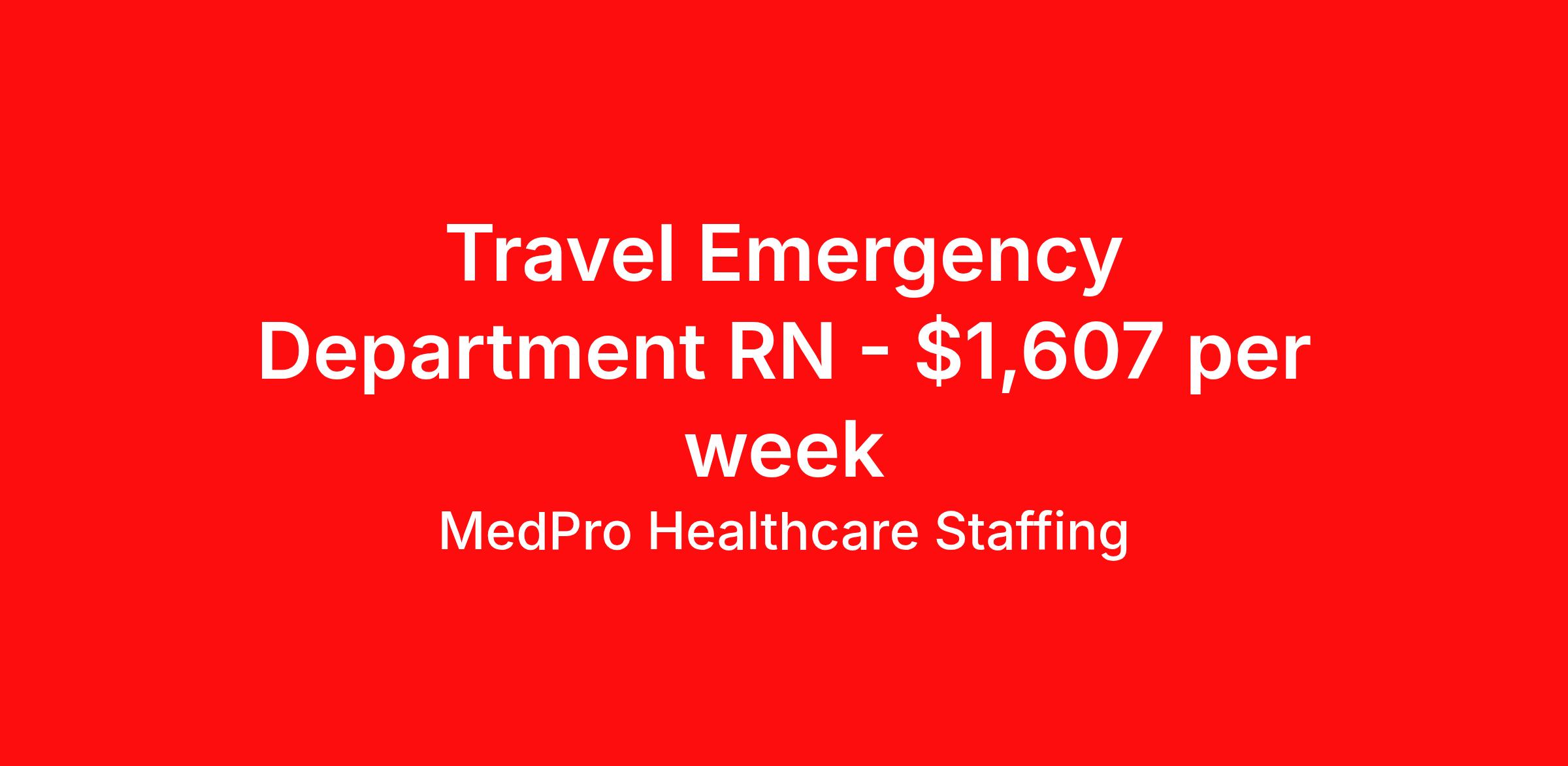 MedPro Healthcare Staffing is seeking a travel nurse RN ED - Emergency Department for a travel nursing job in San Antonio, Texas. Job Description & Requirements Specialty: ED - Emergency Department Discipline: RN Start Date: 04/06/2026 Duration: 13 weeks 36 hours per week Shift: 12 hours, nights Employment Type: Travel MedPro Healthcare Staffing , a Joint Commission-certified staffing agency, is seeking a quality Registered Nurse - Emergency Room for a travel assignment with one of our top healthcare clients. Requirements Active RN License Degree from accredited nursing program BLS, ACLS, PALS & TNCC may be required in some positions Eighteen months of recent experience in an Acute Care Emergency Room setting Other requirements to be determined by our client facility Benefits Weekly pay and direct deposit Full coverage of all credentialing fees Private housing or housing allowance Group Health insurance for you and your family Company-paid life and disability insurance Travel reimbursement 401(k) matching Unlimited Referral Bonuses up to $1,000 Duties Responsibilities Emergency Room registered nurses (RN) provide care for patients from various types of illness or trauma requiring emergency attention and must be able to recognize and effectively treat life-threatening conditions Responsible for assessing, intervening and stabilizing a variety of trauma and illnesses with decisive action. Due to the range of medical conditions that may require urgent treatment and care, they must be knowledgeable about general as well as specific health issues. Properly understand triage in order to prioritize injuries based on medical need. Able to make quick and accurate assessments about incoming patients, including both physical and mental health conditions. About Agency MedPro Healthcare Staffing is a Joint Commission certified provider of contract staffing services. Since 1983, we have placed nursing and allied travelers in top healthcare facilities nationwide. Join us today for your very own MedPro Experience®. If qualified and interested, please call for immediate consideration. MedPro Staffing is an Equal Opportunity Employer. All applicants will be considered for employment without attention to race, color, religion, national origin, age, sex, disability, marital status or veteran status. Key Words: Emergency Room Nurse, RN-ER, Emergency Room, Critical Care, Emergency Department, ACLS, EKG, Travel Nurse, Contract Nurse, Agency Nurse, Travel Contract, ER-RN, RN-ED, Emergency Room Nursing, ED Nurse, ER positions, RN-ER positions, ER Contracts, Travel Nurse *Weekly payment estimates are intended for informational purposes only and include a gross estimate of hourly wages and reimbursements for meal, incidental, and housing expenses. Your recruiter will confirm your eligibility and provide additional details. MedPro Job ID a0Fcx00000G0EszEAF. Pay package is based on 12 hour shifts and 36 hours per week (subject to confirmation) with tax-free stipend amount to be determined. Posted job title: Emergency Room Registered Nurse Nursing: Emergency Room. About MedPro Healthcare Staffing At MedPro Healthcare Staffing , we believe no one cares more for caregivers than we do. Our mission is simple: you focus on your patients, and we’ll take care of the rest. As a Joint Commission-certified leader in temporary and contract healthcare staffing since 1983, MedPro has proudly connected nursing and allied travelers with top healthcare facilities across the nation. With thousands of job opportunities available nationwide, we make it easy to find assignments that align with your goals and lifestyle. Our on-staff clinical support team—alongside a compassionate group of experienced recruiters—provides hands-on guidance every step of the way. From Day 1 medical benefits and a 401(k) plan to personalized career support, we’re committed to ensuring every professional we serve feels valued, cared for, and empowered to succeed. Guided by a CEO who is a Registered Nurse, MedPro is built on a foundation of clinical insight and genuine compassion for the caregiving community. Through The MedPro Experience® , we deliver travel assignments that are rewarding, memorable, and designed to help you DREAM big, EXPLORE often, and ACHIEVE greatness. Benefits Day 1 medical, dental, and vision benefits for you and your family Weekly pay and direct deposit Unlimited Referral Bonuses starting at $500 On Staff Clinical Support Team Access to nationwide travel assignments MPX Mobile app -24/7 real-time access to jobs, credentials, assignment details, and more Full coverage of all credentialing fees Private housing or housing allowance Tax Free Per Diems, Housing Stipends and Travel Reimbursements Company-paid life and disability insurance Travel reimbursement 401(k) matching Benefits Weekly pay Referral bonus Employee assistance programs