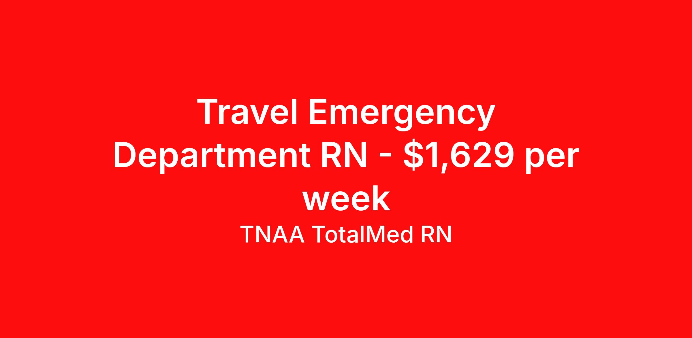 TNAA TotalMed RN is seeking a travel nurse RN ED - Emergency Department for a travel nursing job in Tuscaloosa, Alabama. Job Description & Requirements Specialty: ED - Emergency Department Discipline: RN Duration: 13 weeks 36 hours per week Shift: 12 hours, nights Employment Type: Travel We're looking for Emergency Room RNs for an immediate travel nurse opening in Tuscaloosa, AL. The right RN should have 1-2 years recent acute care experience. Read below for more requirements. As an ER Travel Nurse, you will work with a diverse team of caregivers to appropriately evaluate, triage and implement care using correct procedures and physician instructions. RNs should have experience and skill caring for patients in a fast-paced, urgent and emergency environment. Emergency Room RNs will perform minor medical operations, advise patients and family on illnesses or injuries, and plan long-term care needs. Other responsibilities as an ER Travel Nurse include documenting medical history, checking for any allergies patients might have, obtaining patient vital signs, and monitoring patients' emotional and physical well-being. As an ER Travel Nurse, you should be prepared to perform the following tasks: Provide basic bedside care. Clean and bandage wounds. Provide IV therapy. Maintain supplies and medical equipment. Report suspected abuse to appropriate agencies. ER Travel Nurses should be able to stand and walk for long periods of time, as well as bend, lean and stoop without difficulty. RNs should be able to easily lift 20 pounds. Moving or lifting of patients may require lifting of up to 50 pounds at times. Because of the fast-paced environment, Emergency Room RNs must possess good skills for coping with stress and be able to relate to people of all ages and backgrounds. Requirements*: ACLS, BLS, PALS, TNCC, NIH, 2 Years * Additional certifications may be required before beginning an assignment. TotalMed Travel Job ID 1374261. Pay package is based on 12 hour shifts and 36 hours per week (subject to confirmation) with tax-free stipend amount to be determined. Posted job title: Emergency Room - ER RN - Travel Nurse About TNAA TotalMed RN TotalMed is a Top Ten, travel nursing and healthcare staffing agency with the mission of igniting purpose in healthcare. The organization staffs nurses, therapists, pharmacists, and other clinicians of all specialties in all 50 states. They offer local and travel jobs and match caregivers with the right organization to assist both facilities and patients. As an organization, they focus on putting highly-skilled staff into facilities to ensure adequate staffing for a better patient experience. TotalMed specializes in recruiting and placing healthcare professionals in travel, PRN, and permanent positions across the country in Nursing and Allied Health. Throughout 2020, the organization filled roles at even the most short-staffed facilities during the most challenging time in healthcare. By matching the right travel healthcare professional with the right organization, TotalMed continues to offer a lifeline to facilities and their patients. Benefits Weekly pay Guaranteed Hours Continuing Education 401k retirement plan Sick pay Wellness and fitness programs Referral bonus Employee assistance programs Medical benefits Dental benefits Vision benefits Benefits start day 1