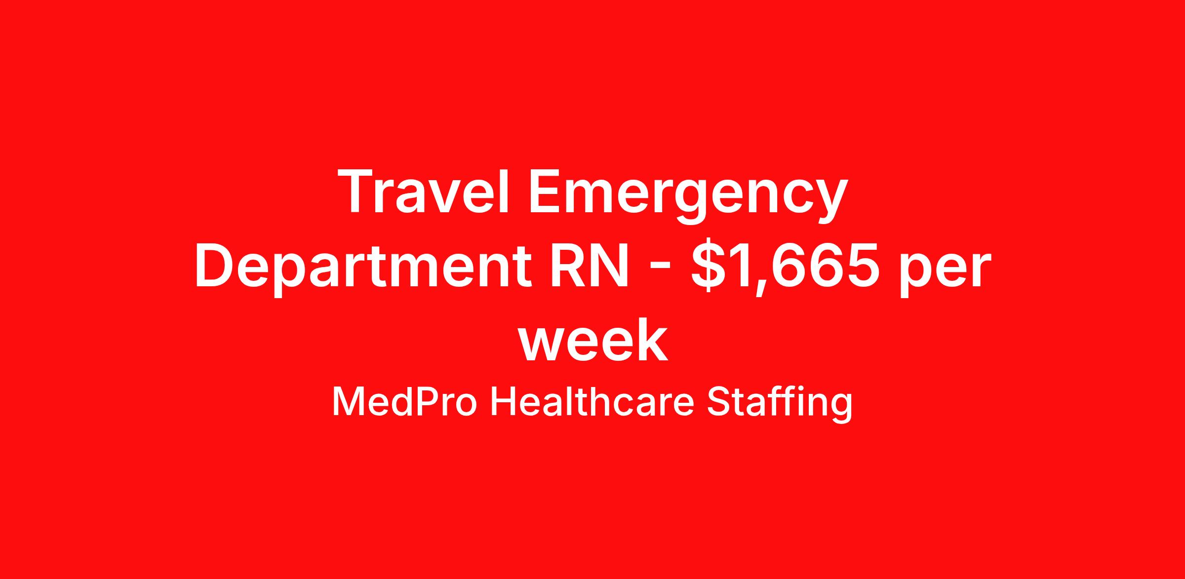 MedPro Healthcare Staffing is seeking a travel nurse RN ED - Emergency Department for a travel nursing job in Augusta, Georgia. Job Description & Requirements Specialty: ED - Emergency Department Discipline: RN Start Date: 04/13/2026 Duration: 13 weeks 36 hours per week Shift: 12 hours, days Employment Type: Travel MedPro Healthcare Staffing , a Joint Commission-certified staffing agency, is seeking a quality Registered Nurse - Emergency Room for a travel assignment with one of our top healthcare clients. Requirements Active RN License Degree from accredited nursing program BLS, ACLS, PALS & TNCC may be required in some positions Eighteen months of recent experience in an Acute Care Emergency Room setting Other requirements to be determined by our client facility Benefits Weekly pay and direct deposit Full coverage of all credentialing fees Private housing or housing allowance Group Health insurance for you and your family Company-paid life and disability insurance Travel reimbursement 401(k) matching Unlimited Referral Bonuses up to $1,000 Duties Responsibilities Emergency Room registered nurses (RN) provide care for patients from various types of illness or trauma requiring emergency attention and must be able to recognize and effectively treat life-threatening conditions Responsible for assessing, intervening and stabilizing a variety of trauma and illnesses with decisive action. Due to the range of medical conditions that may require urgent treatment and care, they must be knowledgeable about general as well as specific health issues. Properly understand triage in order to prioritize injuries based on medical need. Able to make quick and accurate assessments about incoming patients, including both physical and mental health conditions. About Agency MedPro Healthcare Staffing is a Joint Commission certified provider of contract staffing services. Since 1983, we have placed nursing and allied travelers in top healthcare facilities nationwide. Join us today for your very own MedPro Experience®. If qualified and interested, please call for immediate consideration. MedPro Staffing is an Equal Opportunity Employer. All applicants will be considered for employment without attention to race, color, religion, national origin, age, sex, disability, marital status or veteran status. Key Words: Emergency Room Nurse, RN-ER, Emergency Room, Critical Care, Emergency Department, ACLS, EKG, Travel Nurse, Contract Nurse, Agency Nurse, Travel Contract, ER-RN, RN-ED, Emergency Room Nursing, ED Nurse, ER positions, RN-ER positions, ER Contracts, Travel Nurse *Weekly payment estimates are intended for informational purposes only and include a gross estimate of hourly wages and reimbursements for meal, incidental, and housing expenses. Your recruiter will confirm your eligibility and provide additional details. MedPro Job ID a0Fcx00000GdVU9EAN. Pay package is based on 12 hour shifts and 36 hours per week (subject to confirmation) with tax-free stipend amount to be determined. Posted job title: Emergency Room Registered Nurse Nursing: Emergency Room. About MedPro Healthcare Staffing At MedPro Healthcare Staffing , we believe no one cares more for caregivers than we do. Our mission is simple: you focus on your patients, and we’ll take care of the rest. As a Joint Commission-certified leader in temporary and contract healthcare staffing since 1983, MedPro has proudly connected nursing and allied travelers with top healthcare facilities across the nation. With thousands of job opportunities available nationwide, we make it easy to find assignments that align with your goals and lifestyle. Our on-staff clinical support team—alongside a compassionate group of experienced recruiters—provides hands-on guidance every step of the way. From Day 1 medical benefits and a 401(k) plan to personalized career support, we’re committed to ensuring every professional we serve feels valued, cared for, and empowered to succeed. Guided by a CEO who is a Registered Nurse, MedPro is built on a foundation of clinical insight and genuine compassion for the caregiving community. Through The MedPro Experience® , we deliver travel assignments that are rewarding, memorable, and designed to help you DREAM big, EXPLORE often, and ACHIEVE greatness. Benefits Day 1 medical, dental, and vision benefits for you and your family Weekly pay and direct deposit Unlimited Referral Bonuses starting at $500 On Staff Clinical Support Team Access to nationwide travel assignments MPX Mobile app -24/7 real-time access to jobs, credentials, assignment details, and more Full coverage of all credentialing fees Private housing or housing allowance Tax Free Per Diems, Housing Stipends and Travel Reimbursements Company-paid life and disability insurance Travel reimbursement 401(k) matching Benefits Weekly pay Referral bonus Employee assistance programs