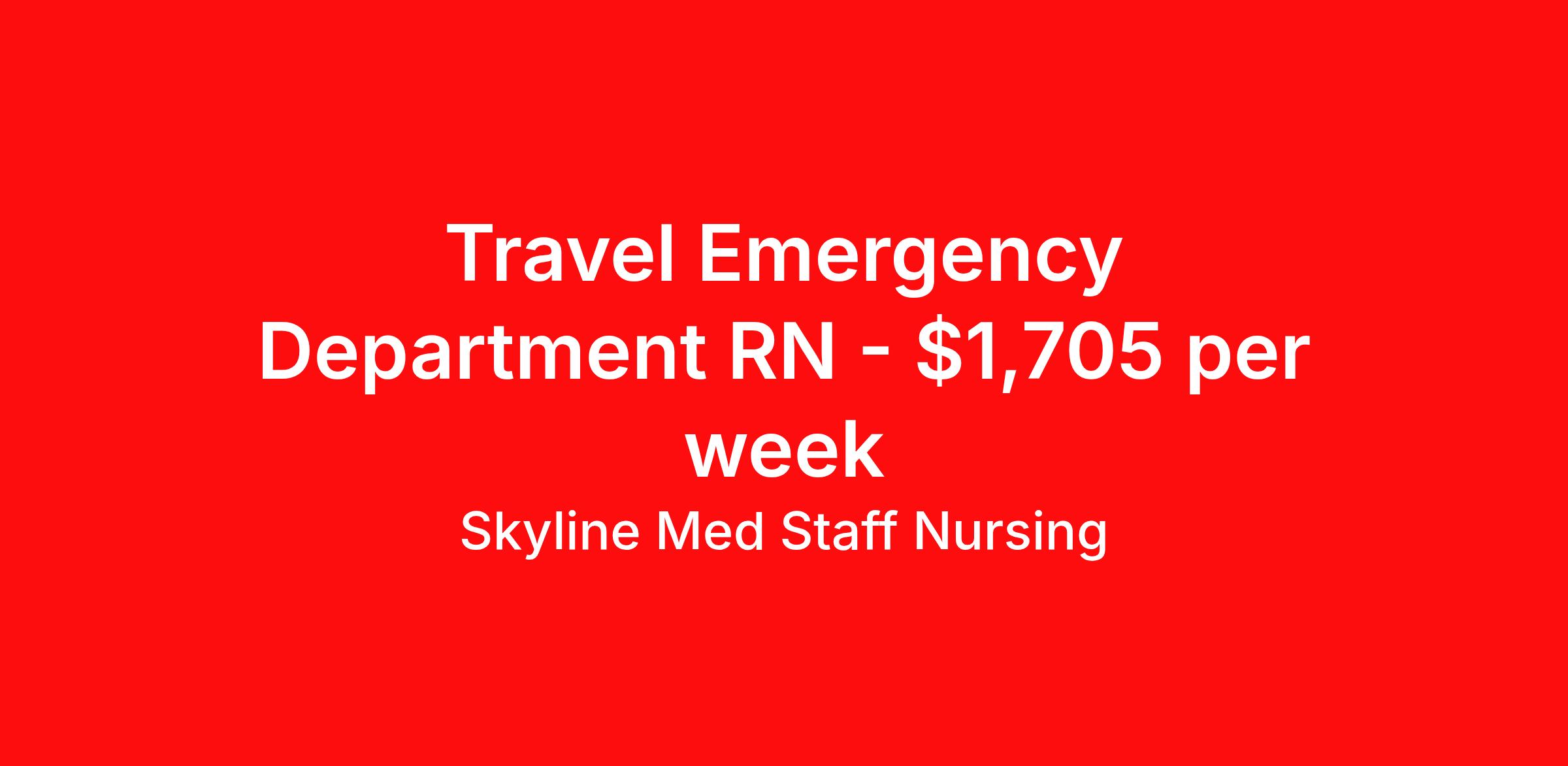 Skyline Med Staff Nursing is seeking a travel nurse RN ED - Emergency Department for a travel nursing job in Statesboro, Georgia. Job Description & Requirements Specialty: ED - Emergency Department Discipline: RN Start Date: 04/13/2026 Duration: 13 weeks 36 hours per week Shift: 12 hours, nights Employment Type: Travel Weekly amount stated in job postings is an estimate based on estimated hourly wage and potential stipends available for the location of the assignment. Pay package is calculated on bill rate at the time job was posted, but can change or vary without notice. Exact pay packages might vary as this is an estimate. Our recruiter would be happy to build an exact pay package for you for each job. Skyline Med Staff Nursing Job ID 36205466. Pay package is based on 12 hour shifts and 36.0 hours per week (subject to confirmation) with tax-free stipend amount to be determined. Posted job title: RN:ER,19:00:00-07:00:00 About Skyline Med Staff Nursing Join the Top- Rated Travel Healthcare Team! Skyline Med Staff was named as the 1 Best Travel Healthcare Company in 2025 by BluePipes, a recognition driven by glowing reviews from travel healthcare professionals. Our recruiters are consistently praised on Google for their responsiveness, dedication, accessibility, and industry knowledge. Ready to experience the difference? Apply for a job today and see why healthcare professionals choose Skyline! Certified Women Owned Business We believe that travel is good for the soul. We want to be on your journey with you and find the right job that fits you Skyline Med Staff is committed to one vision treating others the way that THEY want to be treated. The executive team at Skyline Med Staff focuses on a commitment to quality, consistency, and the highest level of service. Our team members continually strive to build long term relationships that center on you and helping you achieve your goals. Some of the Benefits you will receive with Skyline Med Staff: Over 30 years of combined experience in the staffing industry Higher Take-Home Pay Rates Dedicated Personal Recruiter We are available to you 24/7 Health Insurance Plan Options Tax Free Per Diems, Housing Stipends and Travel Reimbursements Joint Commission Certified Contracts in all 50 states Referral and Loyalty Bonuses Benefits Medical benefits Referral bonus