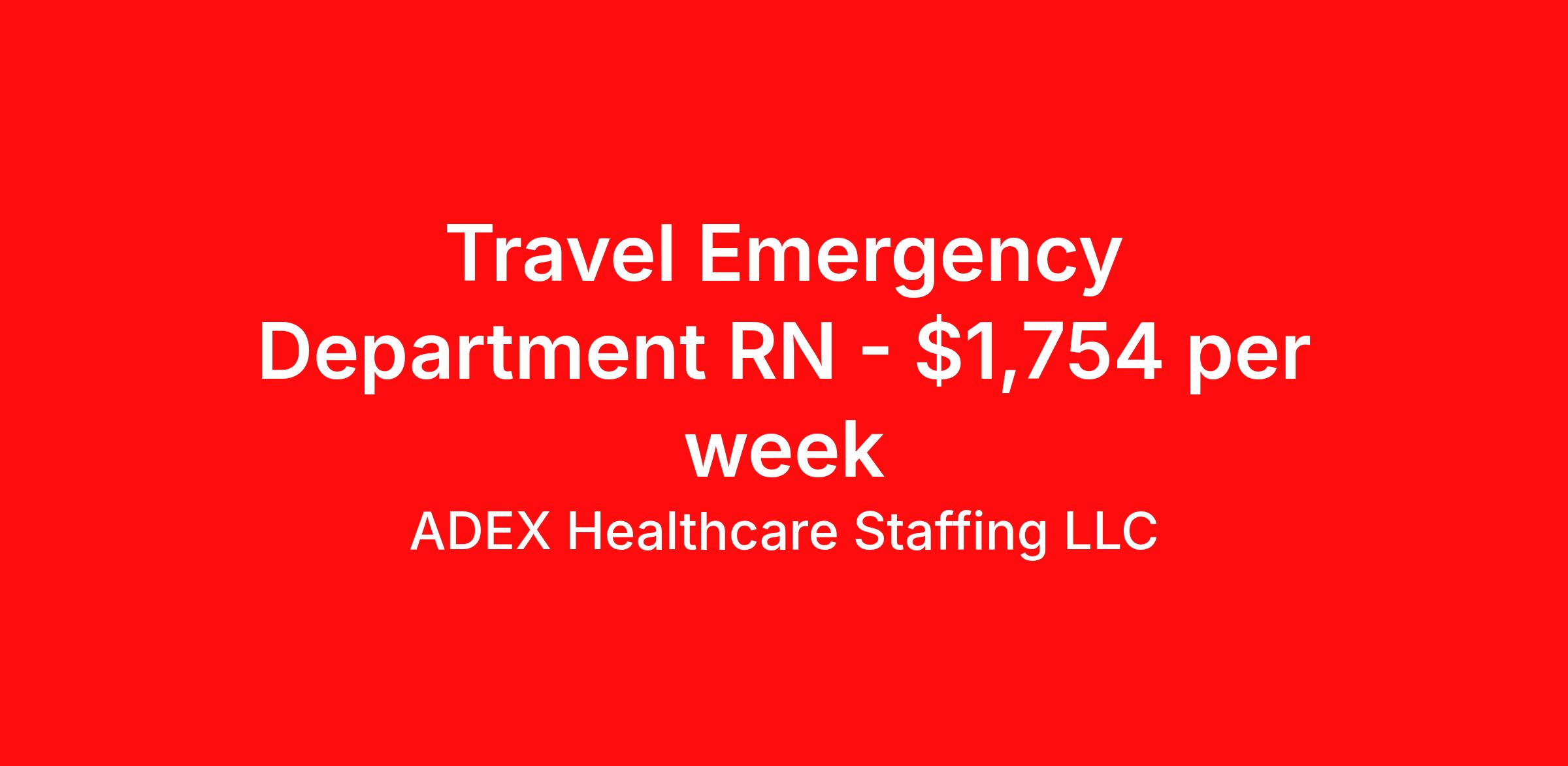 ADEX Healthcare Staffing LLC is seeking a travel nurse RN ED - Emergency Department for a travel nursing job in Atlanta, Georgia. Job Description & Requirements Specialty: ED - Emergency Department Discipline: RN Start Date: 04/13/2026 Duration: 13 weeks 36 hours per week Shift: 12 hours, nights Employment Type: Travel RN Position Job Notes: Travel or Local Registered Nurse needed for ASAP start. A minimum of 2 years of recent hospital bedside experience is required. Candidates must be able to start within 5 weeks. Opportunity for extension upon successful completion of the initial assignment. $750 referral bonus available. Opportunity: RN - ED Job Details: • Work 12-hour night shifts from 7:00 PM to 7:00 AM • Variable schedule over 13-week assignment • Minimum 2 years of experience within emergency department specialty required • Required certifications: BLS, NIHSS, PALS, ACLS • No local candidates within 50 miles will be considered • Work in 678A Emergency Services department • Provide emergency nursing care for patients with varying acuity levels • Must be able to work independently and as part of emergency department team Facility: This healthcare facility operates a comprehensive emergency services department that provides critical care to patients requiring immediate medical attention. The facility maintains high standards for emergency nursing care and requires experienced professionals to join their emergency services team. The organization is committed to delivering quality patient care in a fast-paced emergency environment. Location: Atlanta, GA Atlanta offers an exciting metropolitan lifestyle with diverse cultural attractions, professional sports teams, and excellent dining and entertainment options. The city provides numerous career advancement opportunities in healthcare while offering a vibrant urban environment with mild climate year-round. Adex Job ID 126548. Pay package is based on 12 hour shifts and 36 hours per week (subject to confirmation) with tax-free stipend amount to be determined. About ADEX Healthcare Staffing LLC ADEX has been placing healthcare professionals across the US since 2004. Originally founded in Atlanta, GA, the company's headquarters are now located in Tampa, FL. JCAHO certified since 2009. Benefits Referral bonus