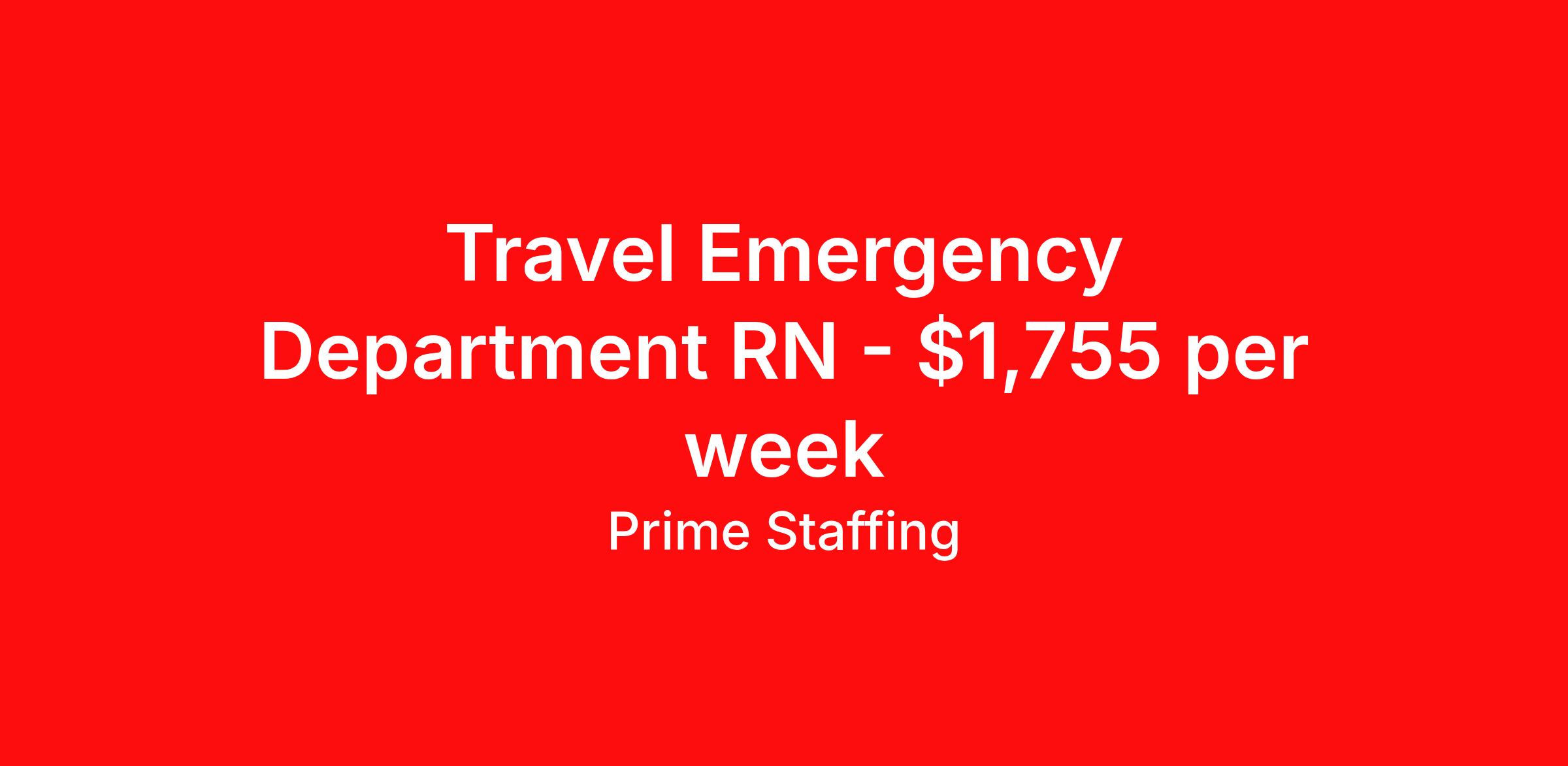 Prime Staffing is seeking a travel nurse RN ED - Emergency Department for a travel nursing job in San Marcos, Texas. Job Description & Requirements Specialty: ED - Emergency Department Discipline: RN Start Date: 04/13/2026 Duration: 13 weeks 36 hours per week Shift: 12 hours Employment Type: Travel About the Position Specialty: Registered Nurse – Emergency Department (ED) Experience: Minimum 2 years of recent ED experience required License: Active state or Compact RN License Certifications: BLS, ACLS, PALS – must include expiration dates Must-Have: All time-off requests must be submitted with the initial application Description: We are seeking a skilled Emergency Department RN to provide high-quality, efficient care in a fast-paced environment. Responsibilities include triaging patients, responding to emergencies, administering medications, and collaborating with the healthcare team to stabilize and treat critically ill or injured patients. This is a 12-hour shift role with rotating weekends, holidays, and call requirements. Candidates may be asked to float within the facility based on department needs. Onboarding typically takes 4–6 weeks . Requirements Required for Onboarding: Active RN License BLS, ACLS, PALS Prime Staffing Job ID 36204915. Pay package is based on 12 hour shifts and 36.0 hours per week (subject to confirmation) with tax-free stipend amount to be determined. Posted job title: RN:Emergency Department (ER/ED),19:00:00-07:30:00 About Prime Staffing At Prime Staffing, we understand the importance of finding the perfect fit for both our clients and candidates. Prime Staffing utilizes a unique matchmaking approach, providing the most qualified contingent staffing to our clients, and the most competitive contracts to our workforce. Our experienced team takes the time to get to know both our clients and candidates, their needs, and preferences, to ensure that each placement is a success. We offer a wide range of staffing services including temporary, temp-to-perm, and direct hire placements. Our extensive network of qualified candidates includes nurses, allied healthcare professionals, corporate support professionals and executives.