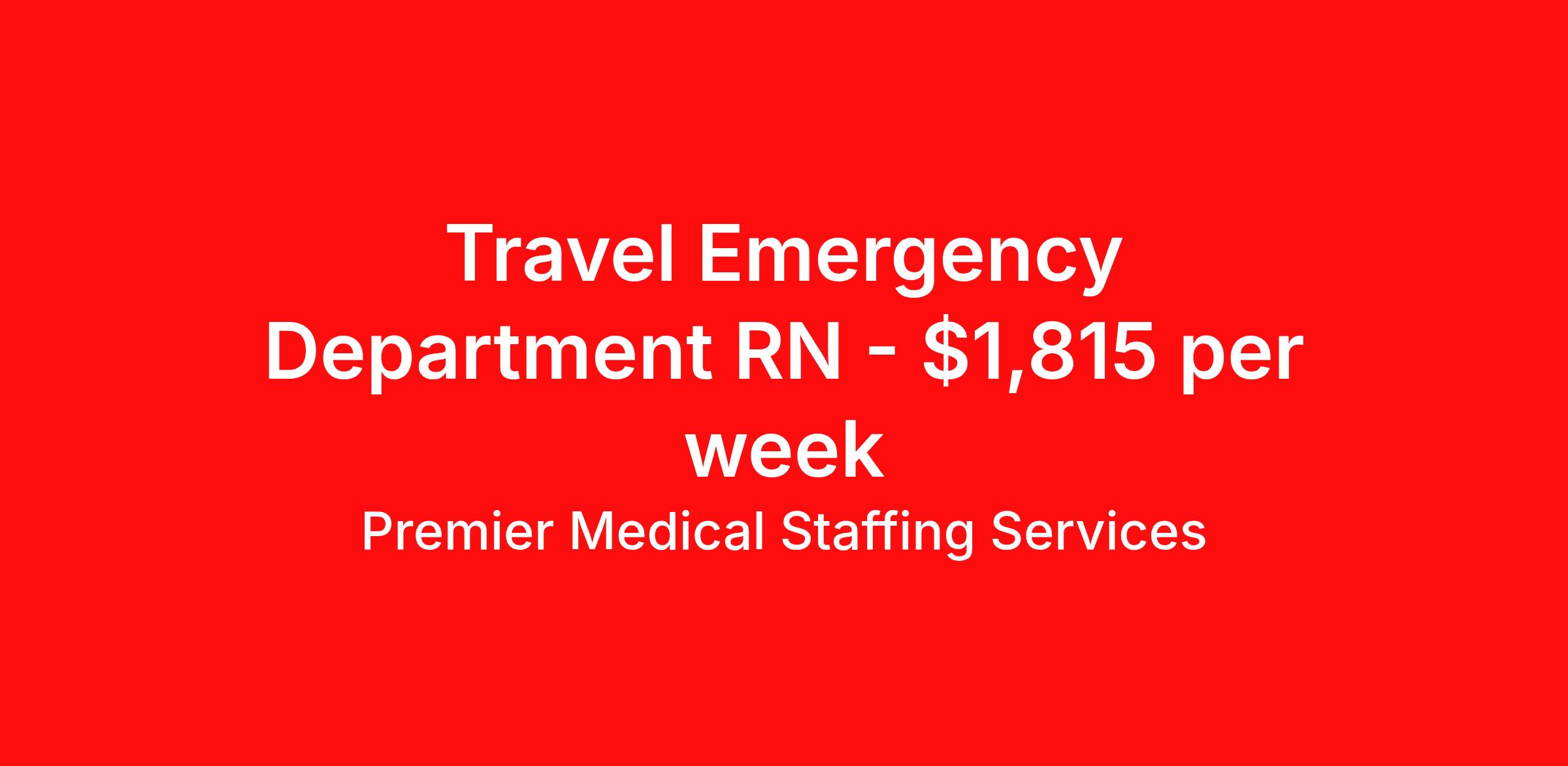 Premier Medical Staffing Services is seeking a travel nurse RN ED - Emergency Department for a travel nursing job in Gallatin, Tennessee. Job Description & Requirements Specialty: ED - Emergency Department Discipline: RN Start Date: 03/30/2026 Duration: 13 weeks 36 hours per week Shift: 12 hours Employment Type: Travel Premier Medical Staffing Job ID 626434. Pay package is based on 12 hour shifts and 36 hours per week (subject to confirmation) with tax-free stipend amount to be determined. Posted job title: RN ER About Premier Medical Staffing Services Premier Medical Staffing Services, LLC is a nationally expanding healthcare staffing firm for healthcare professionals and companies. We understand our clients’ need for highly qualified, expertly trained medical professionals and are passionate about helping clinicians find employment opportunities that fit their personality and needs. Able to accommodate the ever-changing needs of the healthcare landscape, we offer per-diem, contract and direct hire placements to support the unique needs of each industry sector. Premier Medical Staffing Services is Joint Commission Certified, a Military Spouse Employment Partner and is certified as a Women’s Business Enterprise. We are proudly nurse owned.