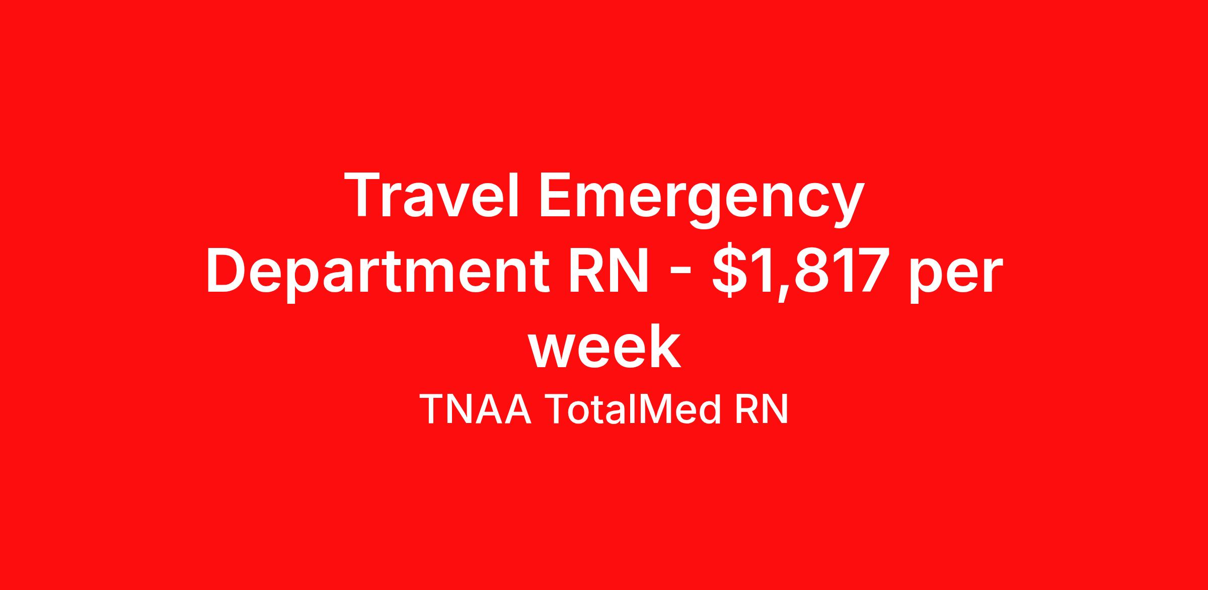 TNAA TotalMed RN is seeking a travel nurse RN ED - Emergency Department for a travel nursing job in Santa Fe, New Mexico. Job Description & Requirements Specialty: ED - Emergency Department Discipline: RN Start Date: 04/20/2026 Duration: 13 weeks 36 hours per week Shift: 12 hours, nights Employment Type: Travel We're looking for Emergency Room RNs for an immediate travel nurse opening in Santa Fe, NM. The right RN should have 1-2 years recent acute care experience. Read below for more requirements. As an ER Travel Nurse, you will work with a diverse team of caregivers to appropriately evaluate, triage and implement care using correct procedures and physician instructions. RNs should have experience and skill caring for patients in a fast-paced, urgent and emergency environment. Emergency Room RNs will perform minor medical operations, advise patients and family on illnesses or injuries, and plan long-term care needs. Other responsibilities as an ER Travel Nurse include documenting medical history, checking for any allergies patients might have, obtaining patient vital signs, and monitoring patients' emotional and physical well-being. As an ER Travel Nurse, you should be prepared to perform the following tasks: Provide basic bedside care. Clean and bandage wounds. Provide IV therapy. Maintain supplies and medical equipment. Report suspected abuse to appropriate agencies. ER Travel Nurses should be able to stand and walk for long periods of time, as well as bend, lean and stoop without difficulty. RNs should be able to easily lift 20 pounds. Moving or lifting of patients may require lifting of up to 50 pounds at times. Because of the fast-paced environment, Emergency Room RNs must possess good skills for coping with stress and be able to relate to people of all ages and backgrounds. Requirements*: ACLS, BLS, TNCC, PALS, 2 Years * Additional certifications may be required before beginning an assignment. TotalMed Travel Job ID 1389329. Pay package is based on 12 hour shifts and 36 hours per week (subject to confirmation) with tax-free stipend amount to be determined. Posted job title: Emergency Room - ER RN - Travel Nurse About TNAA TotalMed RN TotalMed is a Top Ten, travel nursing and healthcare staffing agency with the mission of igniting purpose in healthcare. The organization staffs nurses, therapists, pharmacists, and other clinicians of all specialties in all 50 states. They offer local and travel jobs and match caregivers with the right organization to assist both facilities and patients. As an organization, they focus on putting highly-skilled staff into facilities to ensure adequate staffing for a better patient experience. TotalMed specializes in recruiting and placing healthcare professionals in travel, PRN, and permanent positions across the country in Nursing and Allied Health. Throughout 2020, the organization filled roles at even the most short-staffed facilities during the most challenging time in healthcare. By matching the right travel healthcare professional with the right organization, TotalMed continues to offer a lifeline to facilities and their patients. Benefits Weekly pay Guaranteed Hours Continuing Education 401k retirement plan Sick pay Wellness and fitness programs Referral bonus Employee assistance programs Medical benefits Dental benefits Vision benefits Benefits start day 1